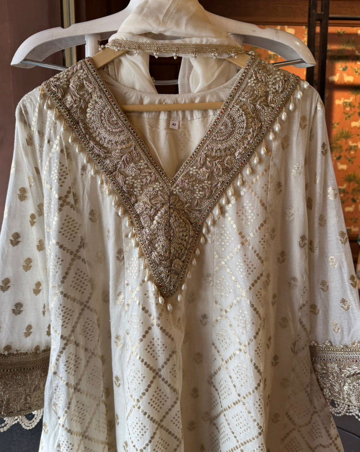 Mul chanderi soft gharara with Gold Zari embroidered  border with bead lace.