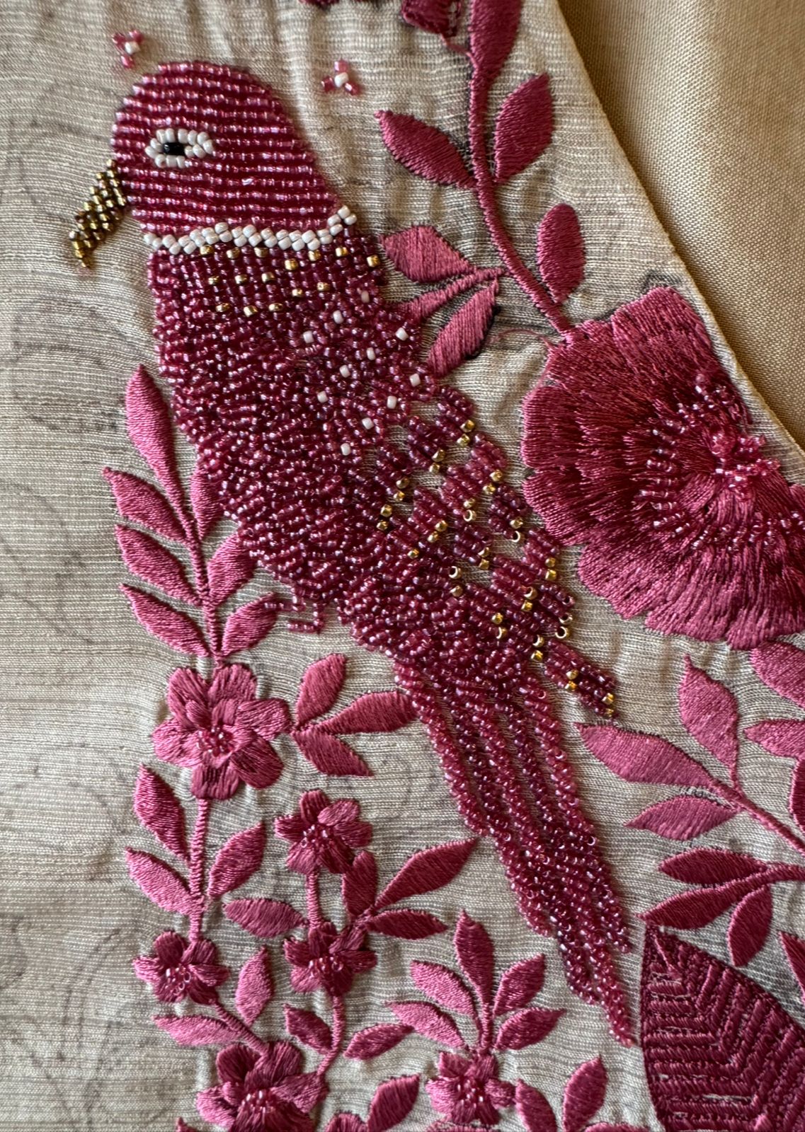 The neckline area is heavily adorned with thread embroidery in floral motifs, including a bird motif.