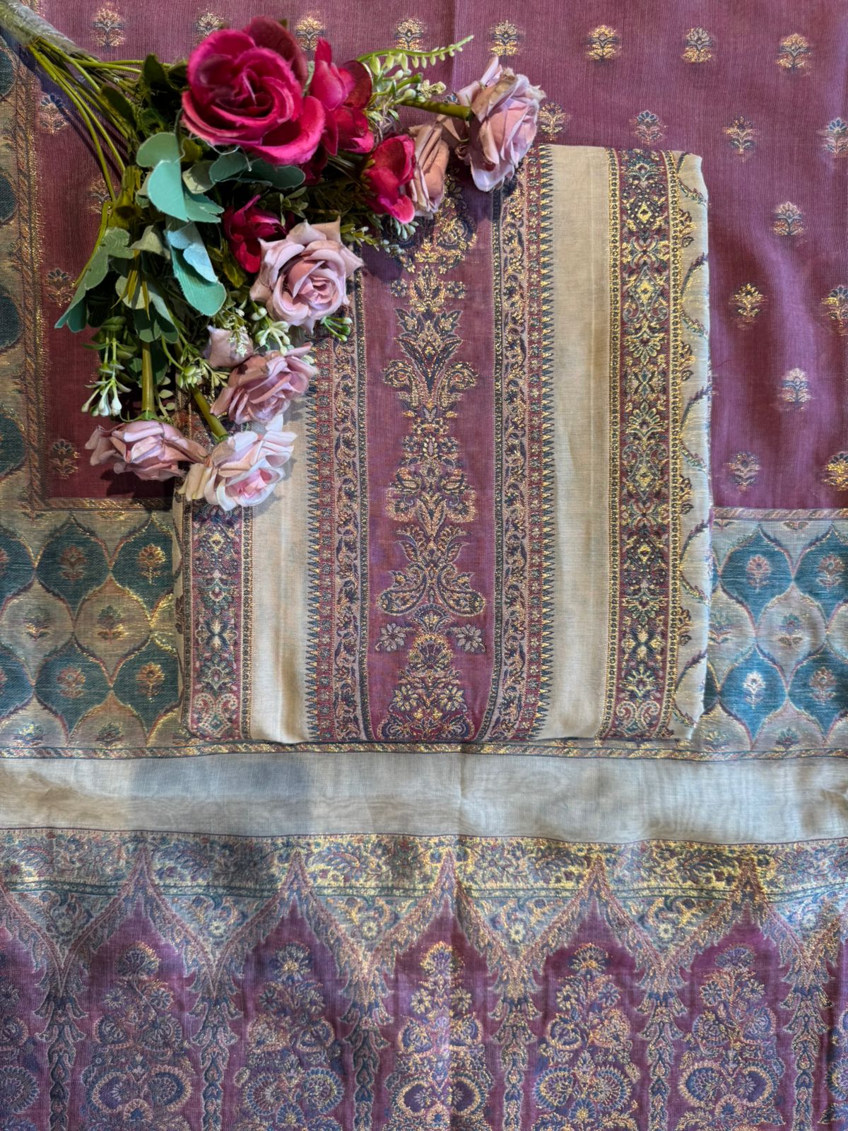 Very traditional, regal, and symmetrical. It combines woven pashmina-like motifs with multi-panel design, giving it a rich, heritage aesthetic.