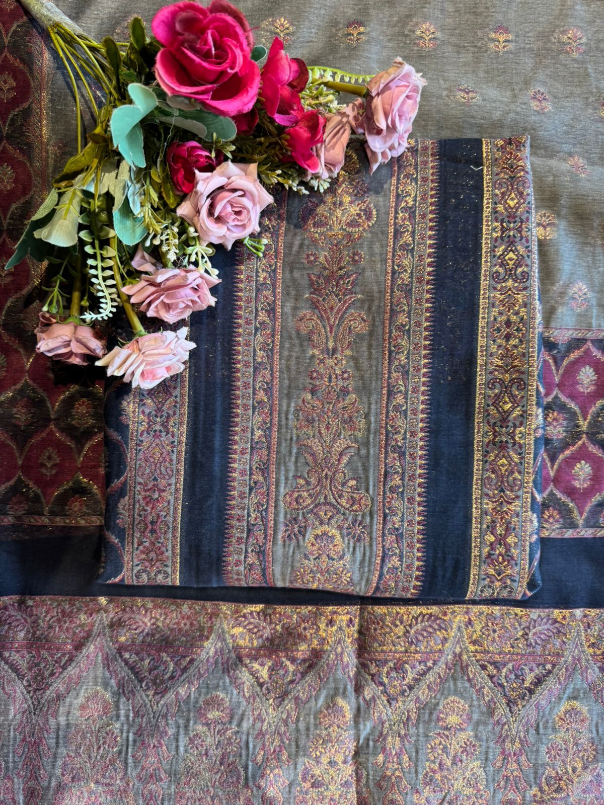 Very traditional, regal, and symmetrical. It combines woven pashmina-like motifs with multi-panel design, giving it a rich, heritage aesthetic.
