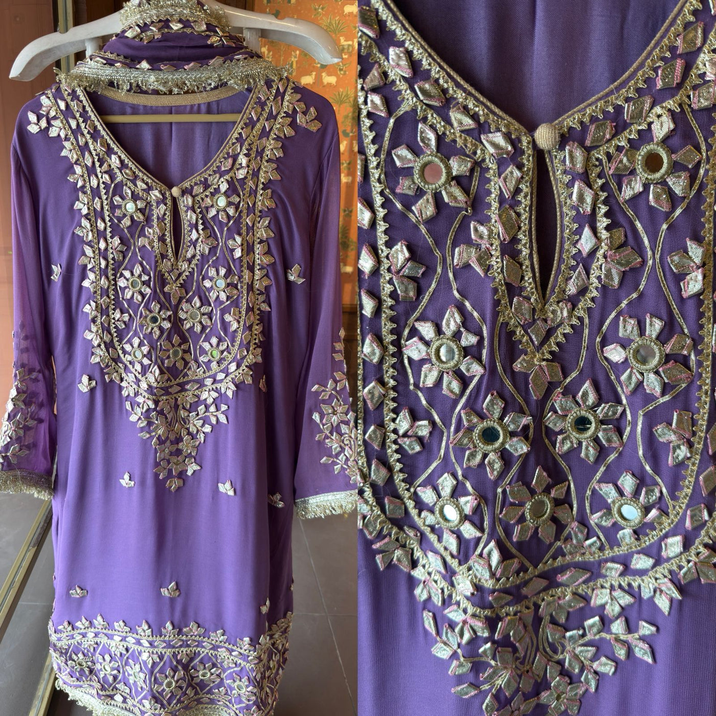 Dense floral and leaf motifs beautifully made with gotta laces and highlighted with mirrors.