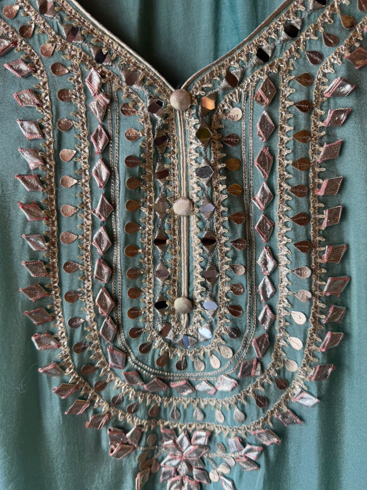 It has A beautiful Long and a very heavy neckline Which is mirror and gotta embellished