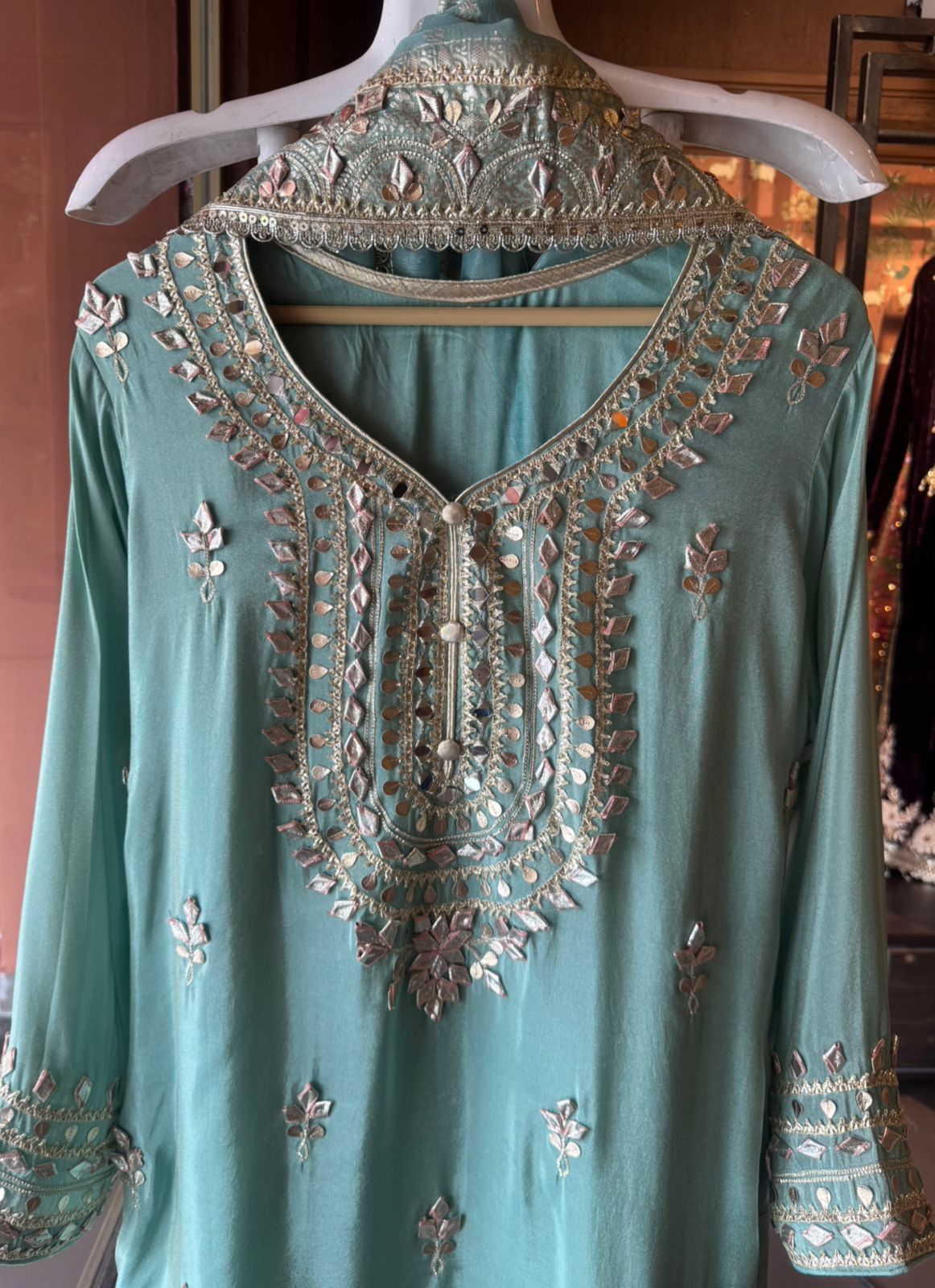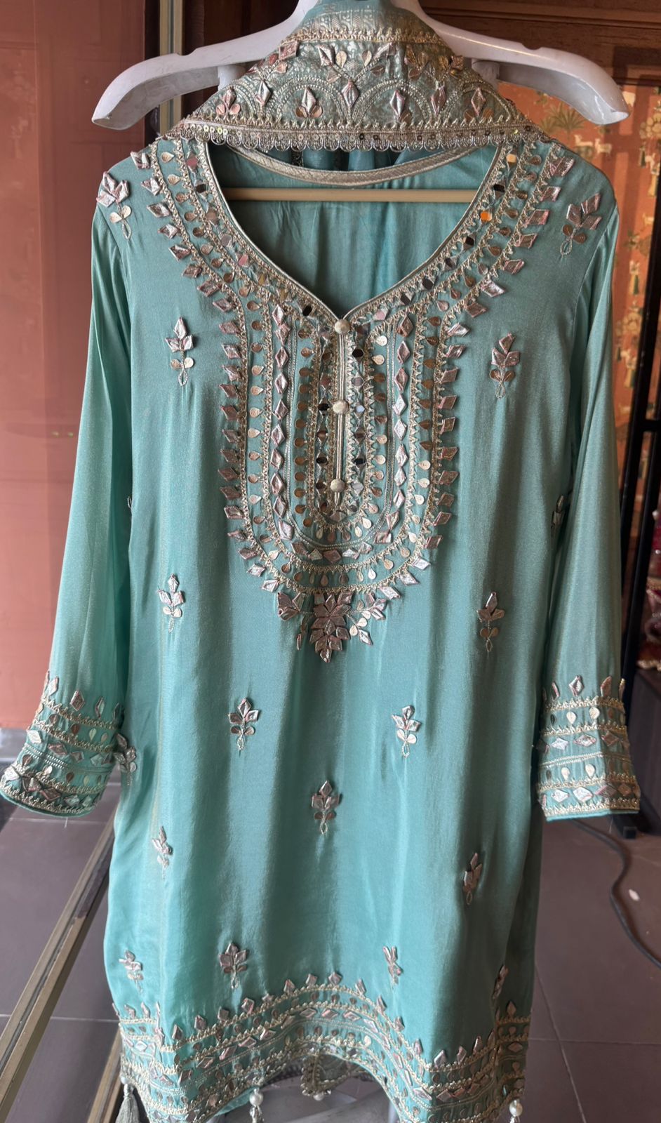 Pure Shimmer tissue stitched Skirt sets with very beautiful Gotta Patti neckline with mirror embellished with Dori and Zari embroideries,