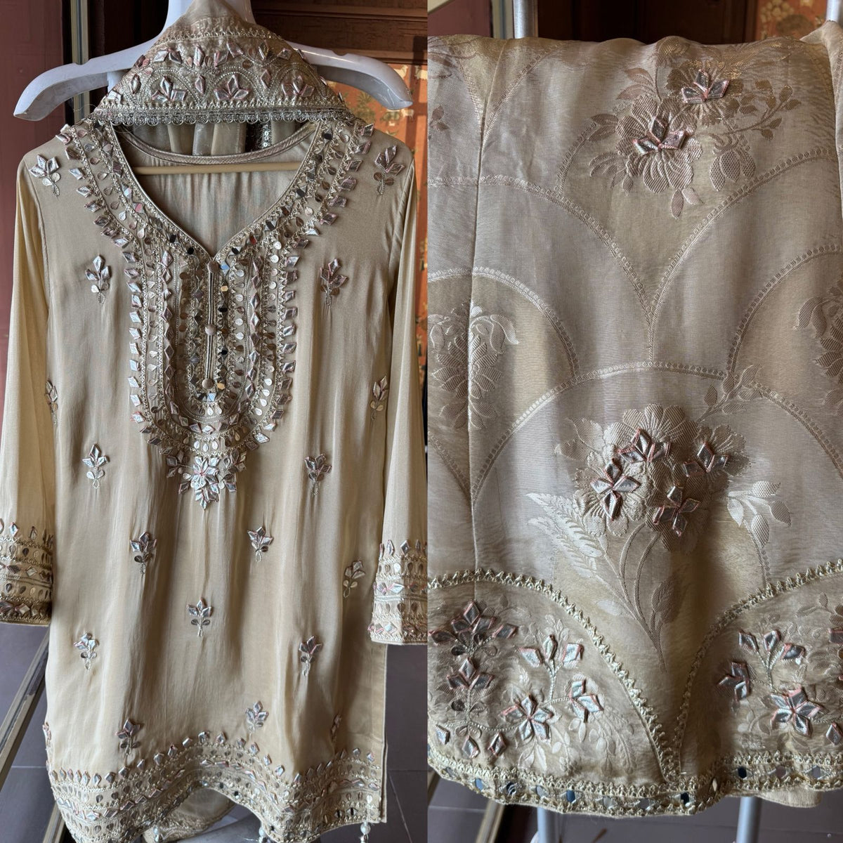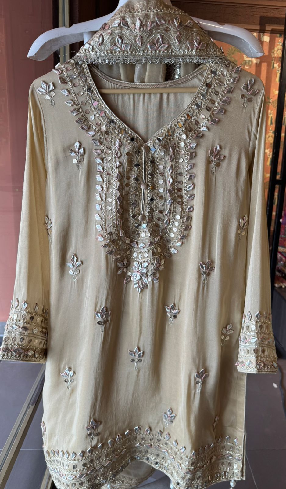 Pure Shimmer tissue stitched Skirt sets with very beautiful Gotta Patti neckline with mirror embellished with Dori and Zari embroideries,