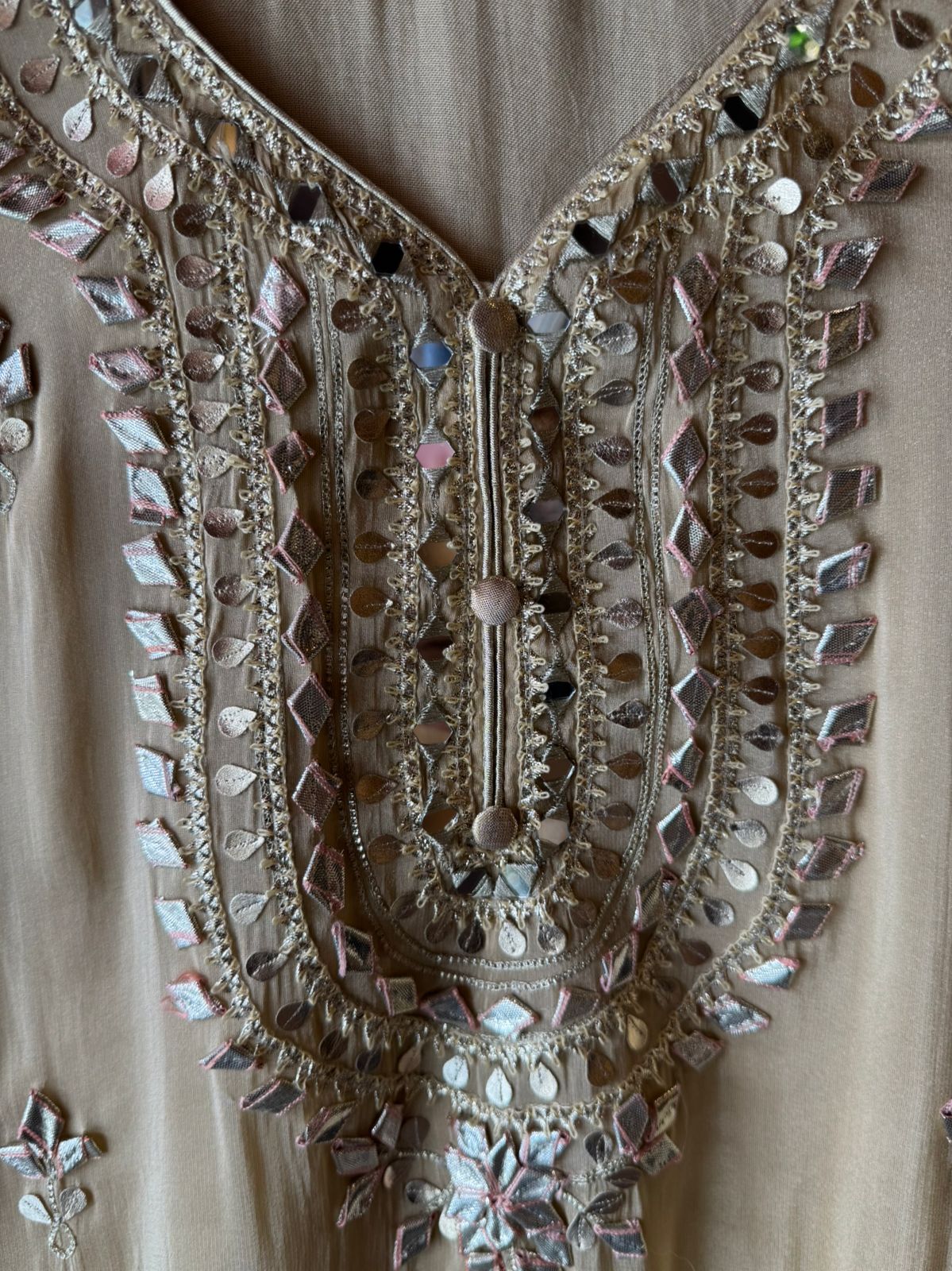 It has A beautiful Long and a very heavy neckline Which is mirror and gotta embellished