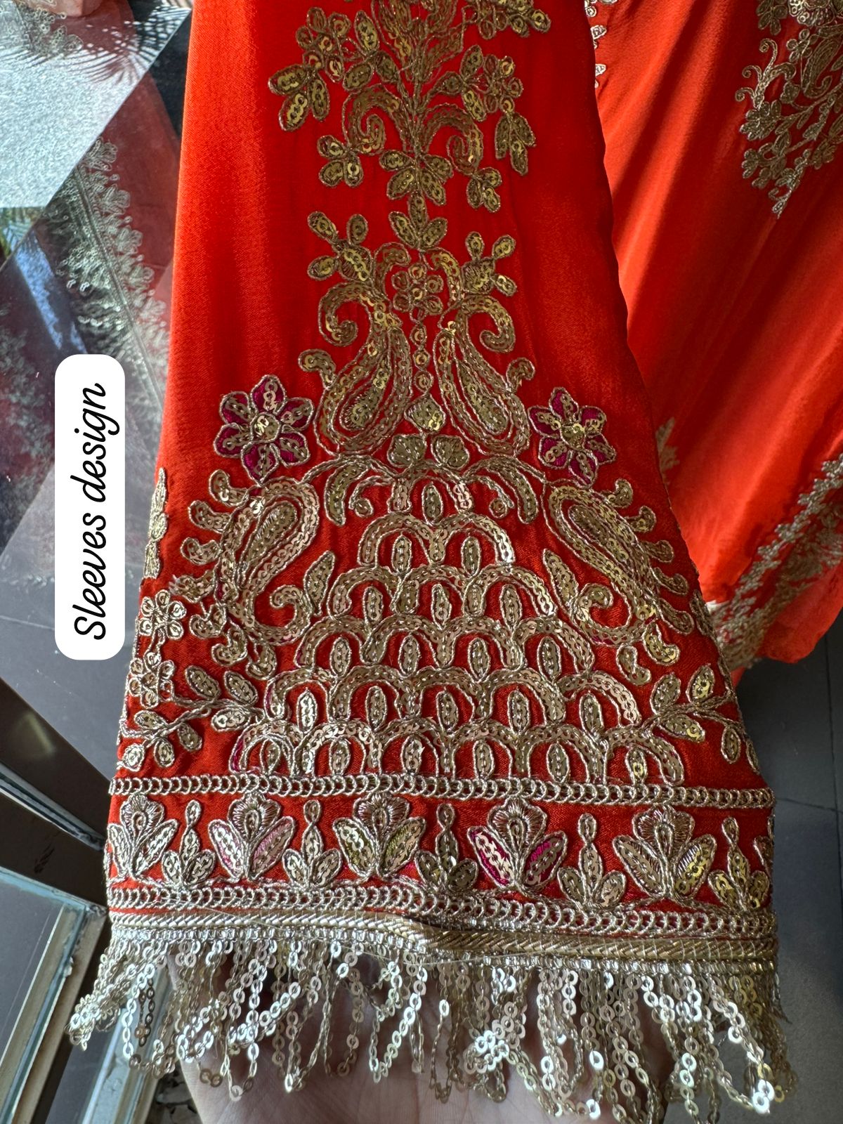 The hemline is richly embroidered with golden thread, featuring large floral and paisley motifs.