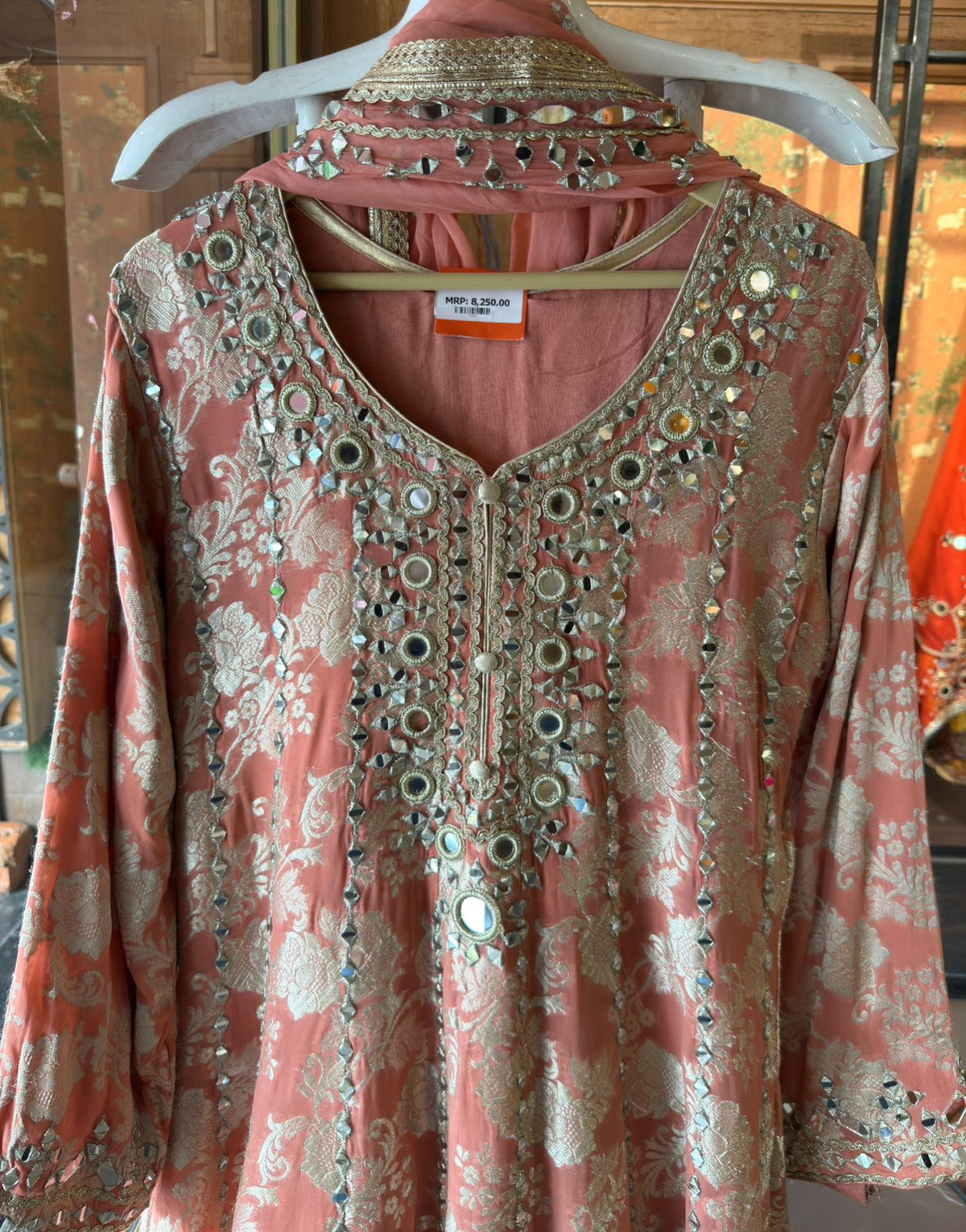Mirror/Sequin Work: Geometric mirror and Gotta embellishments bordered with zari on neckline, yoke, hemline, and sleeve cuffs.