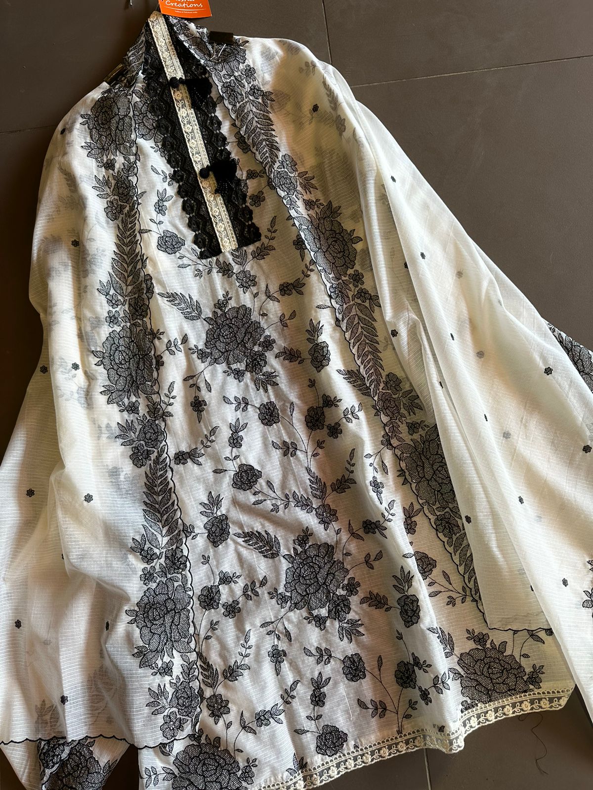 Pure and Soft original Kotta Doria with floral embroidered Jaal on the front with very smart moti latkans on the neck patti attached