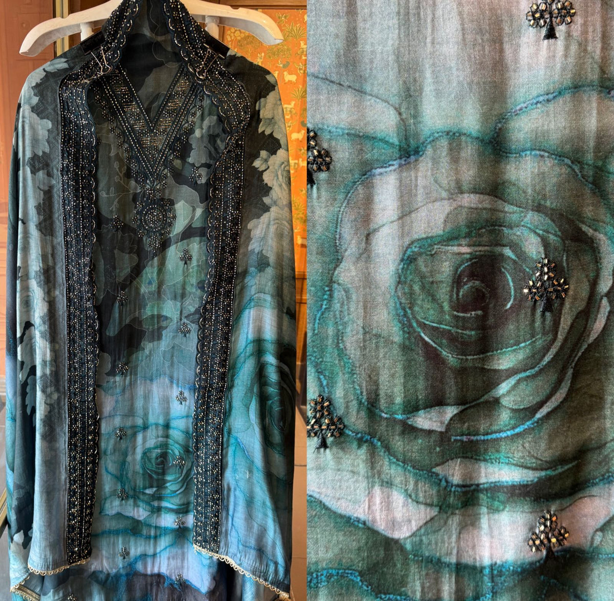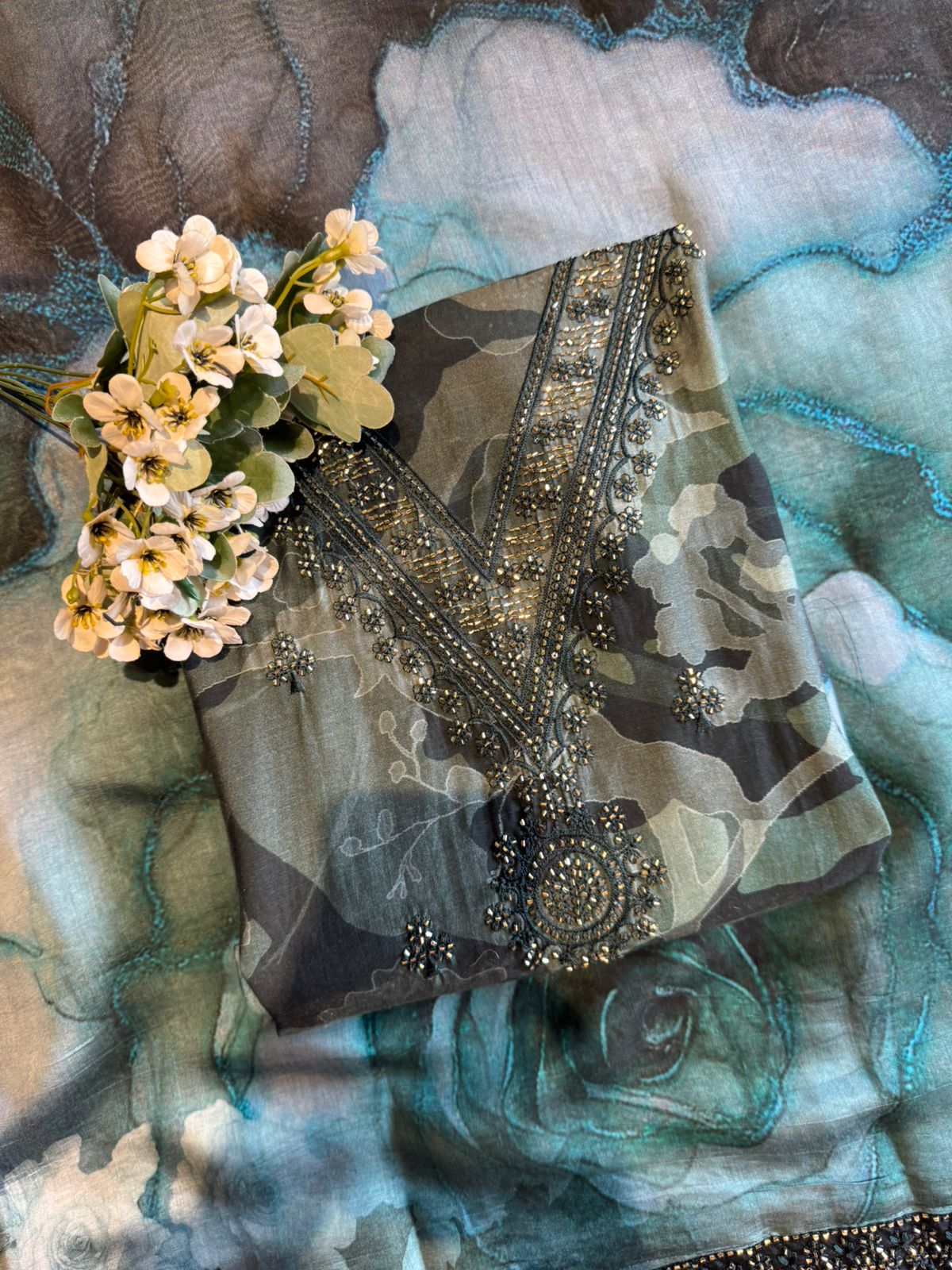 V shaped neckline with heavy embellishment of Cutdana and Nalki’s.