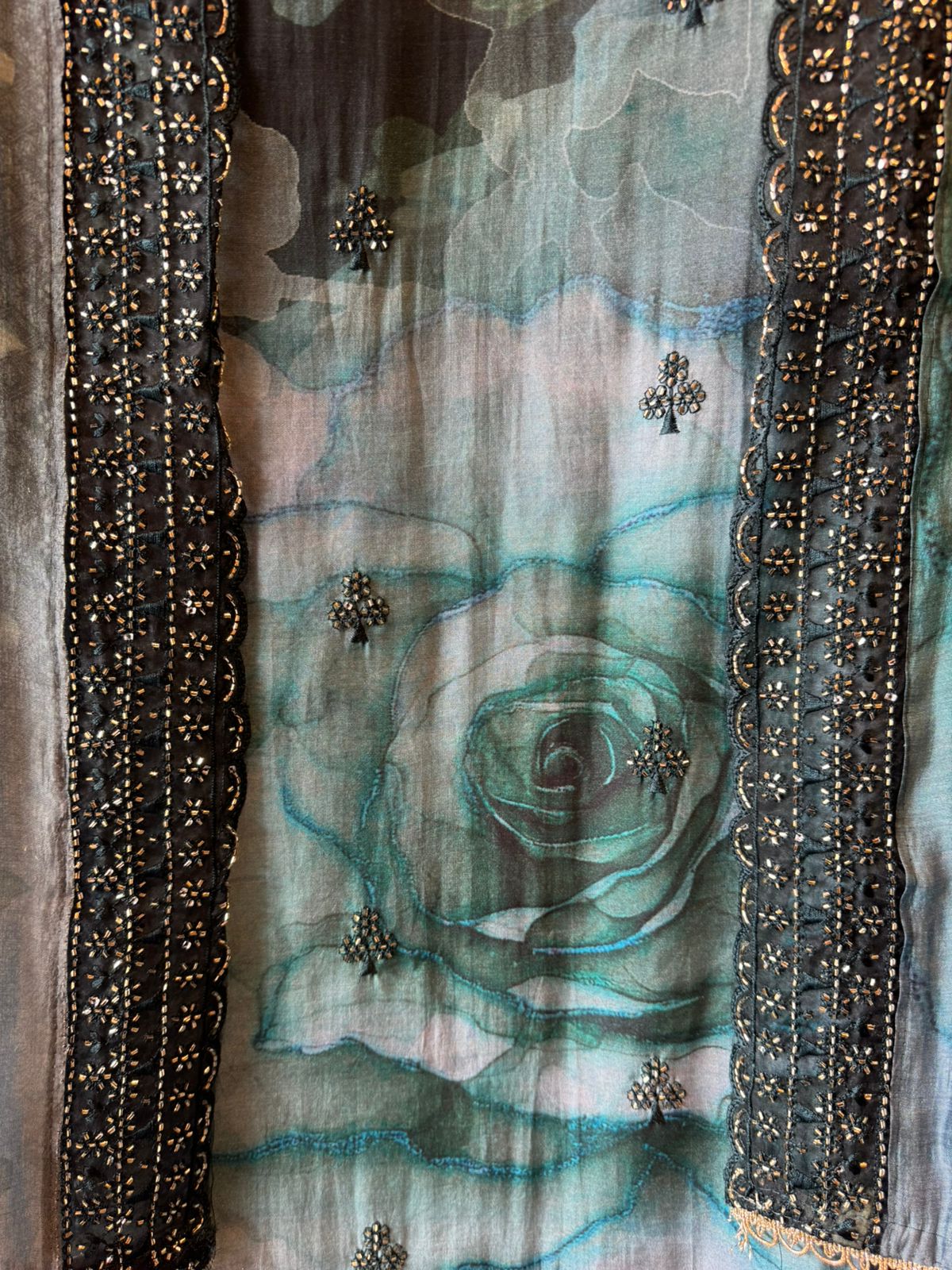 Muslin Dupatta digital printed with embroidered borders on the two longer sides.