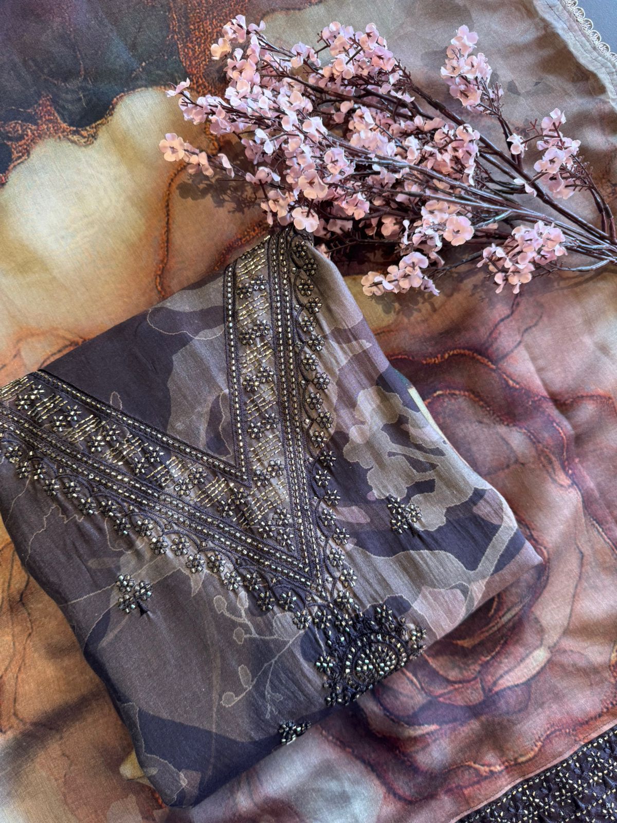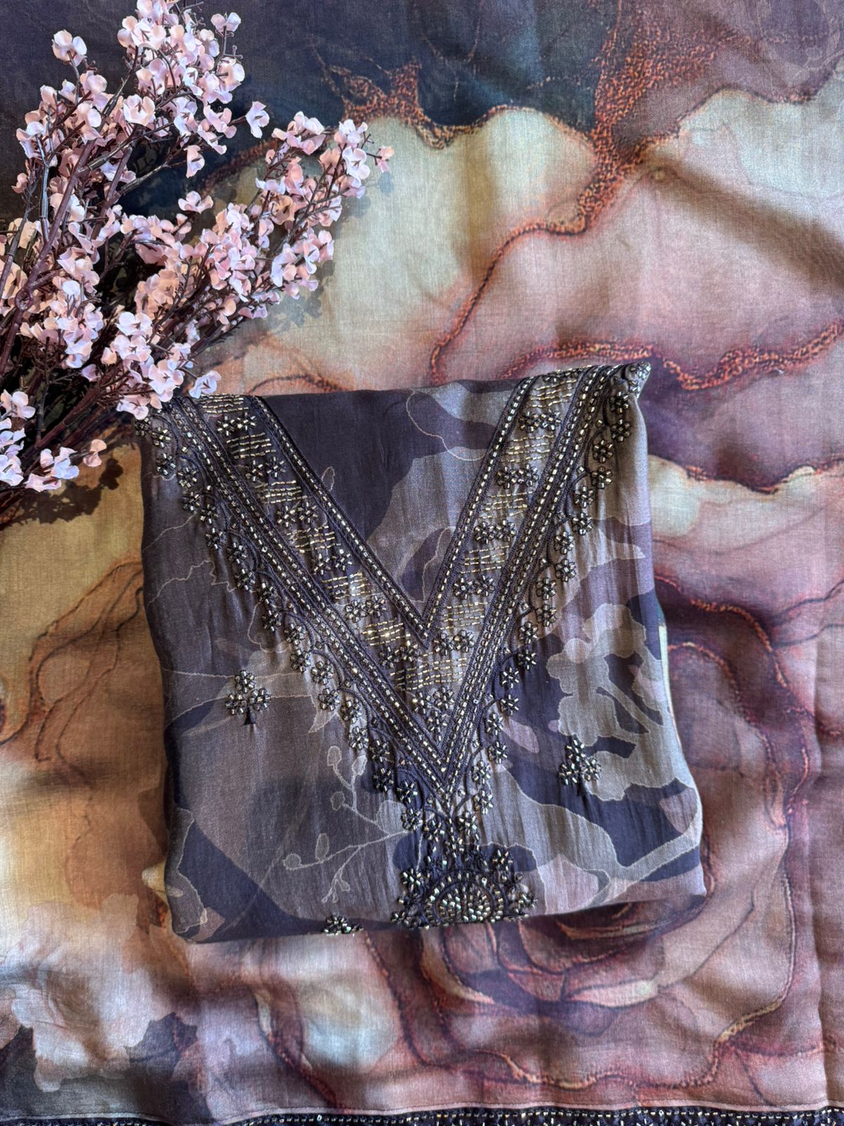 V shaped neckline with heavy embellishment of Cutdana and Nalki’s.