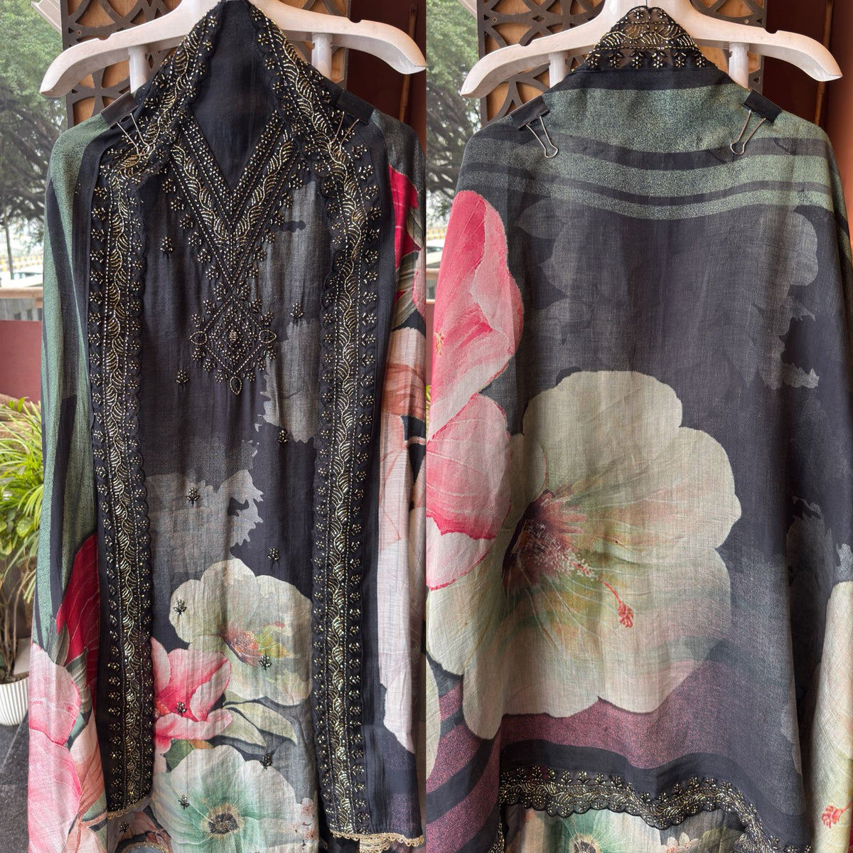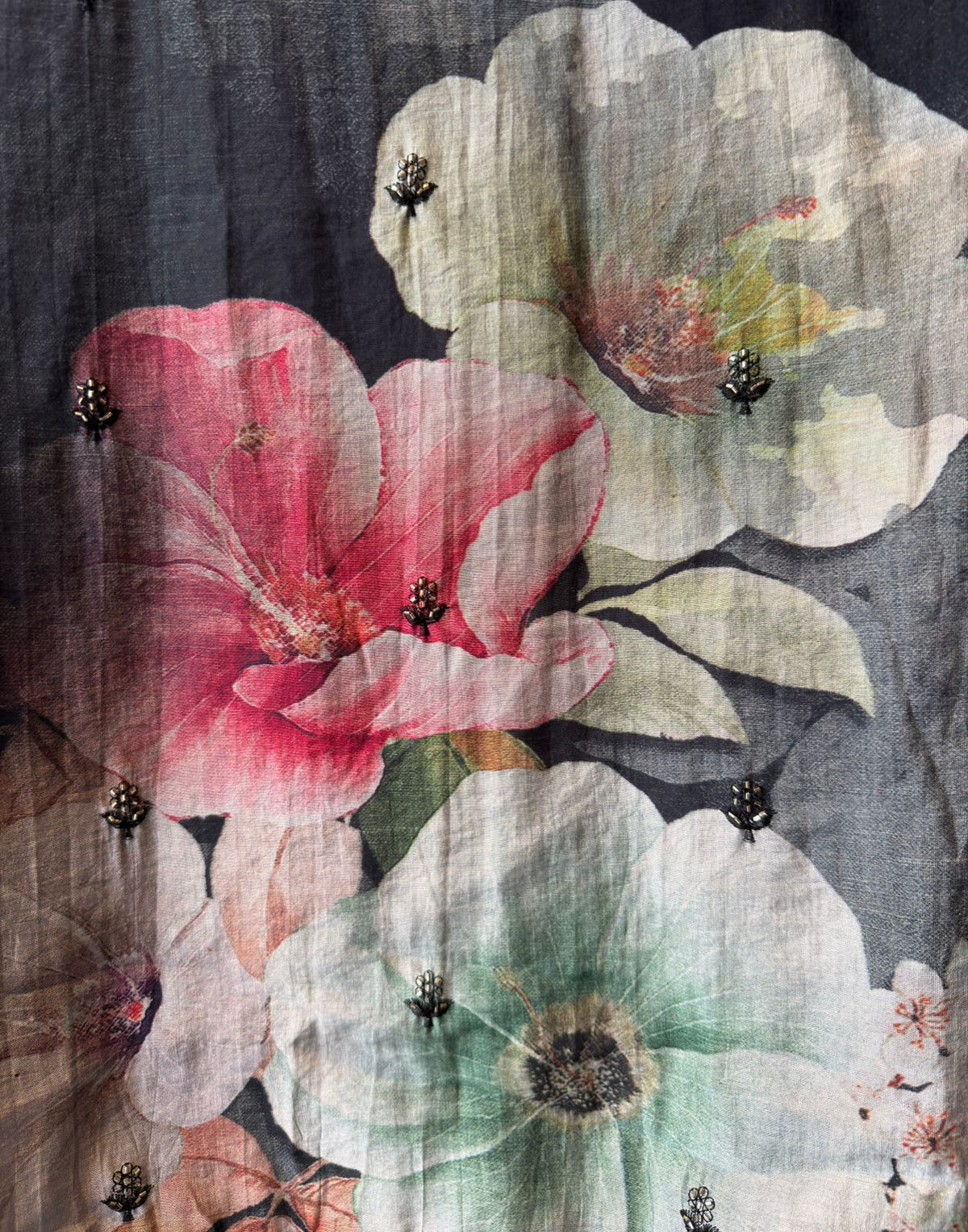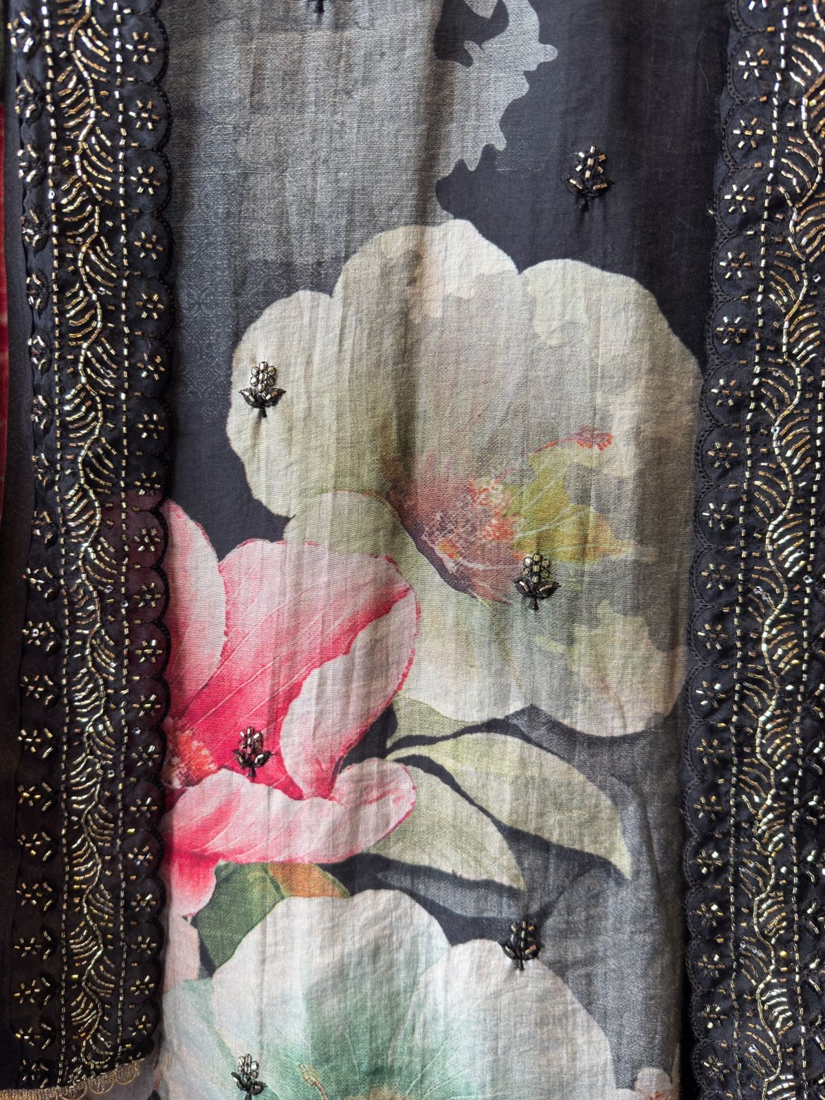 Muslin Dupatta digital printed with embroidered borders on the two longer sides.