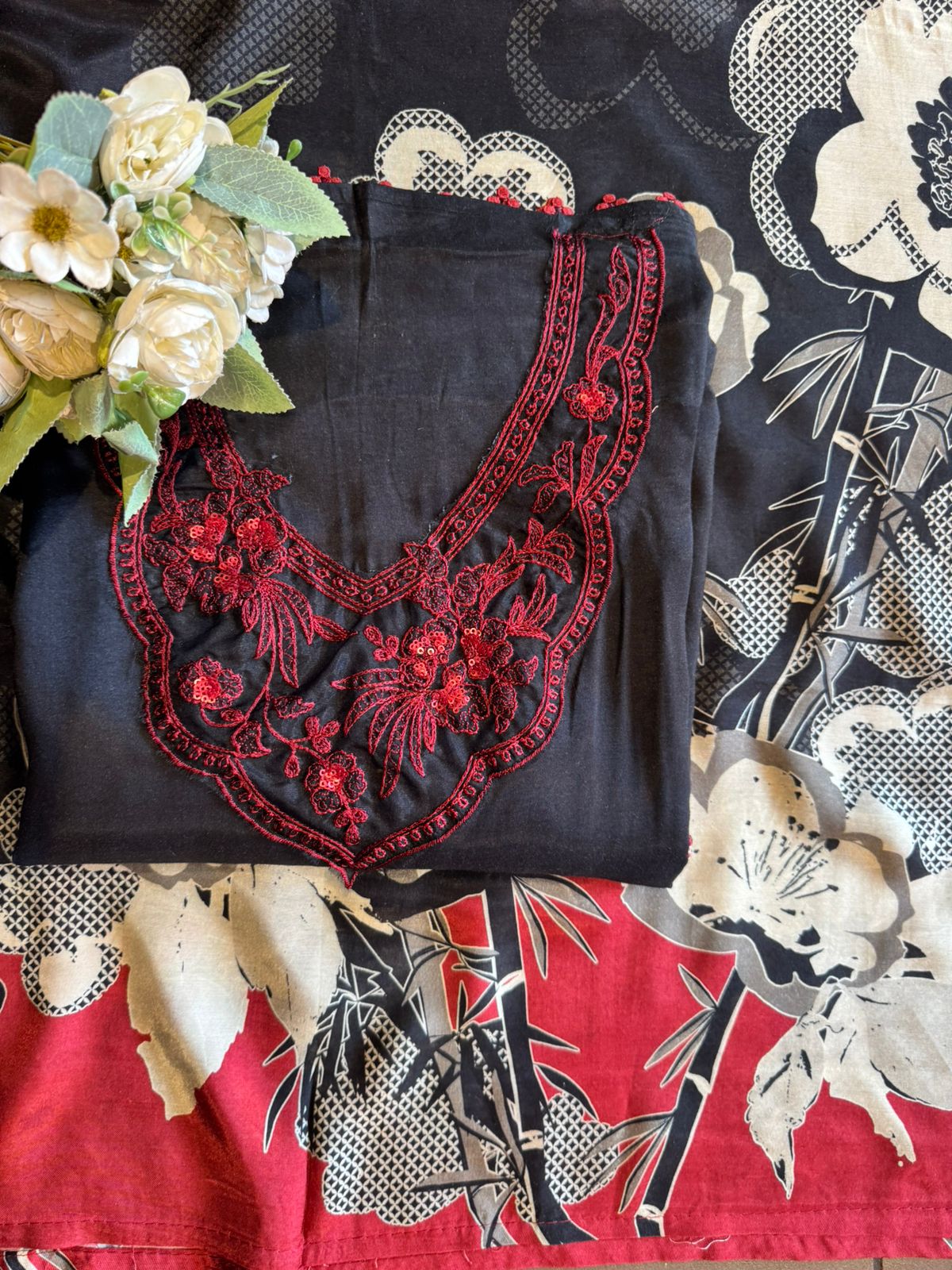 Matching floral artwork with contrast red border