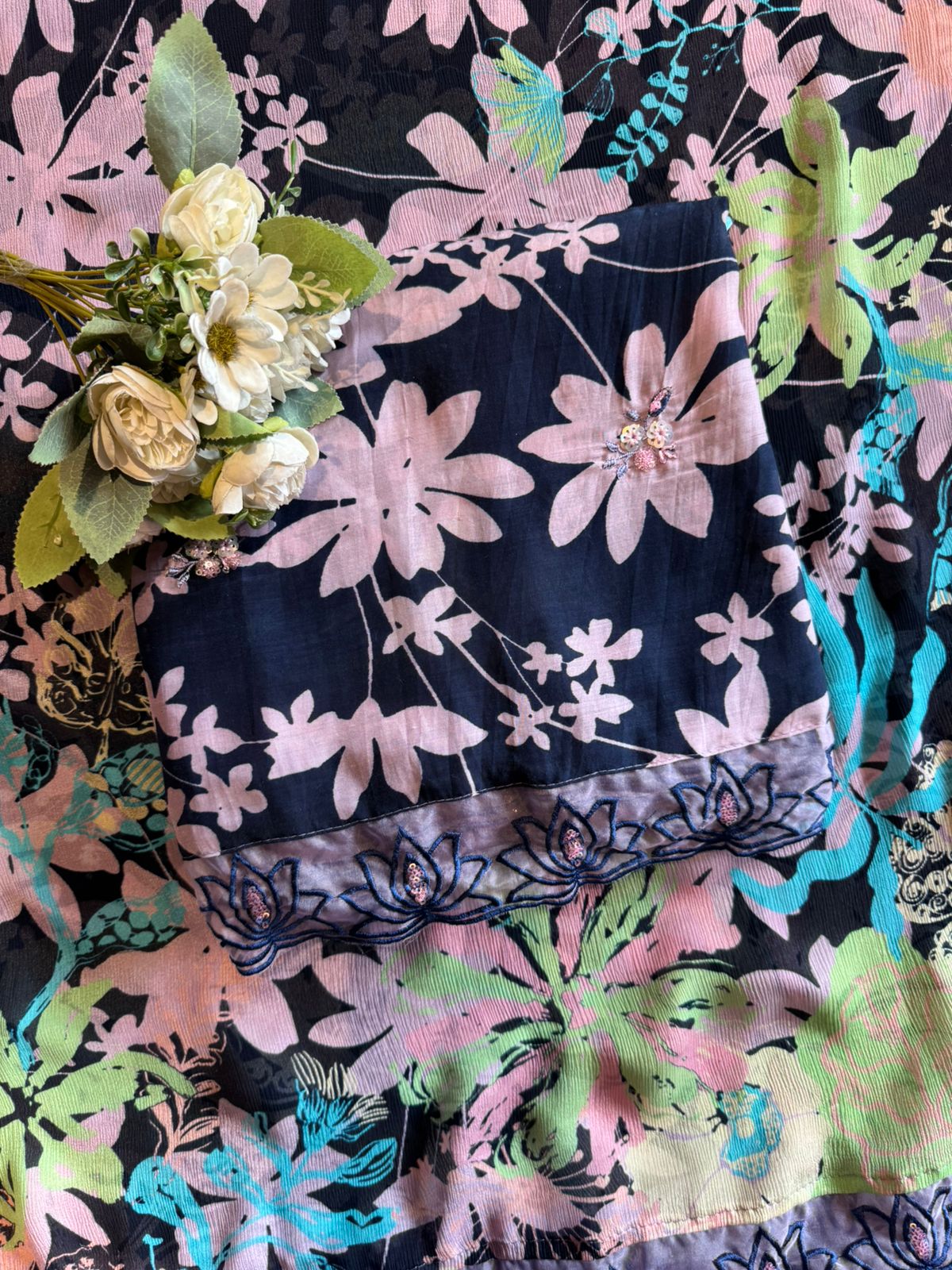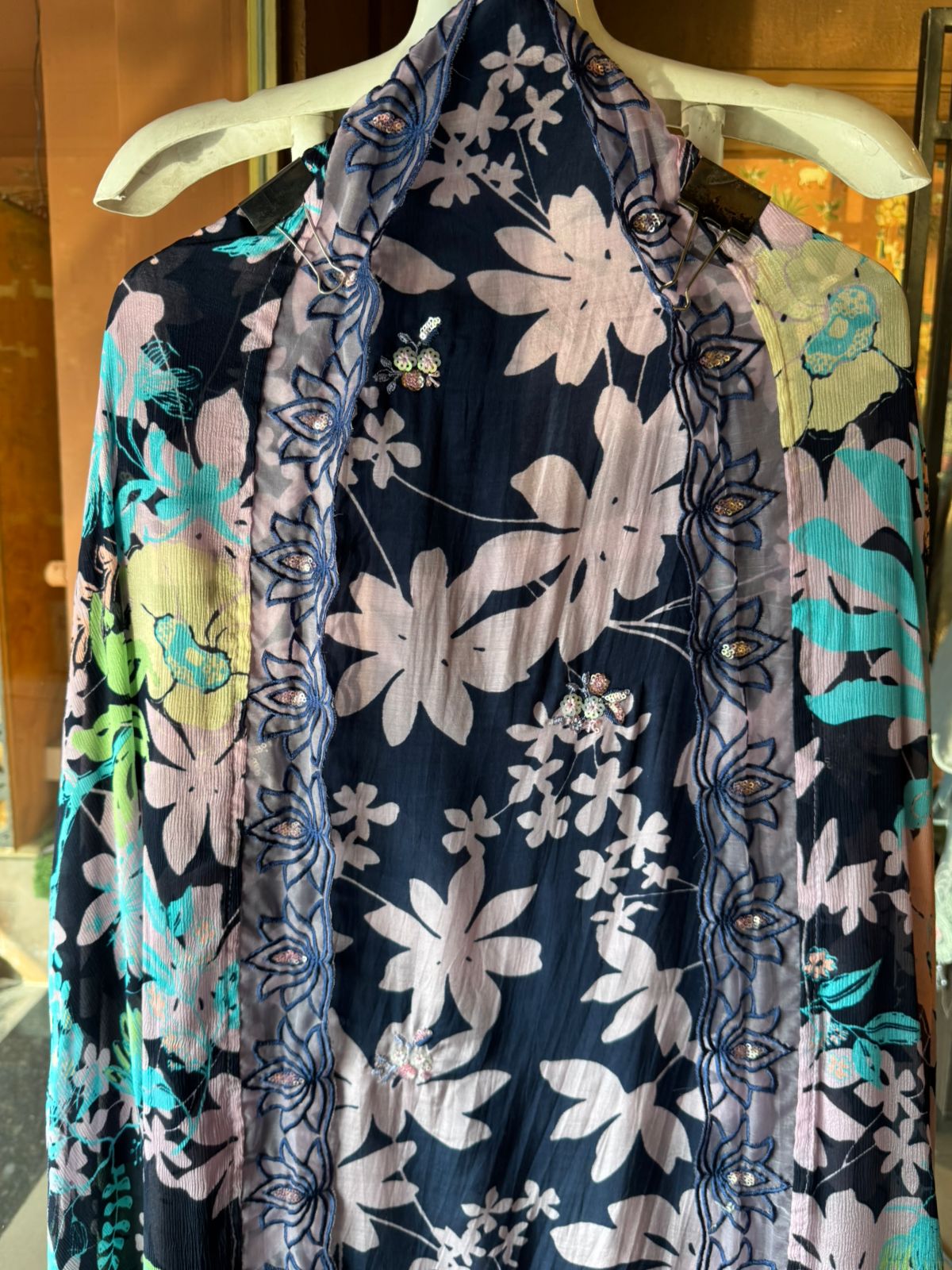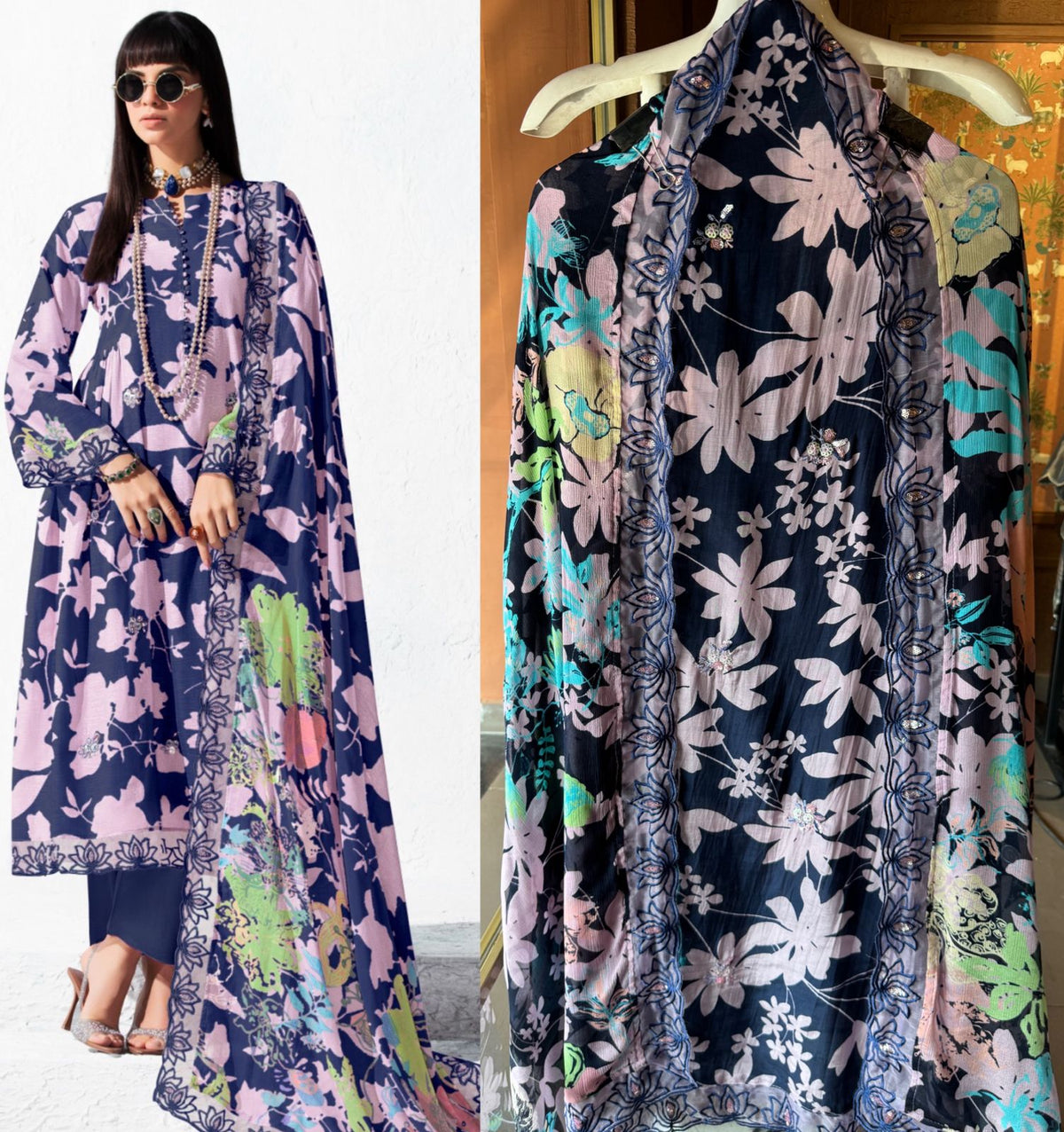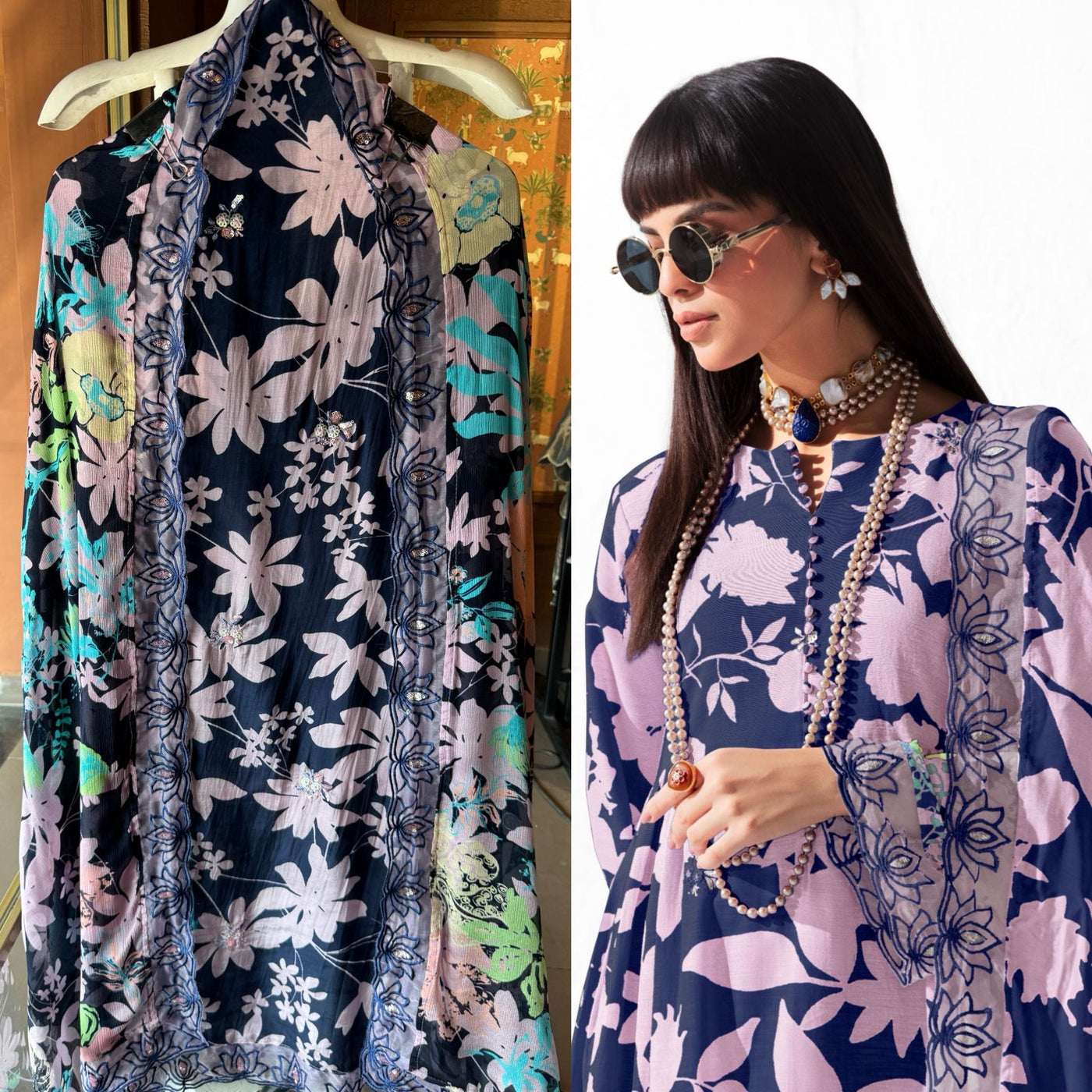 Pure Muslin with digital print embroidery butis on front and scalloped embroidered floral border for the hemline and sleeves