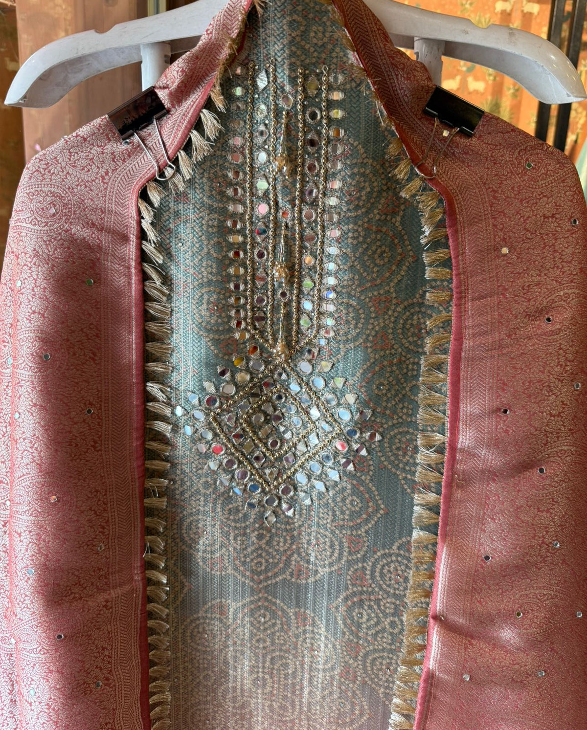 The kurta has a jacquard or brocade pattern with bandhani print.