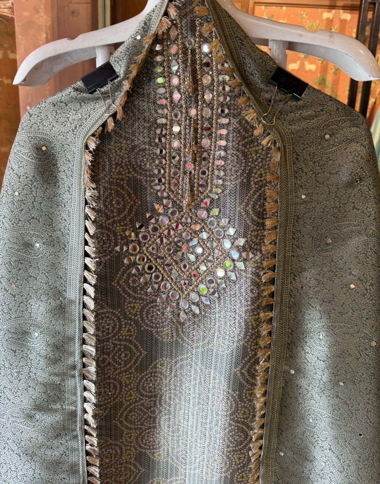 Gold sequins,Mirror work (shisha), Beads,Thread embroidery for outlining.