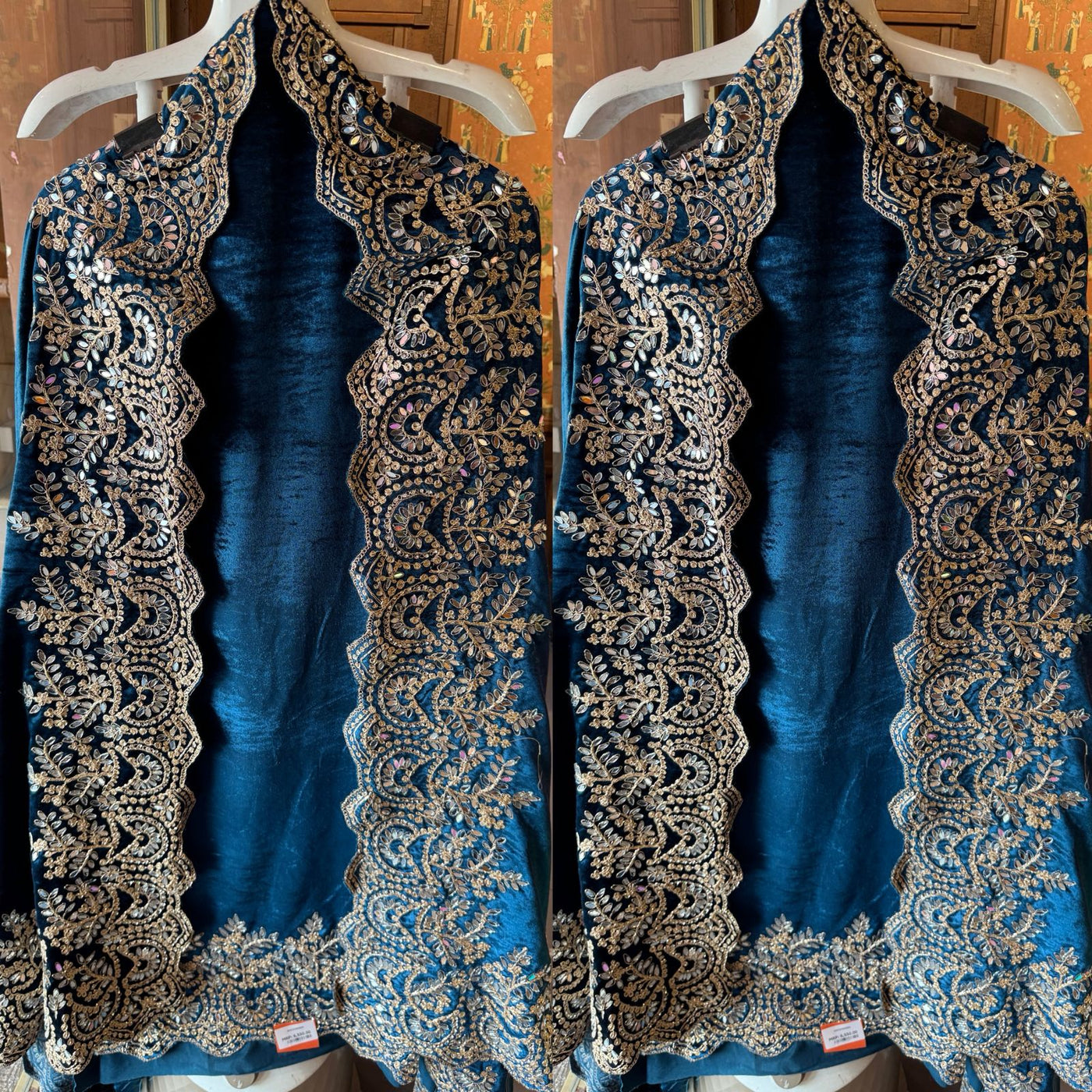 Solid colour velvet shawl decorated with original mirror work and Zari embroideries.