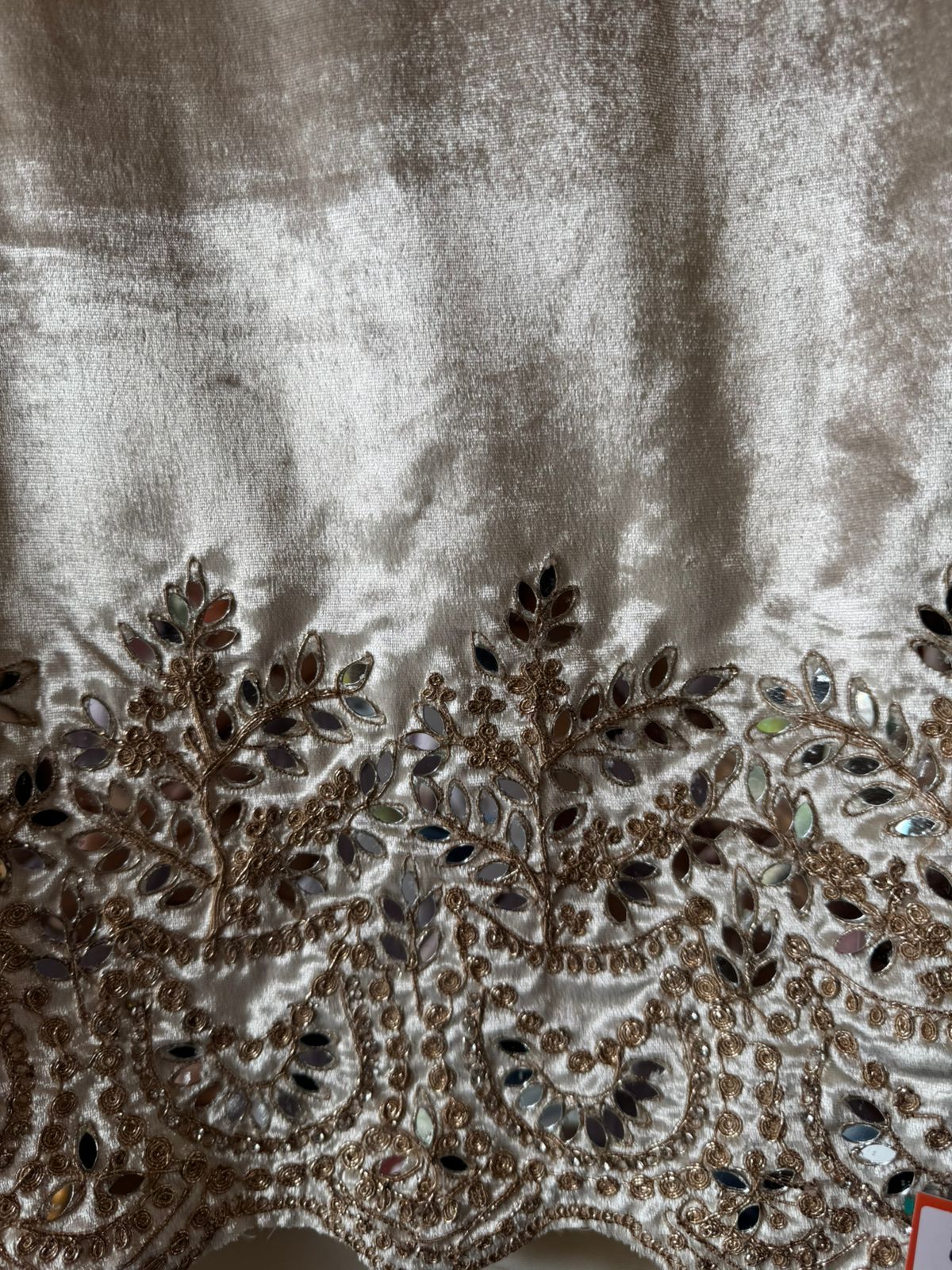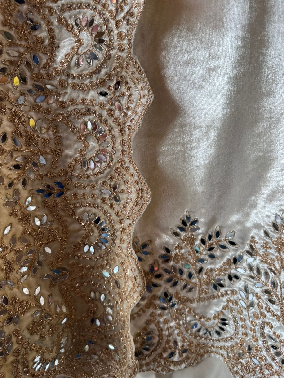 Borders are heavily Mirror embroidered with scalloped edging.
