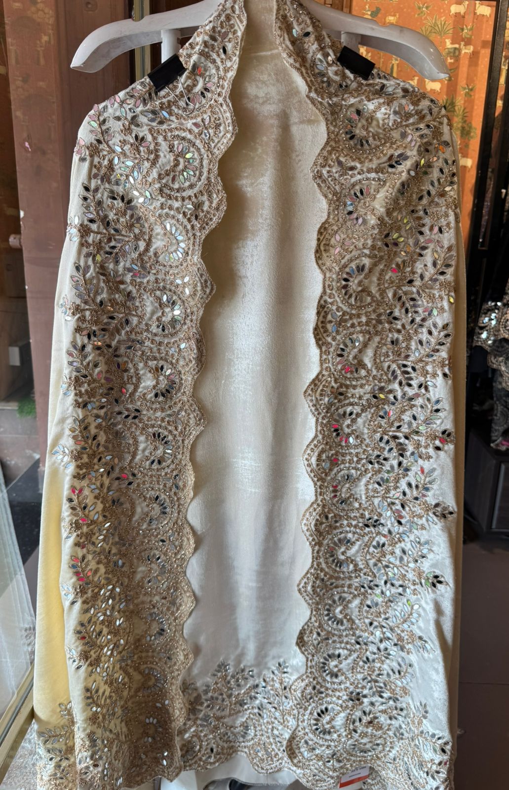Solid colour velvet shawl decorated with original mirror work and Zari embroideries.