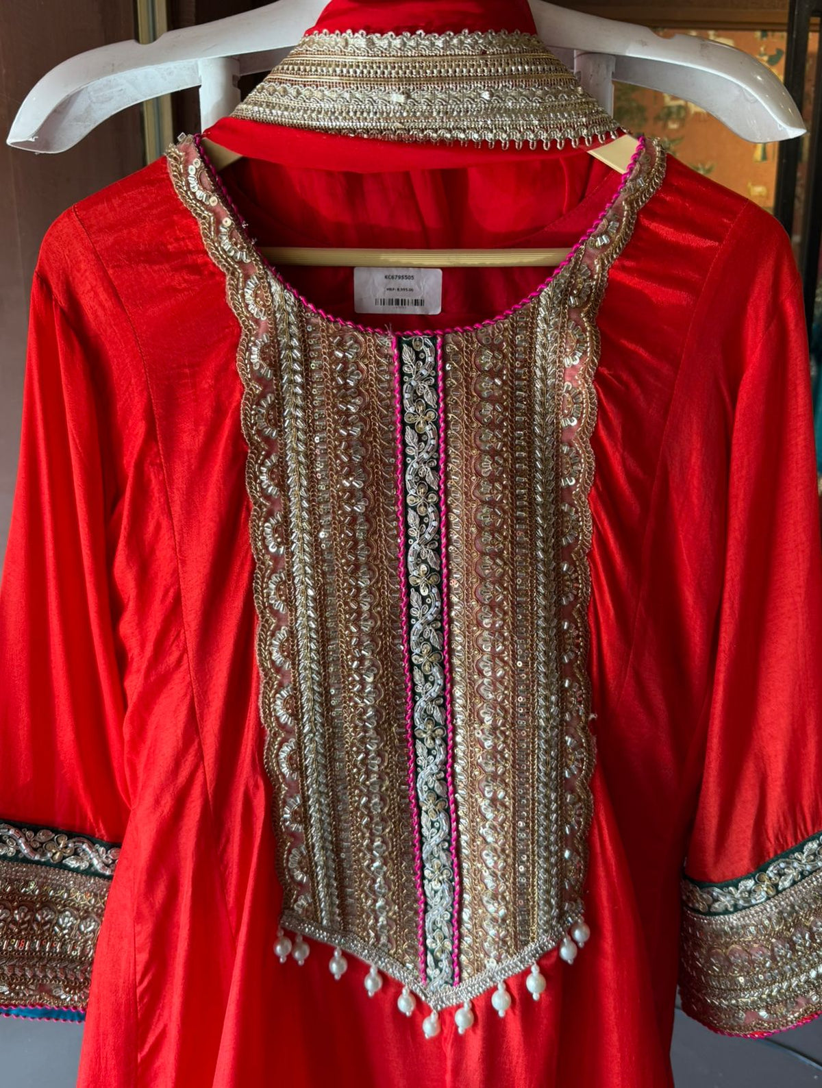 Shop our new design of Anarkali on Silk, Beautiful flaired Anarkali with hand embroidered patch on the neckline as well as on the hem and sleeves.