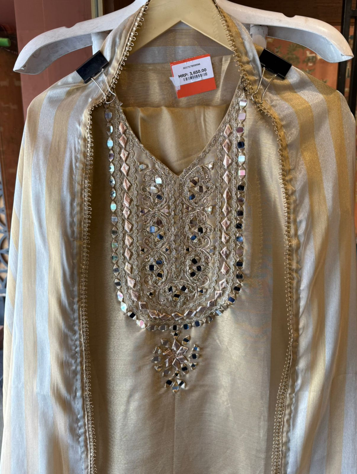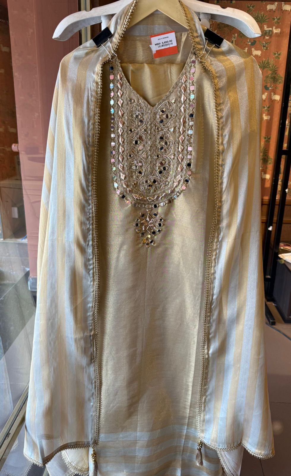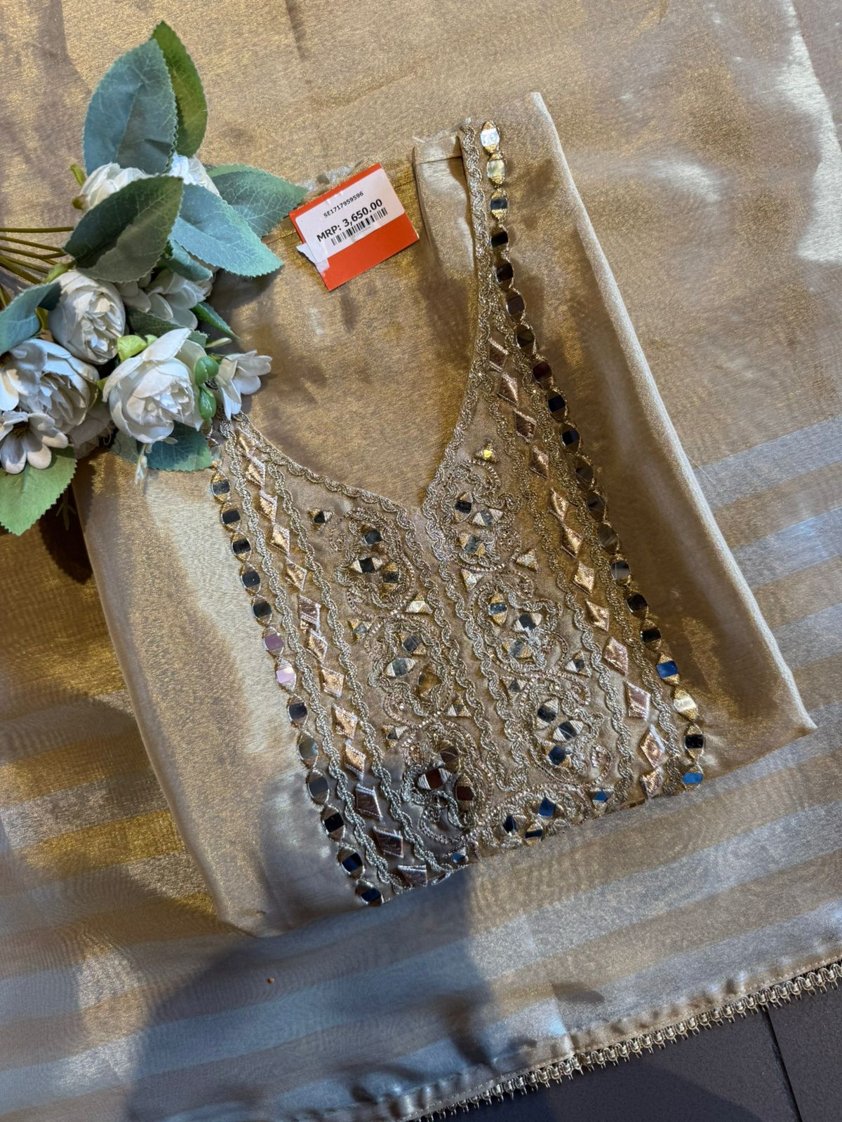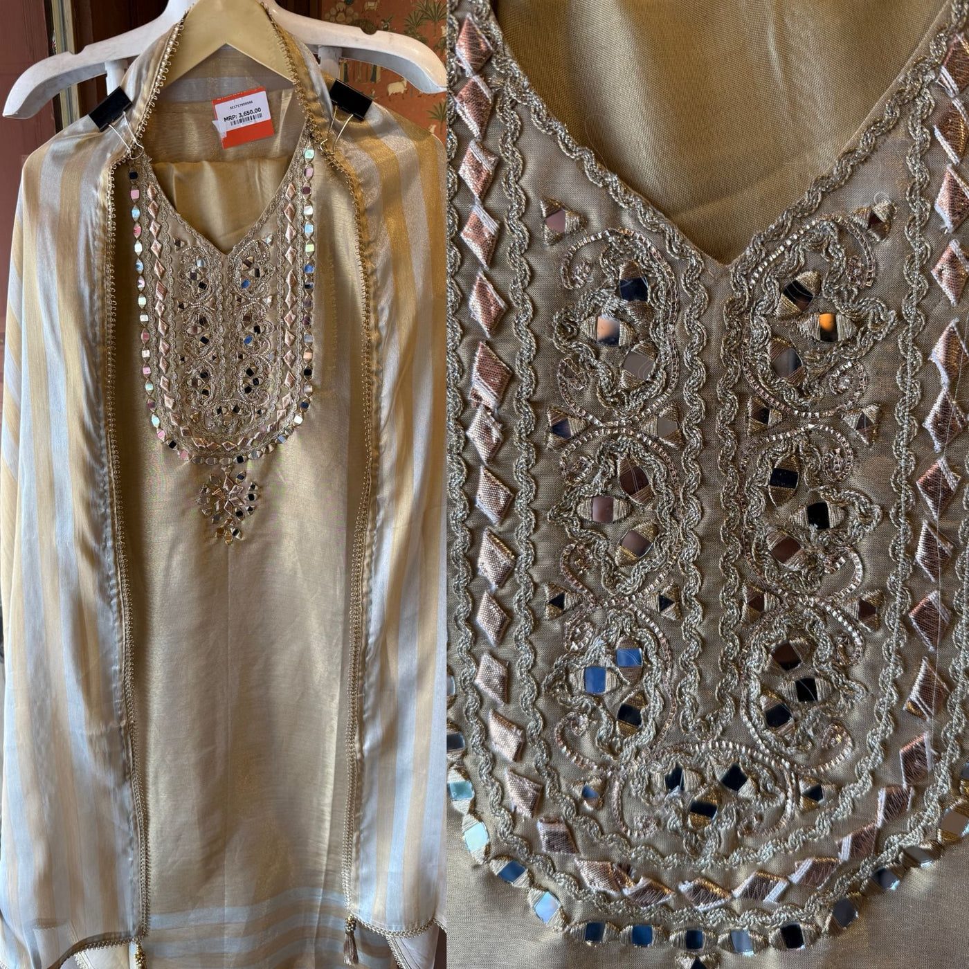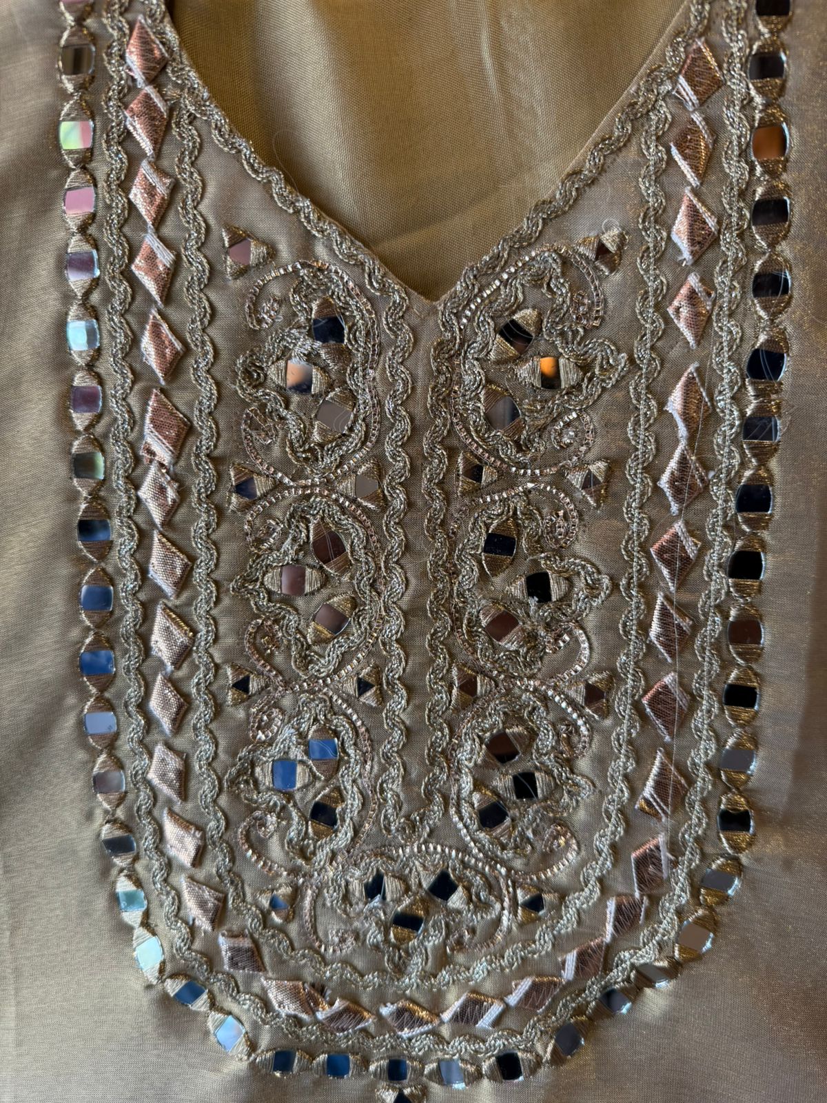 Heavy mirror work & intricate Zari  thread embroidery on neckline with gotta Detailing.