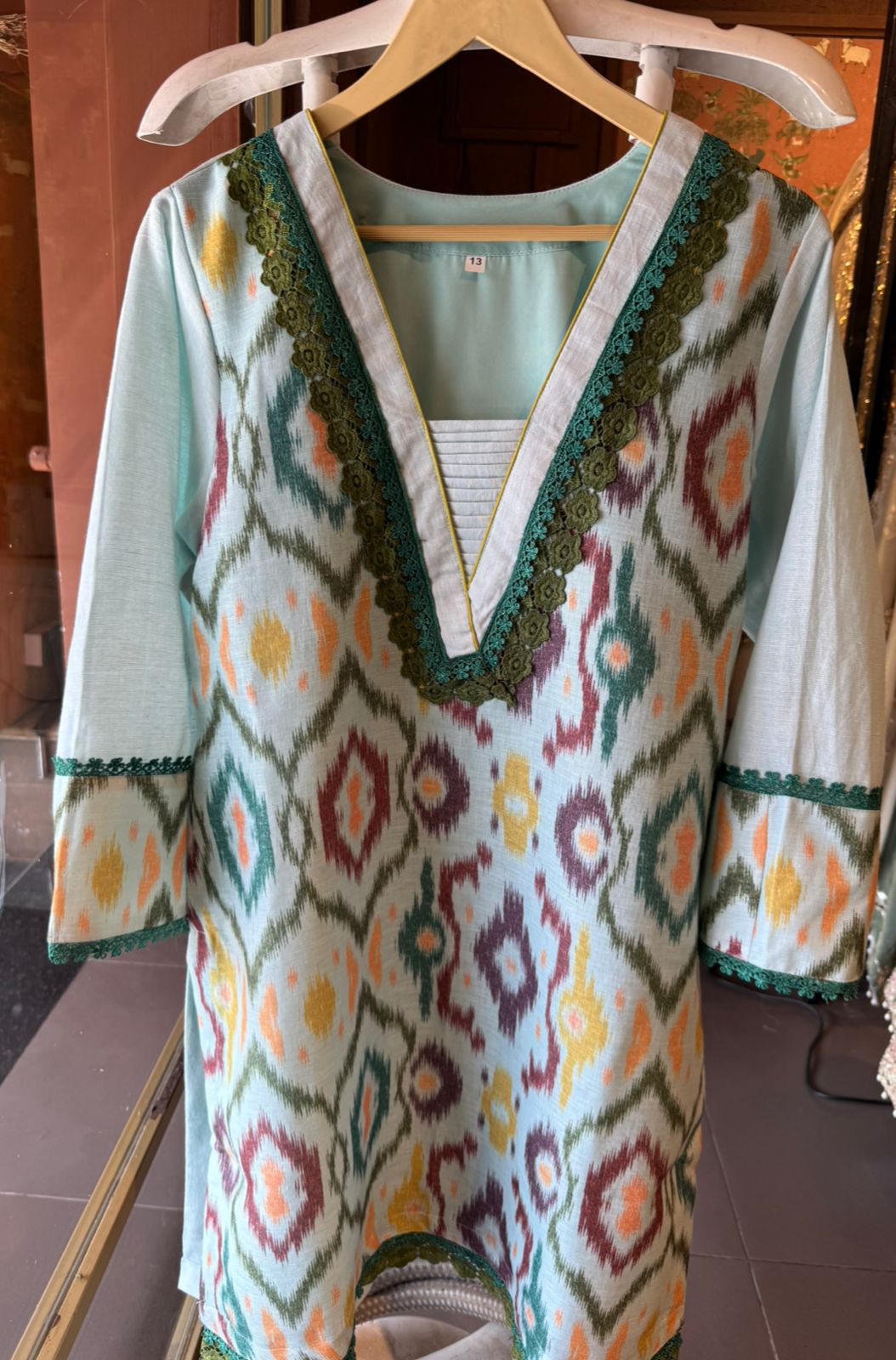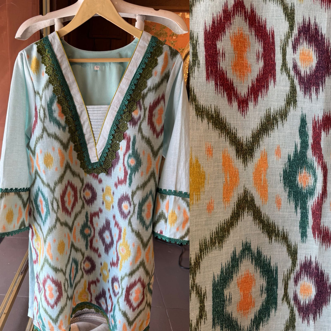 Elevate your everyday ethnic style with this effortlessly chic pastel Ikkat  Coord  set. Crafted in a soothing cream base, the kurta features vibrant multicolor ikat-inspired prints