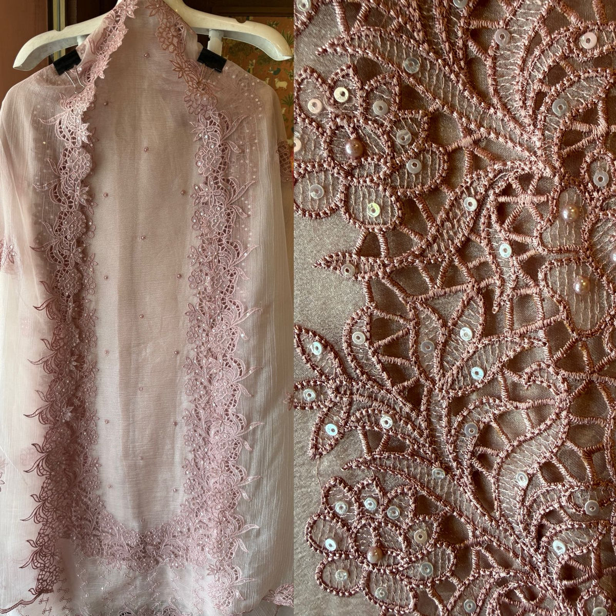 • Work: Intricate floral cutwork embroidery