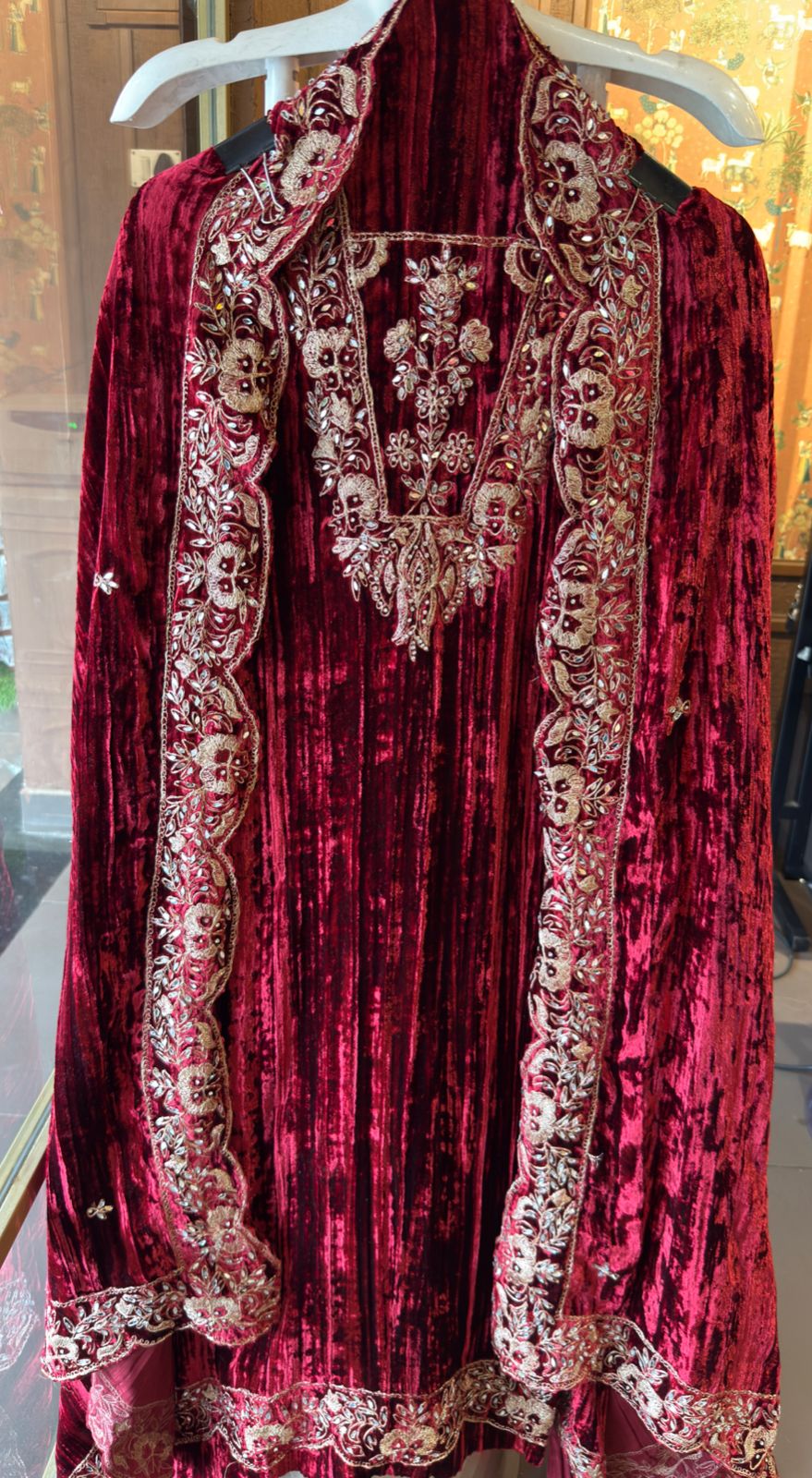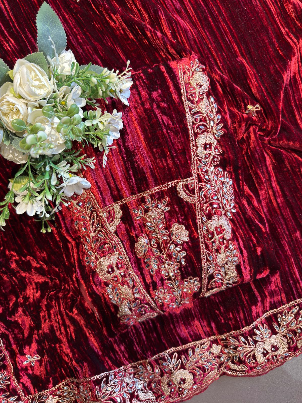 Crushed velvet unstitched Shirt with designer neckline made with dori and mirror work and Stone work highlighting
