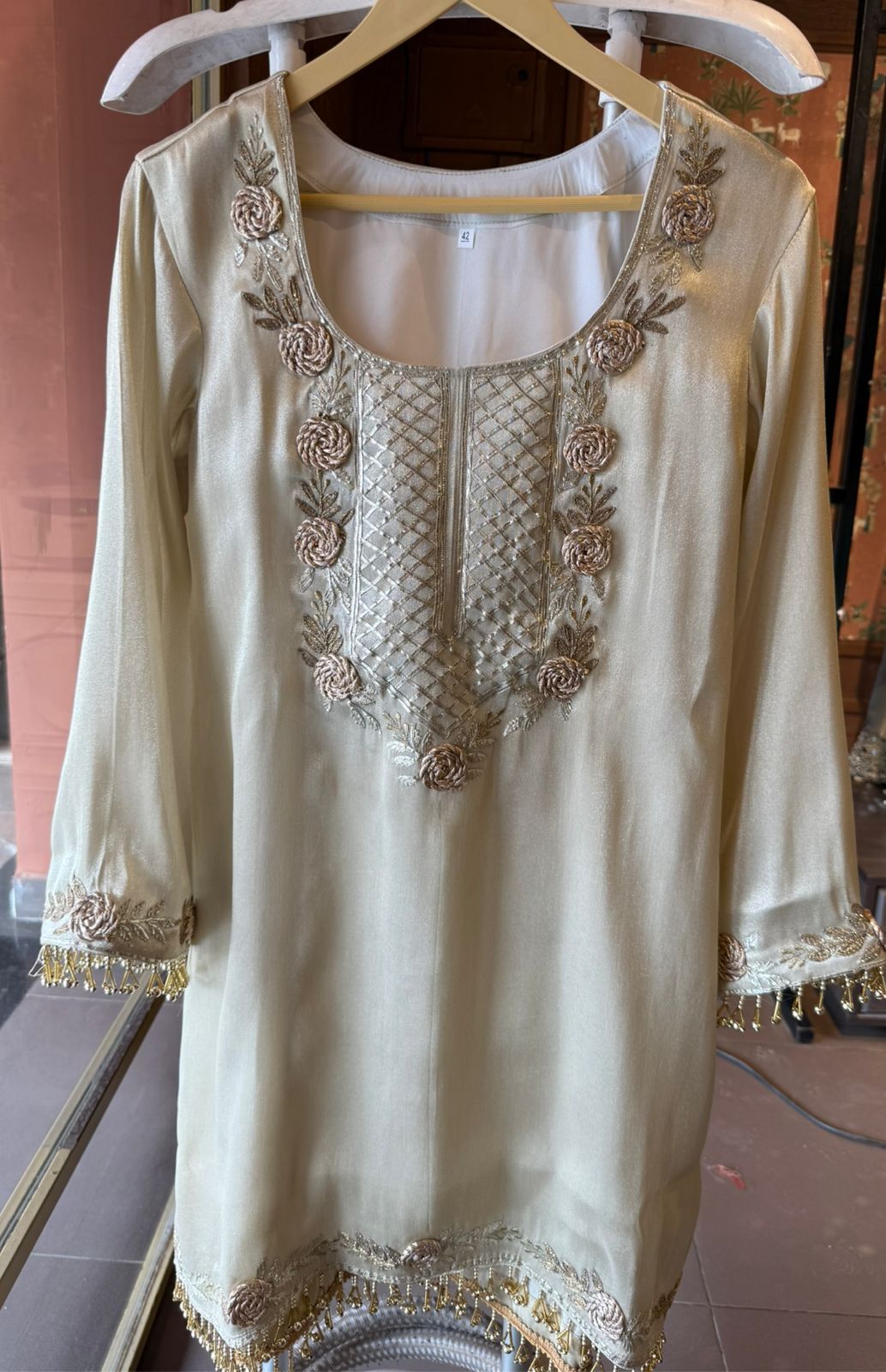 Straight kurta style with embroidered yoke & delicate tassel lace hem