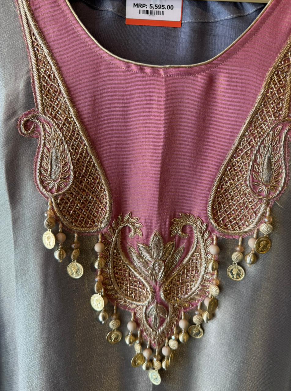 An elegant ethnic kurta designed with a subtle shimmer giraffe tissue base fabric and elevated with intricate hand embroidery on the neckline.