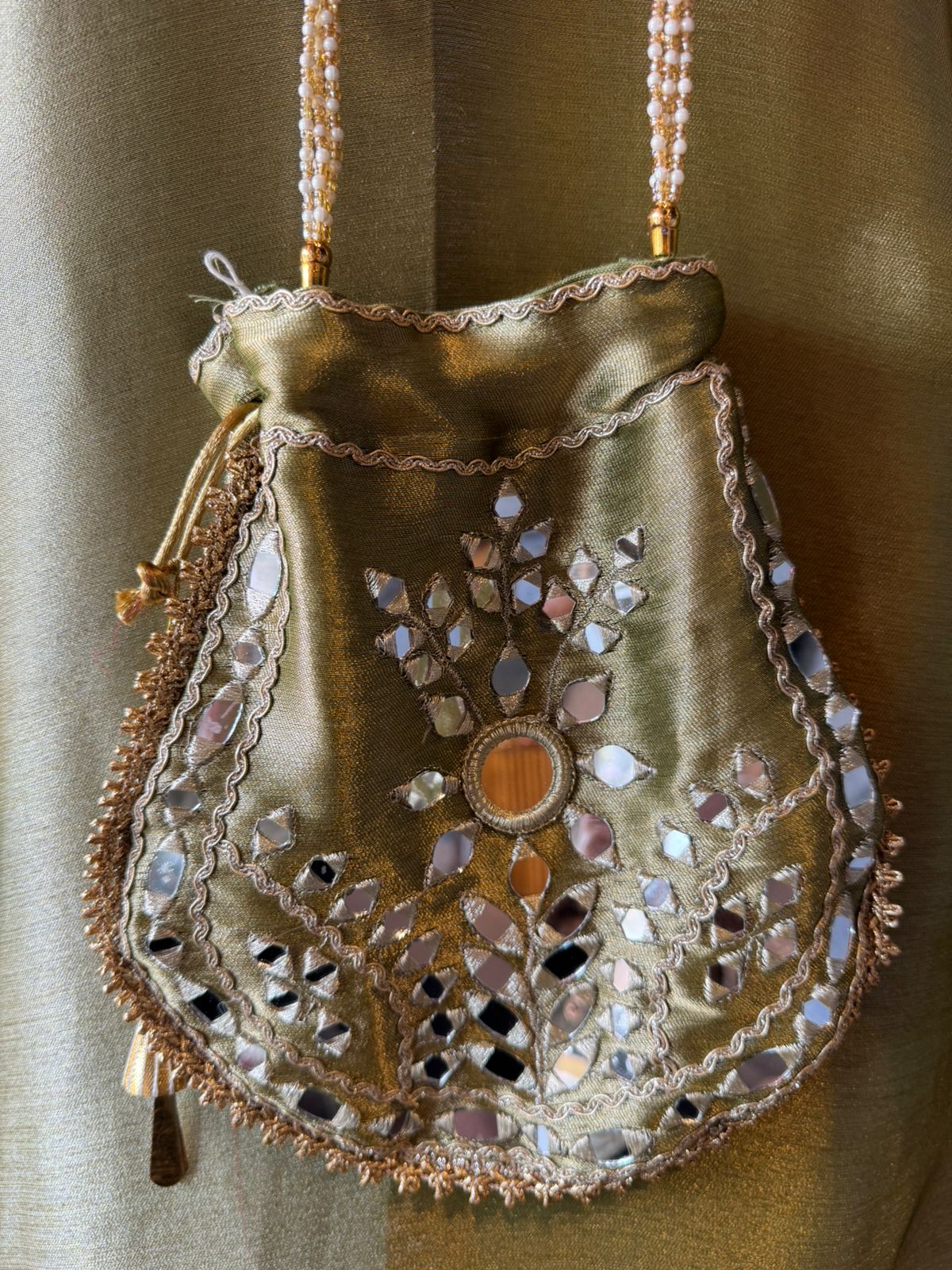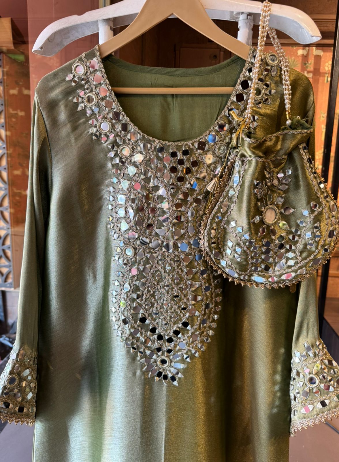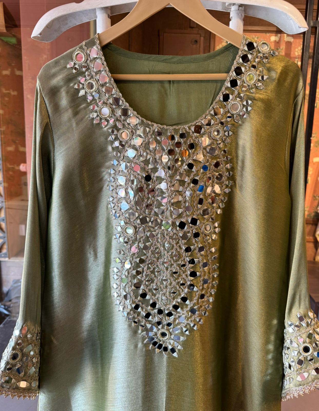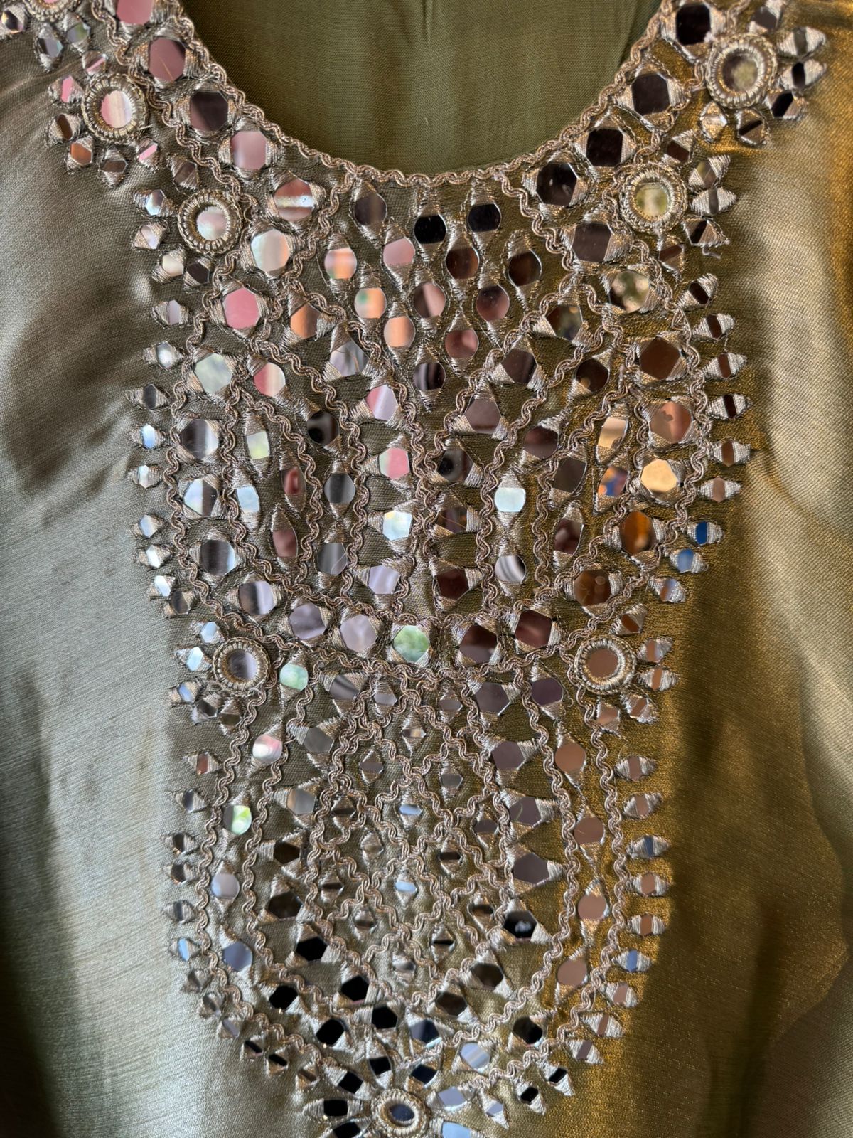 • Heavily adorned with mirror work (shisha) arranged in a geometric floral pattern