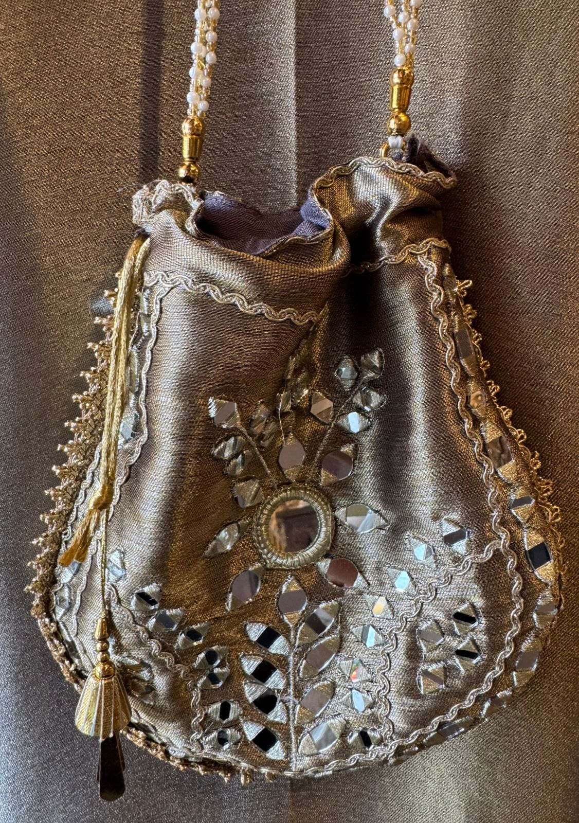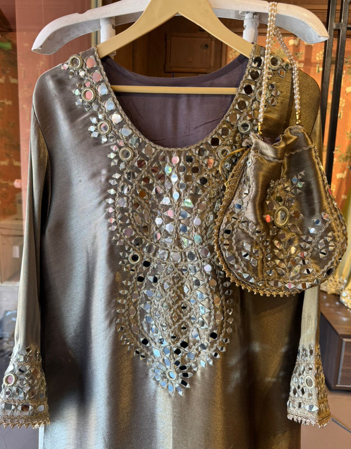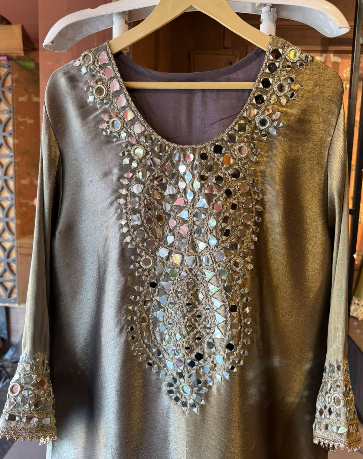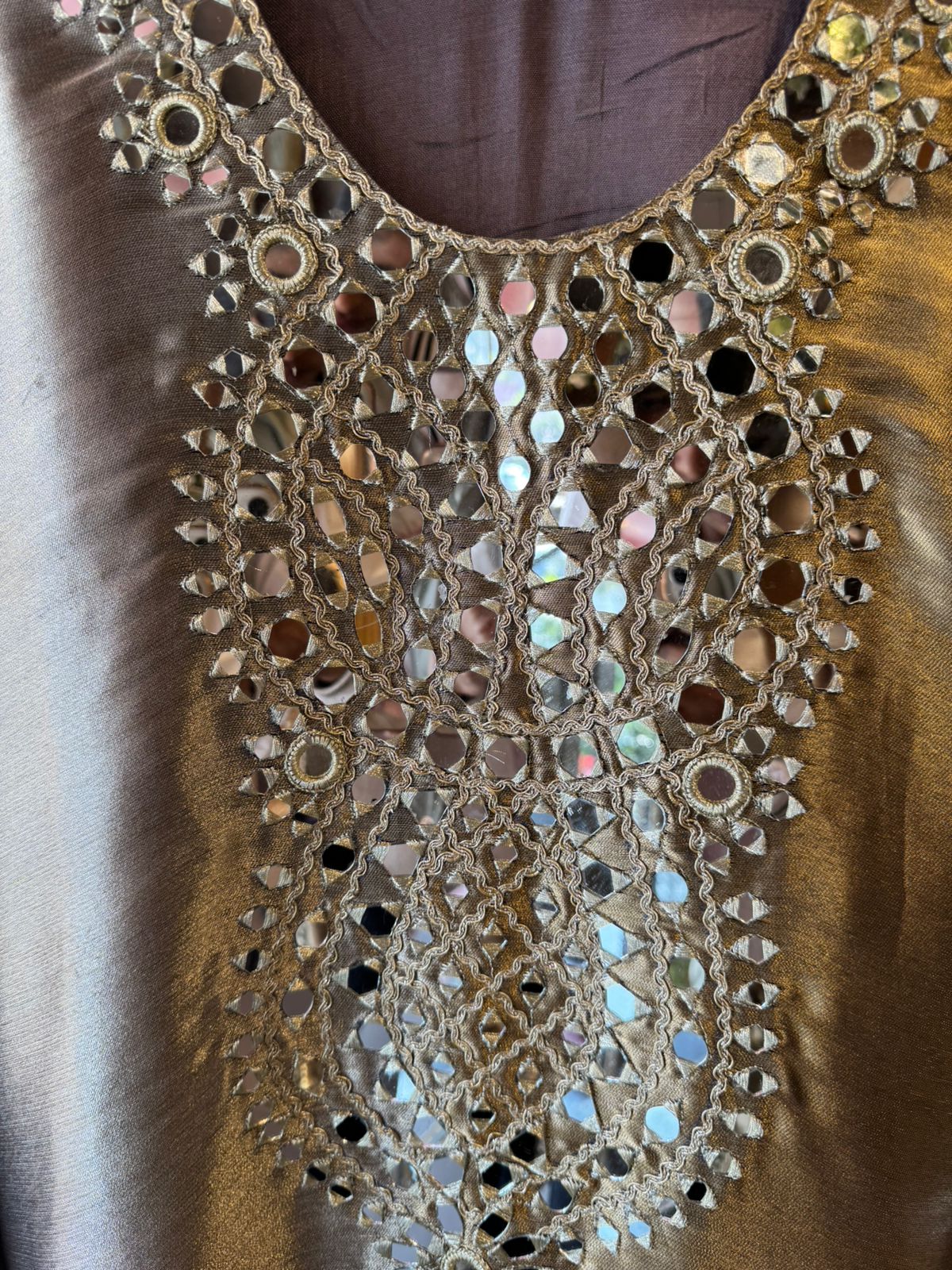 • Heavily adorned with mirror work (shisha) arranged in a geometric floral pattern