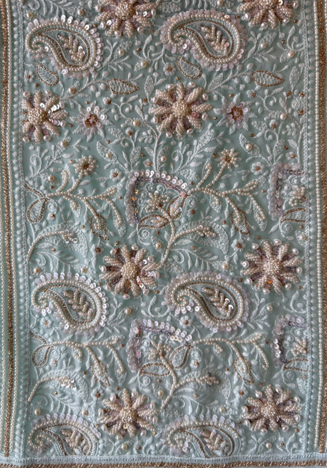 The shirt front pannel has complete handwork detailings , ambi design , Floral embroidery with pearls, Thread, Moti, sequence.