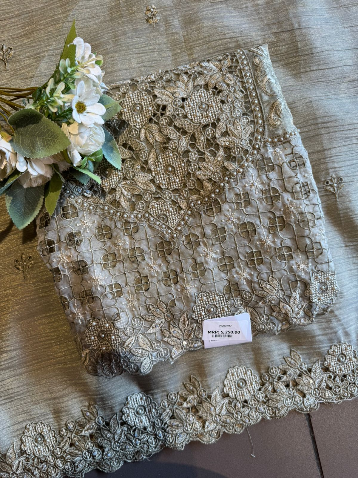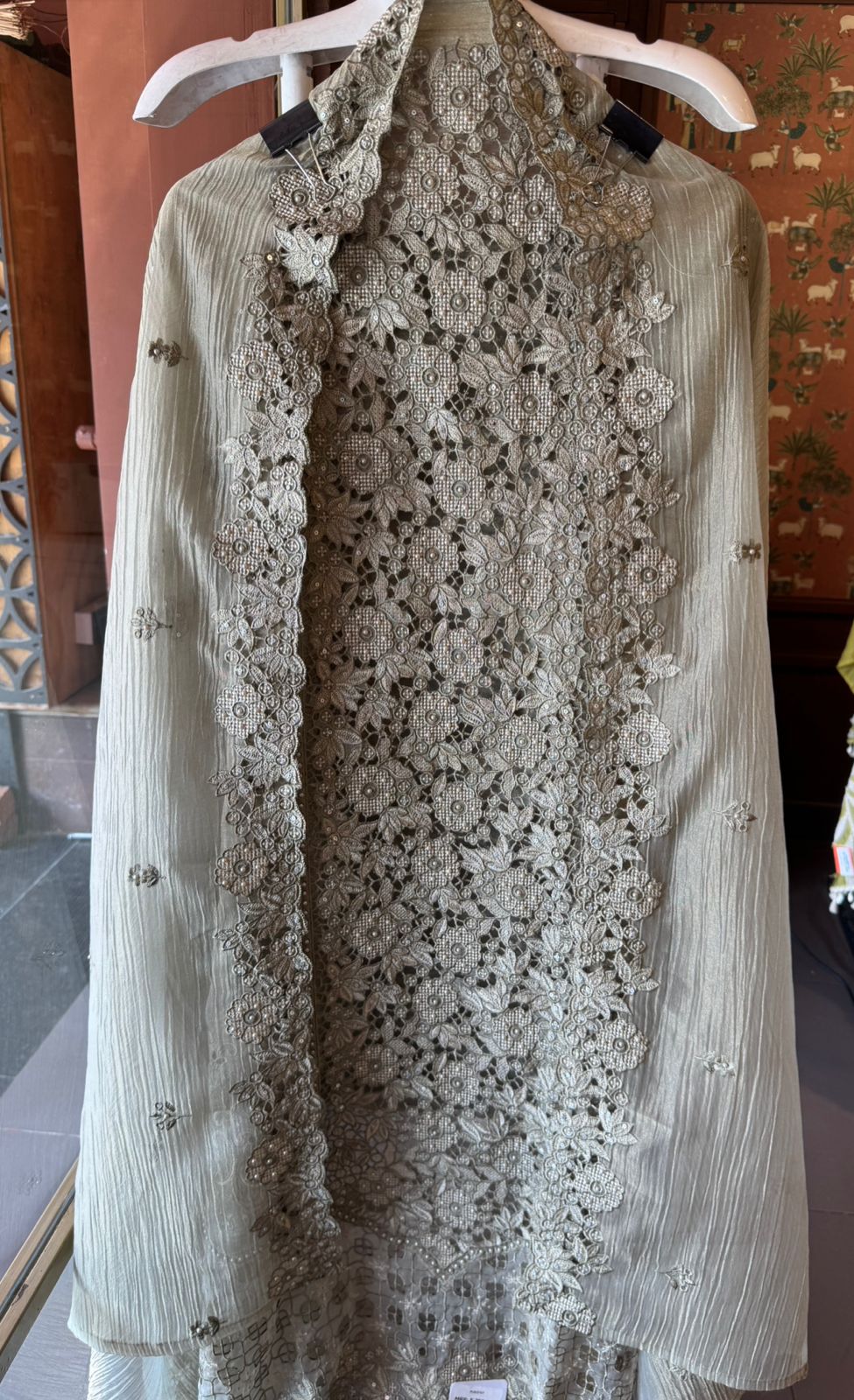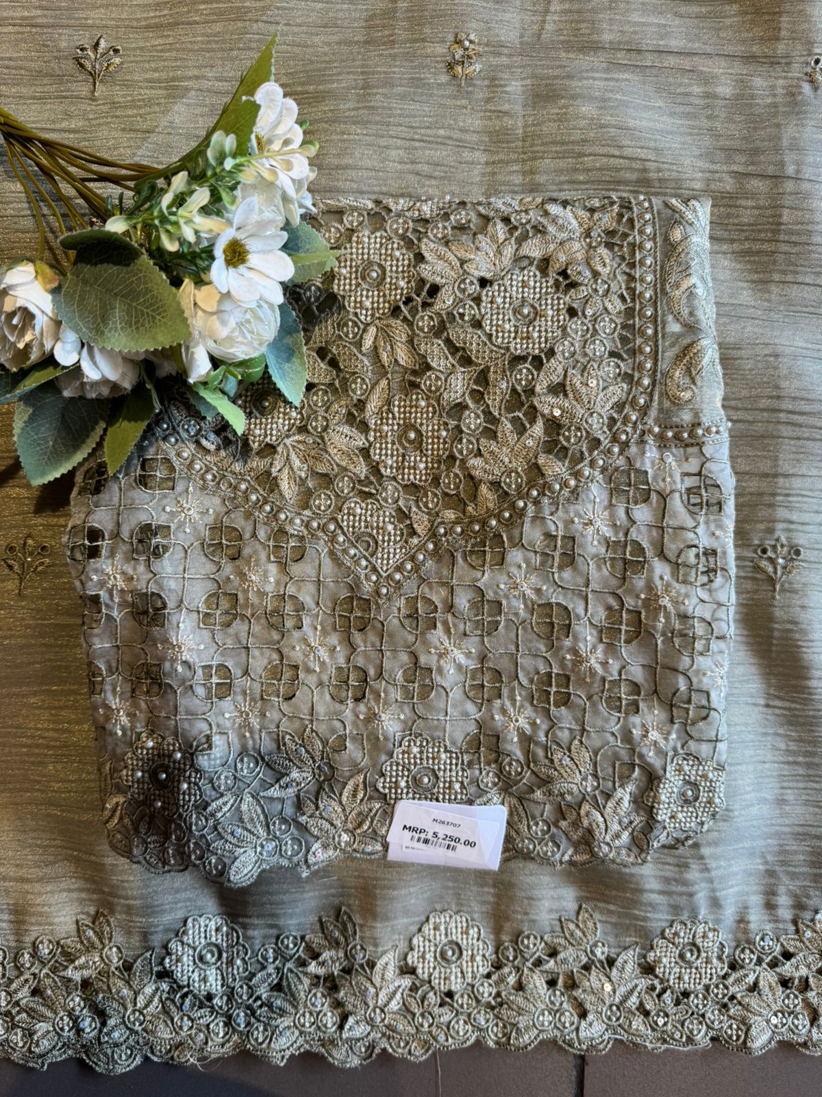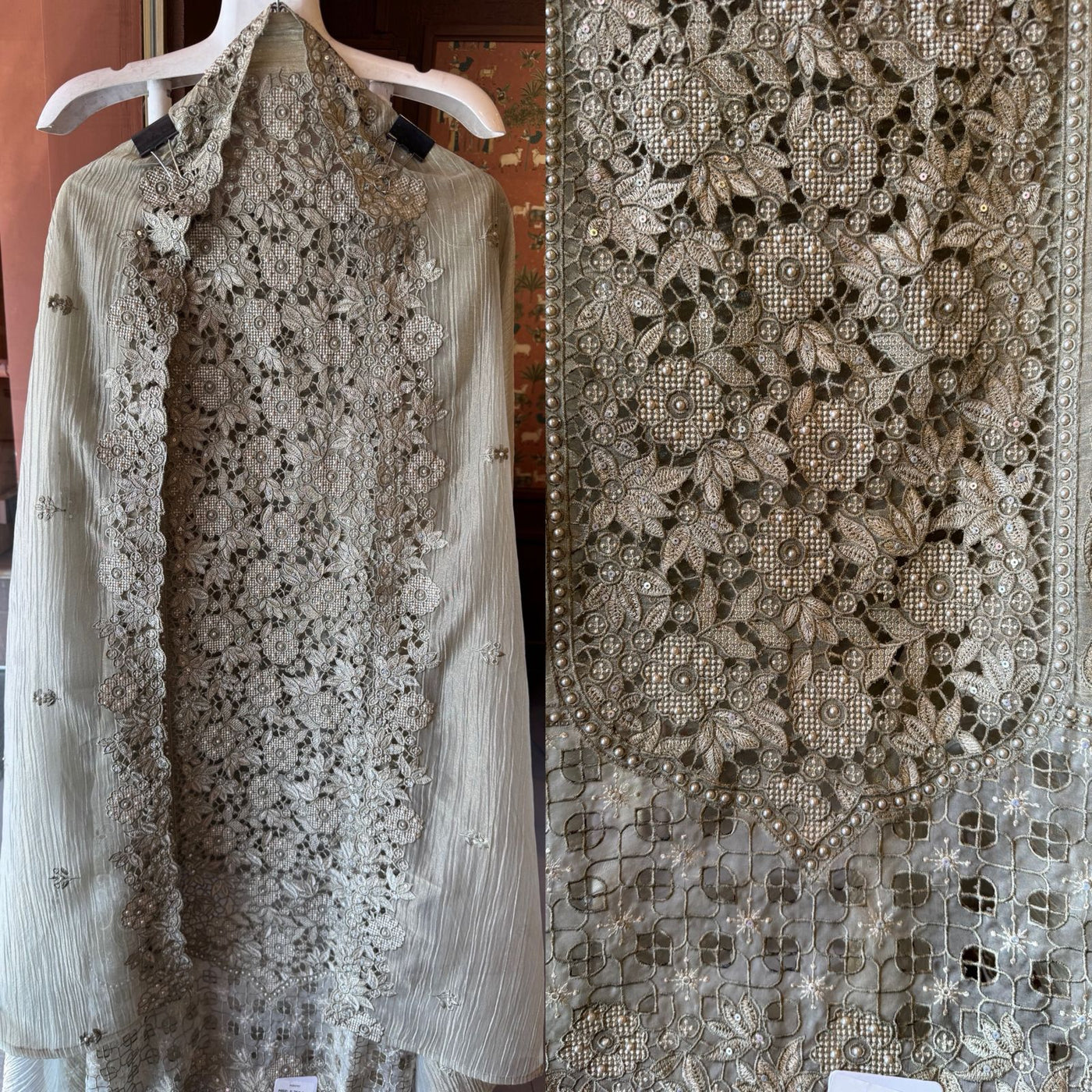 A stunning outfit designed for women who love rich detailing. The kurta showcases heavy thread cutwork embroidery with intricate floral patterns and delicate craftsmanship across the neckline and panel