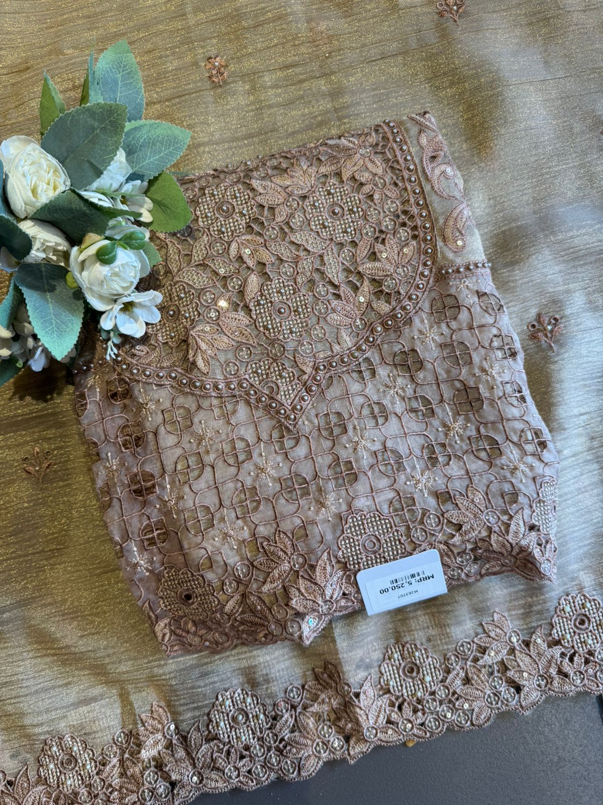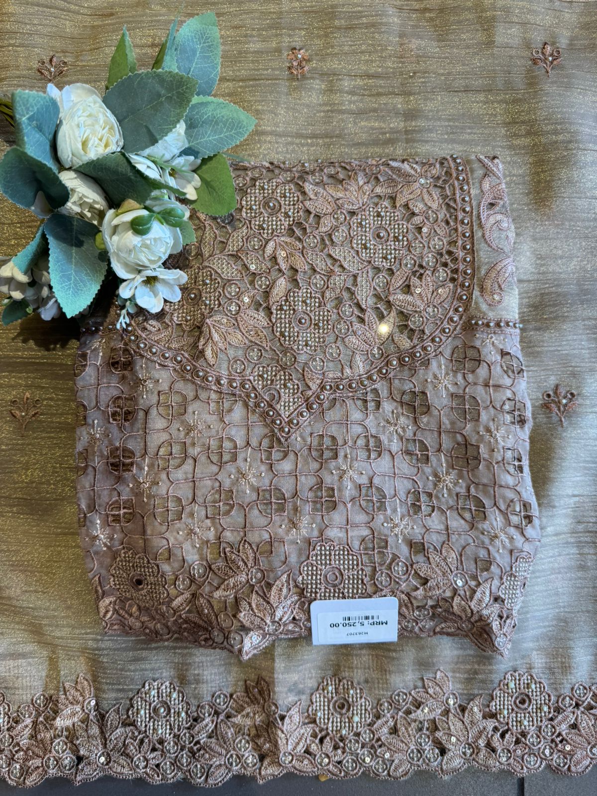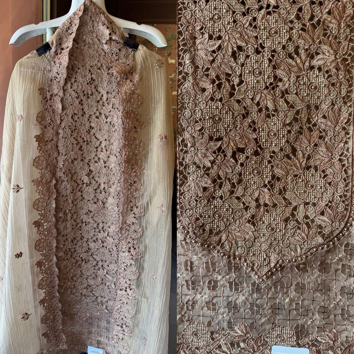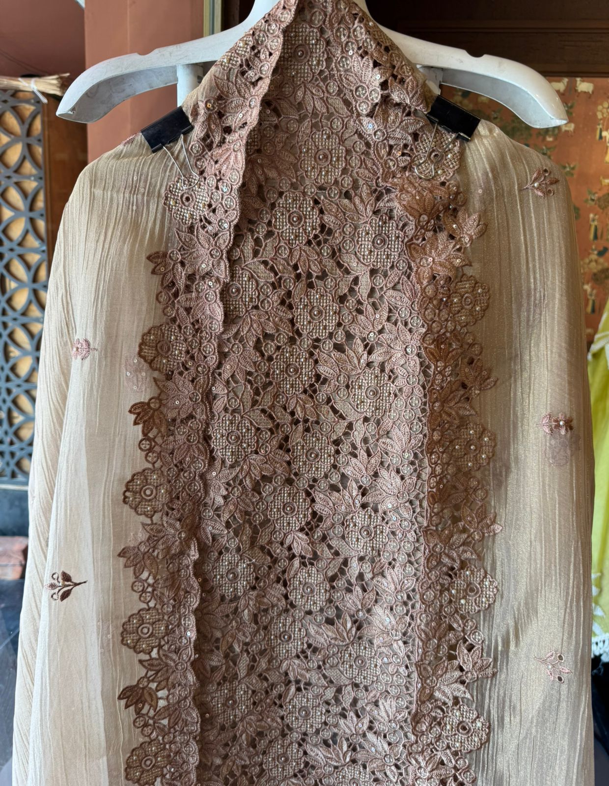 A stunning outfit designed for women who love rich detailing. The kurta showcases heavy thread cutwork embroidery with intricate floral patterns and delicate craftsmanship across the neckline and panel