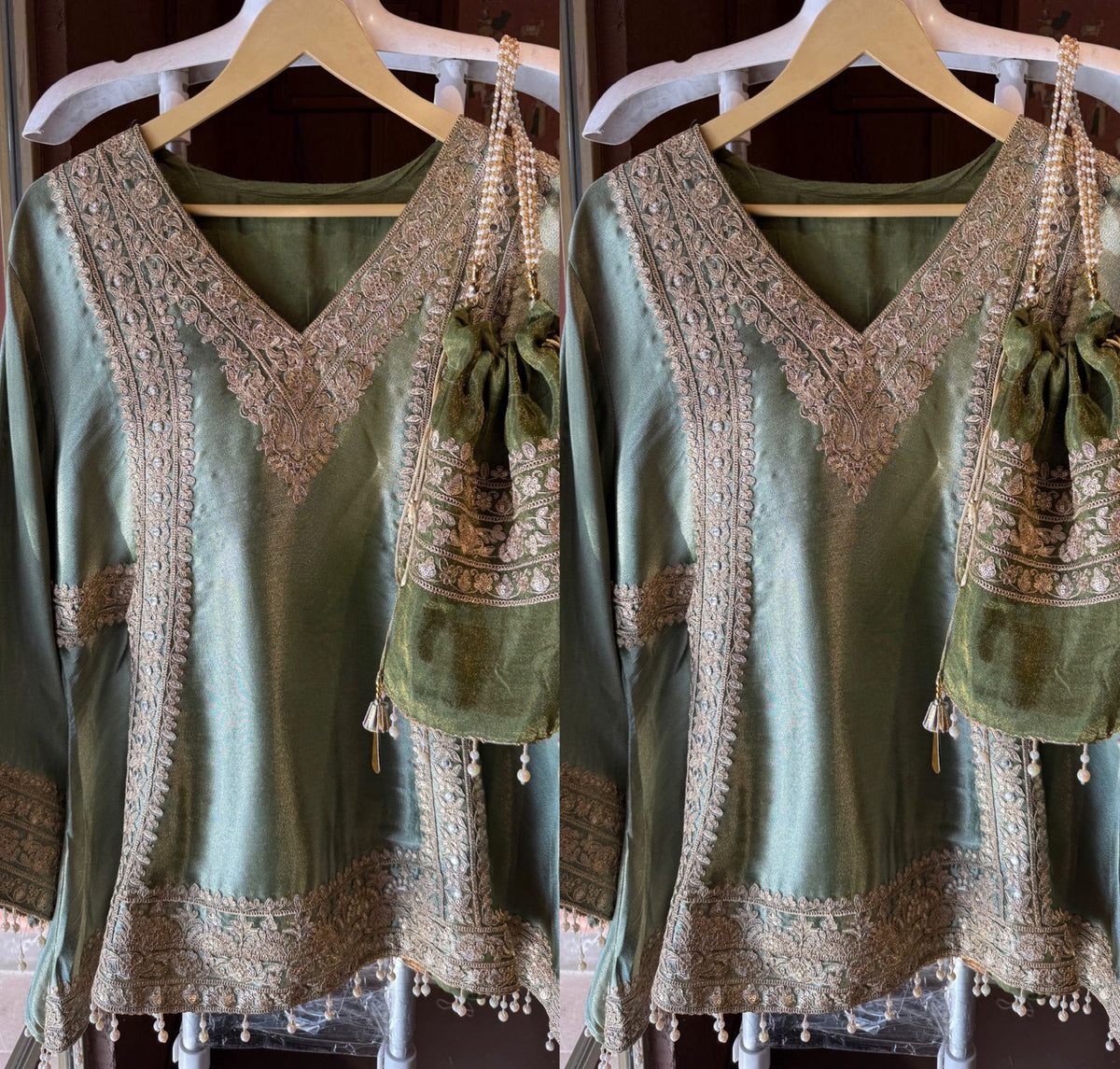 V-neck with heavy Zari embroidery.
