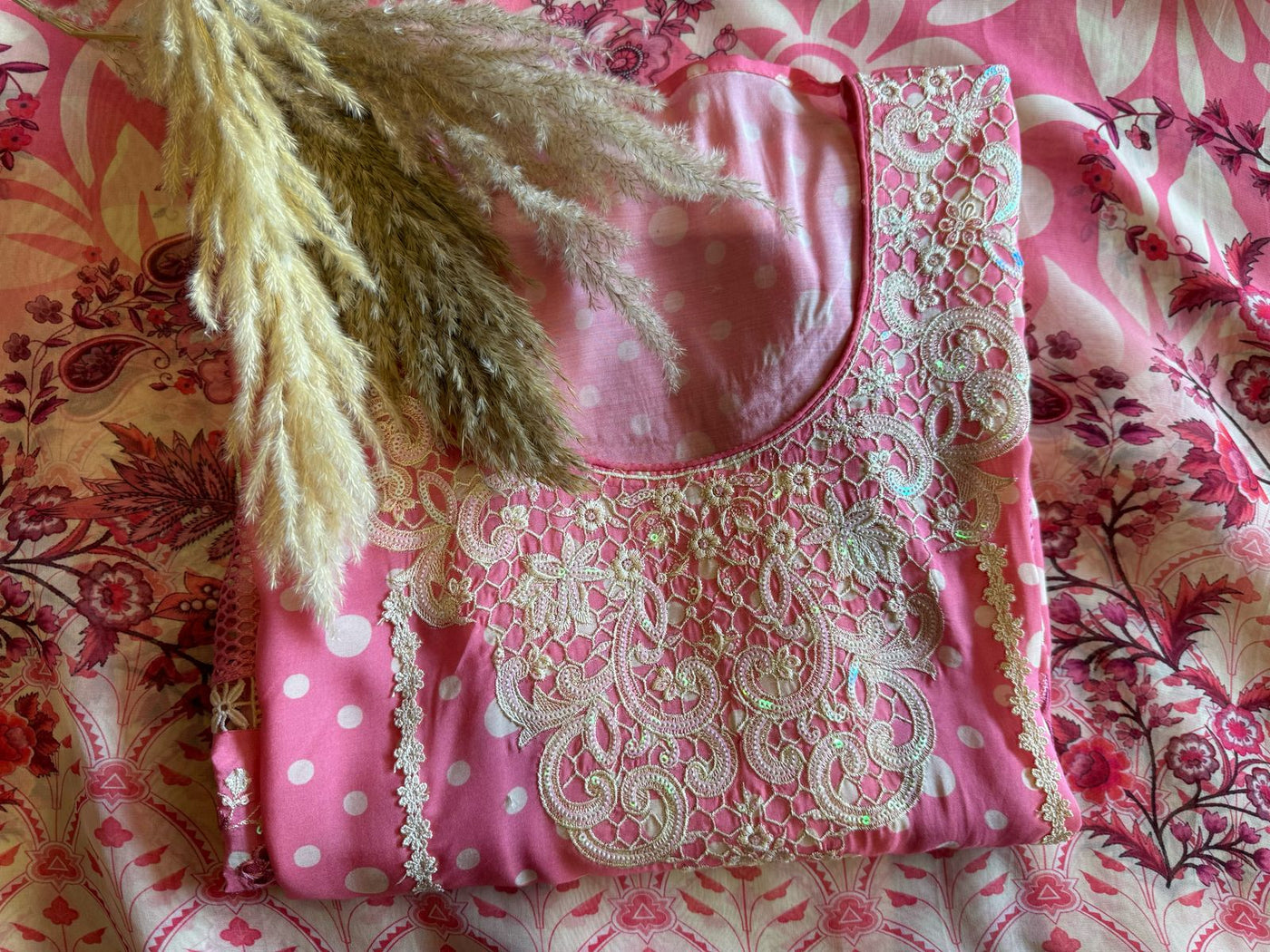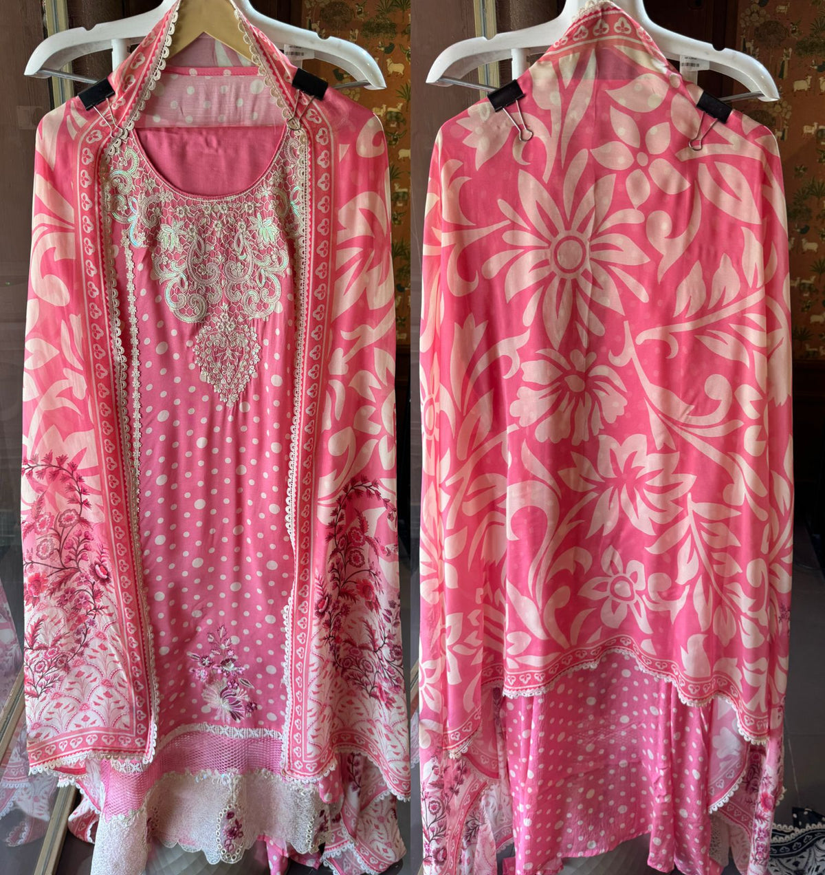 Fine muslin digital printed unstitched shirt design with Cutwork laces used on the neckline with stylish embroidery design.