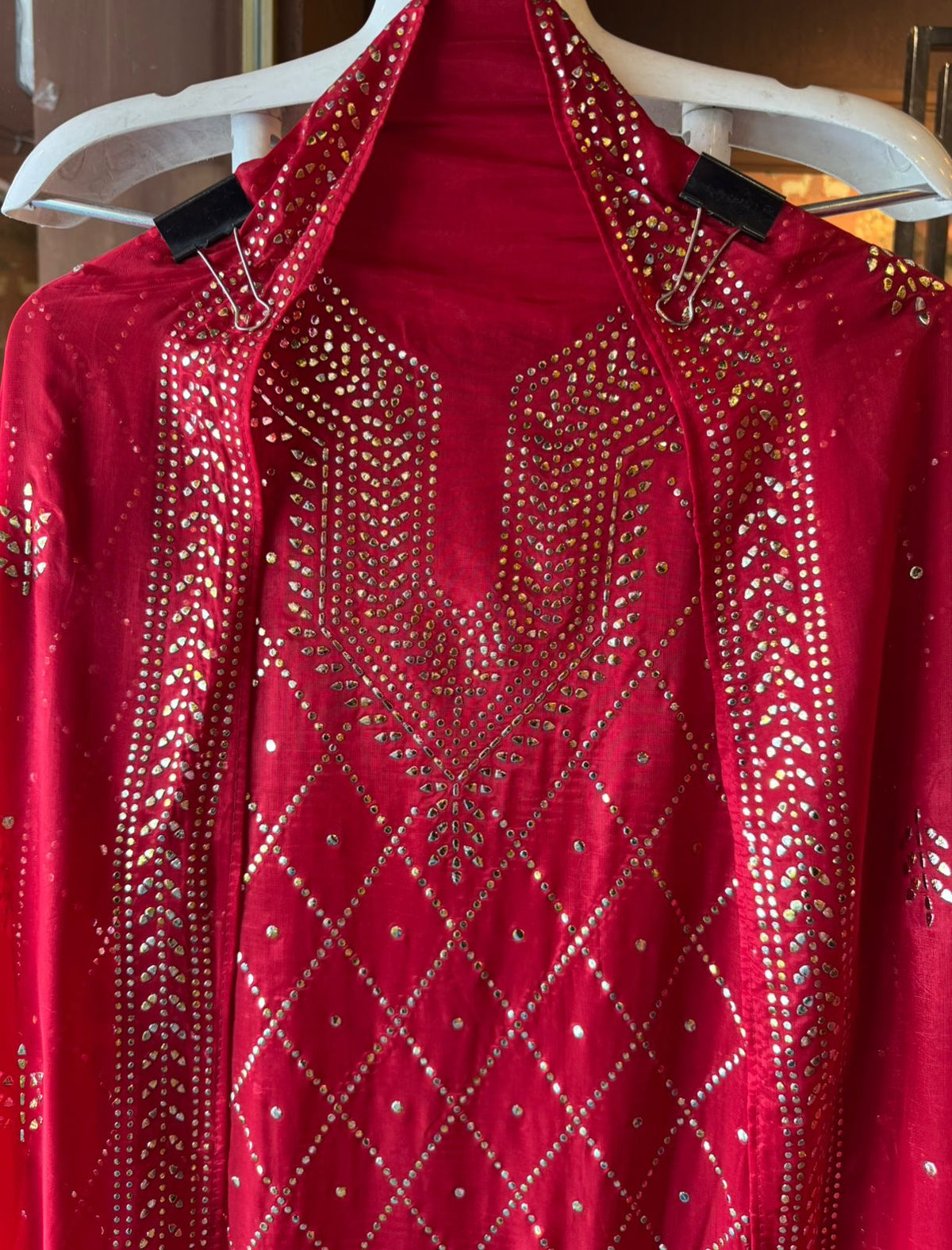 Pure glass tissue dupatta with pitta work detailings all over and on the four sides border.