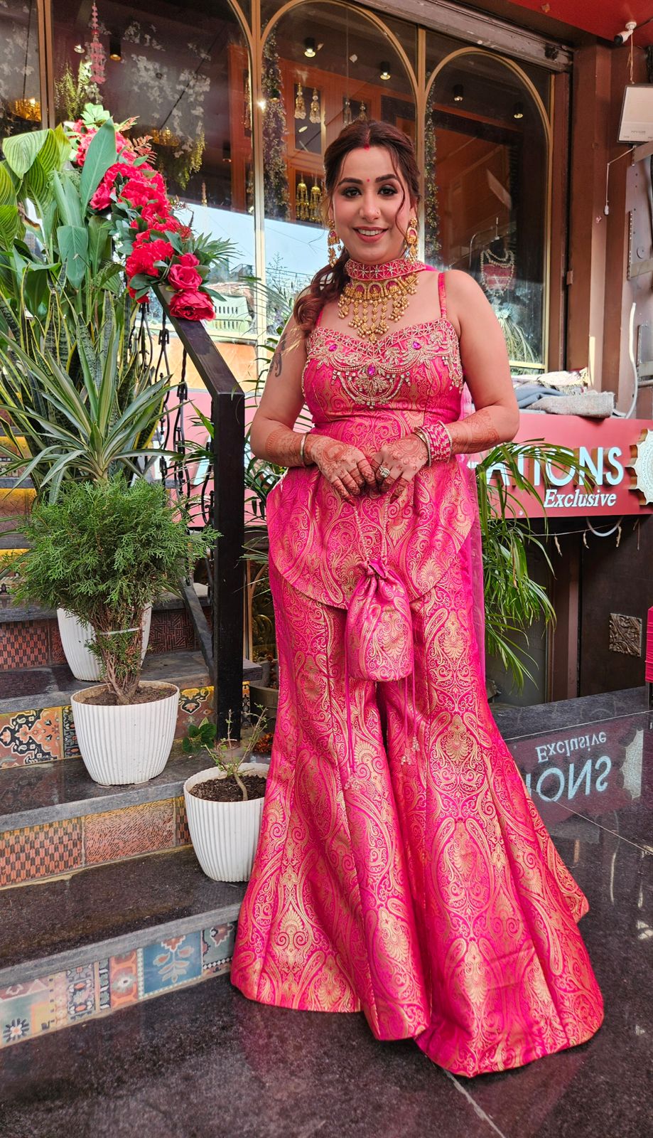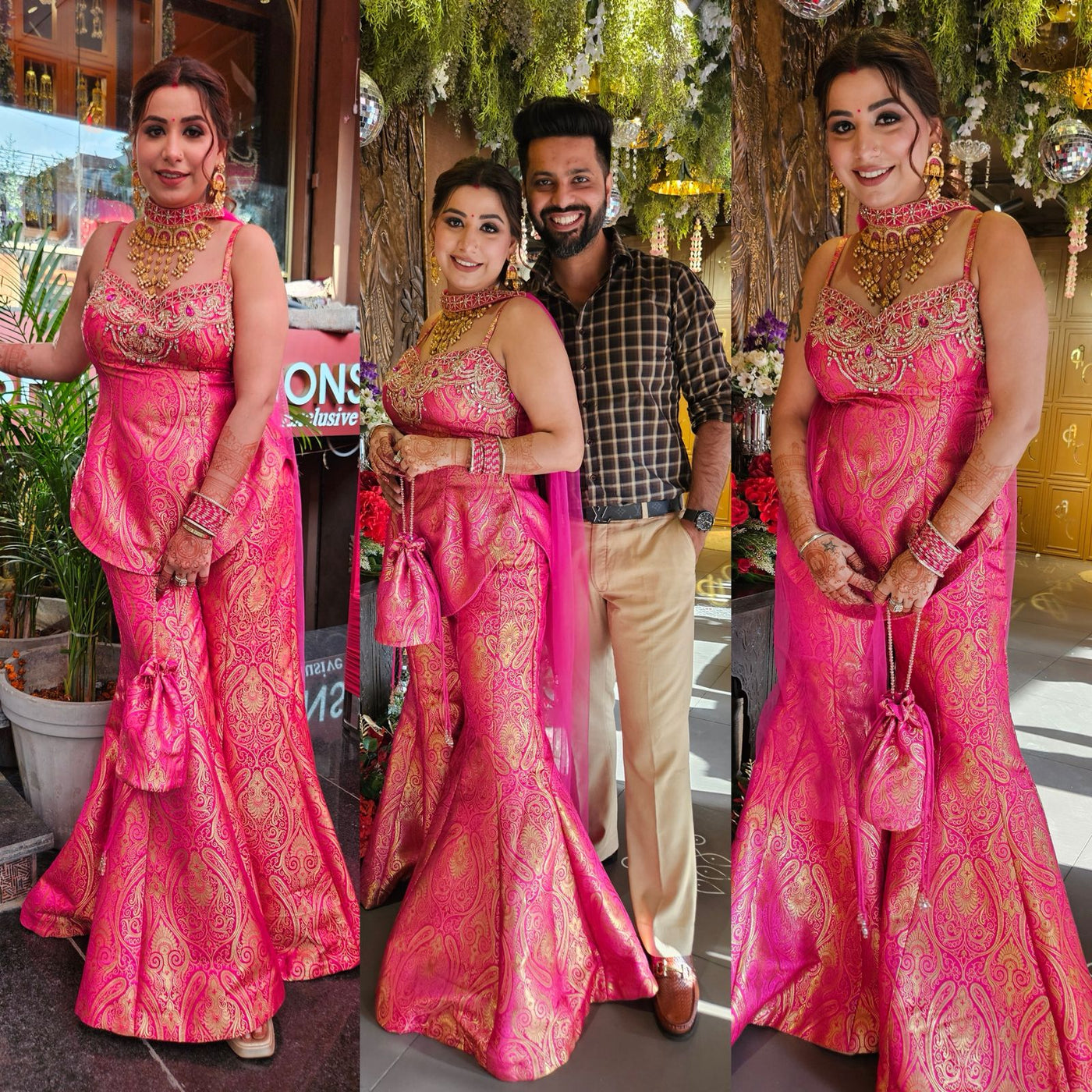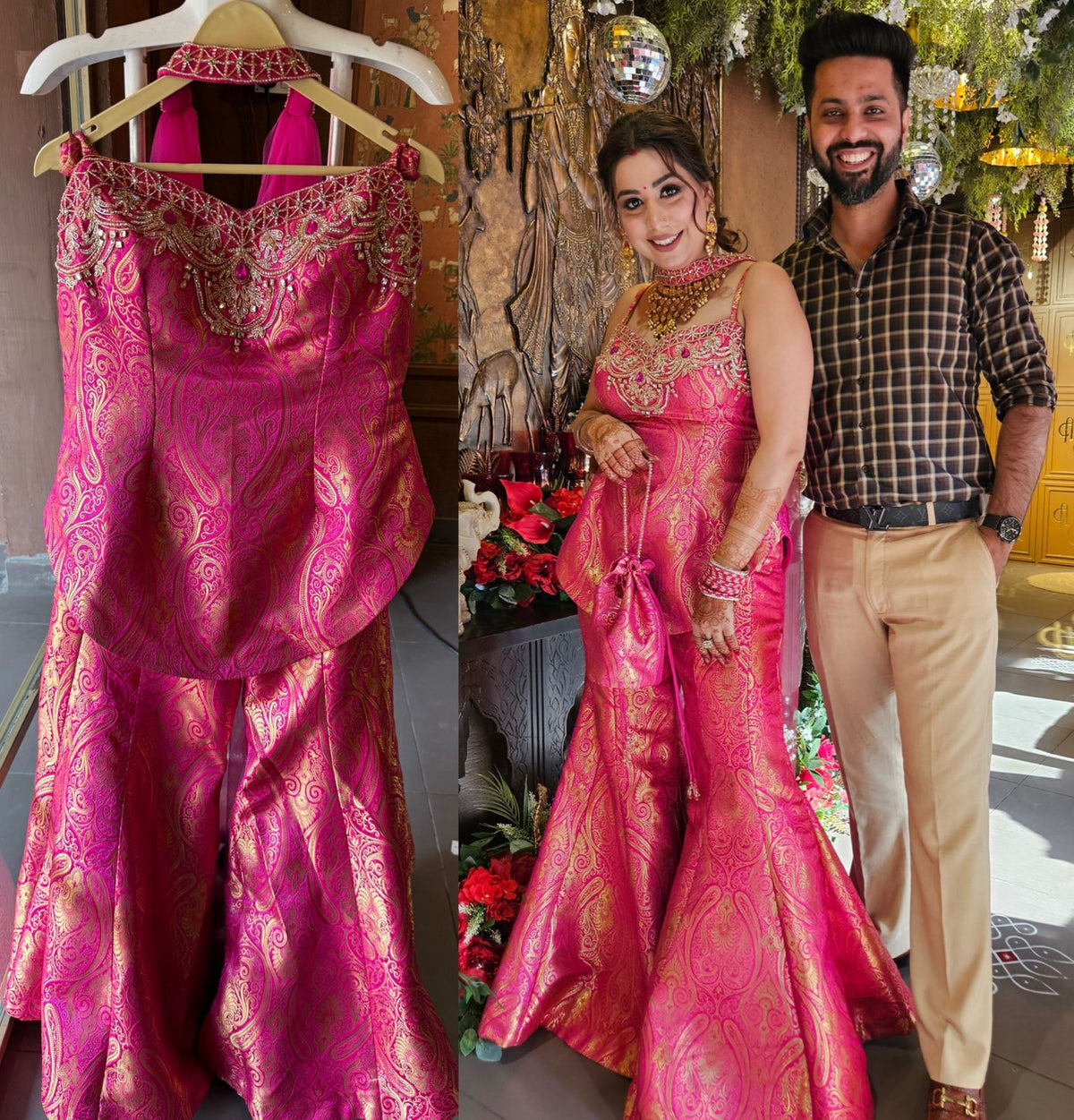 The outfit is a festive Indo-Western ensemble with rich traditional detailing