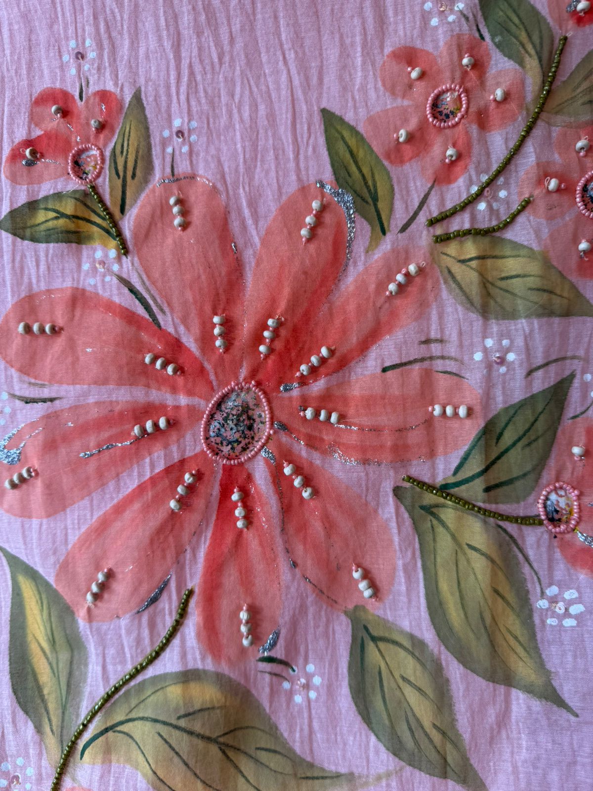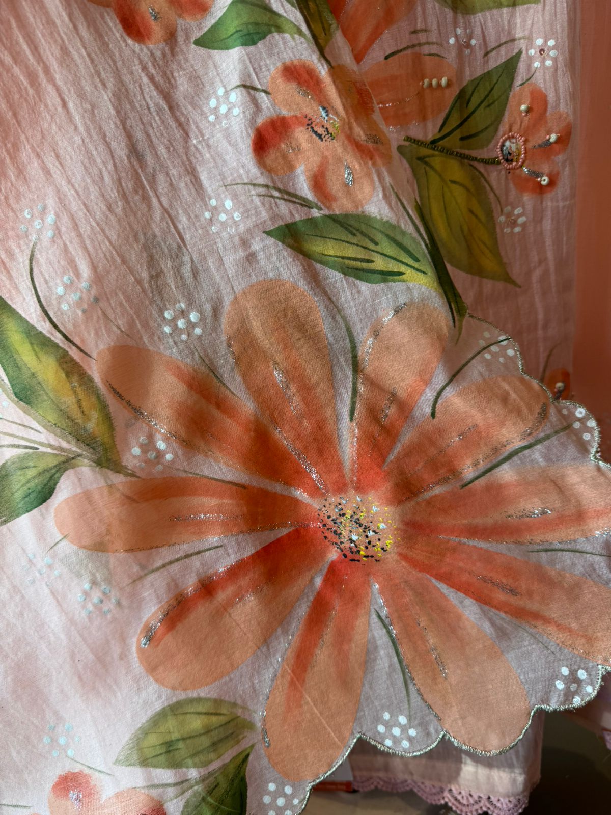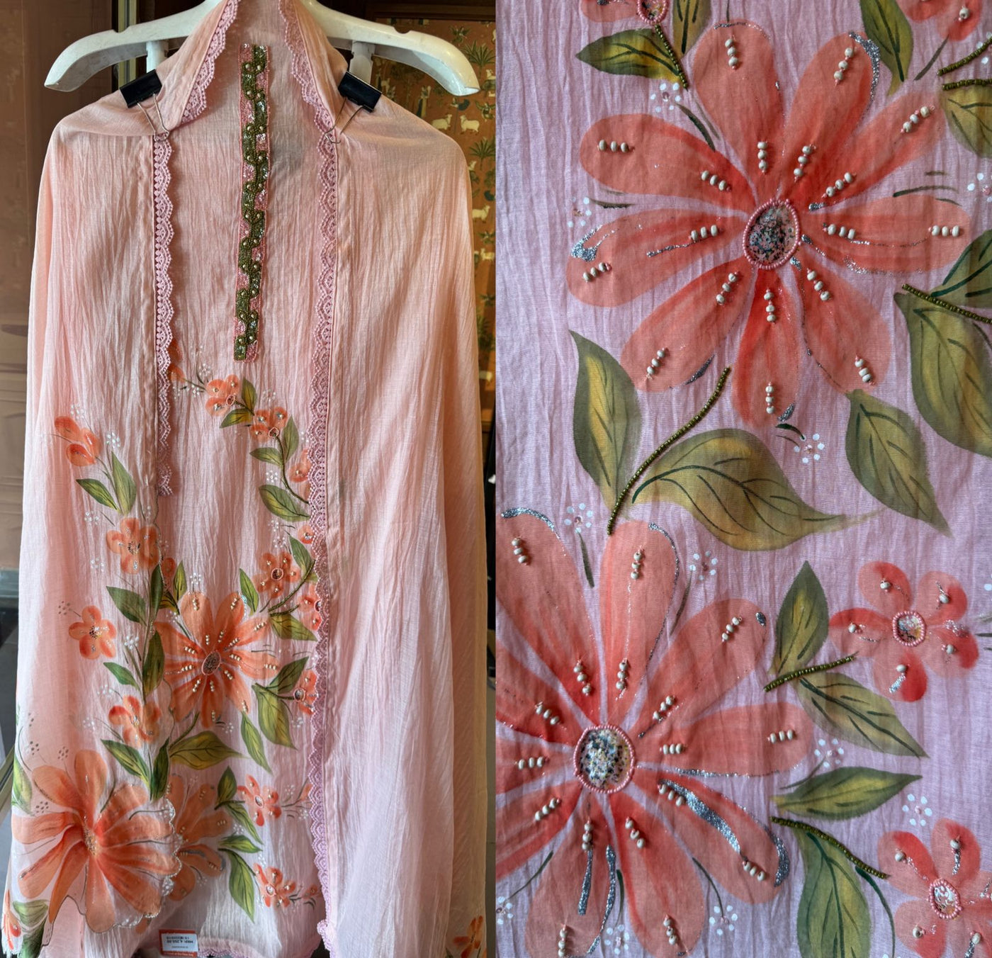 Beautiful hand and brush painted floral artwork on the kurta, enhanced with bead, sequin and subtle shimmer highlights.