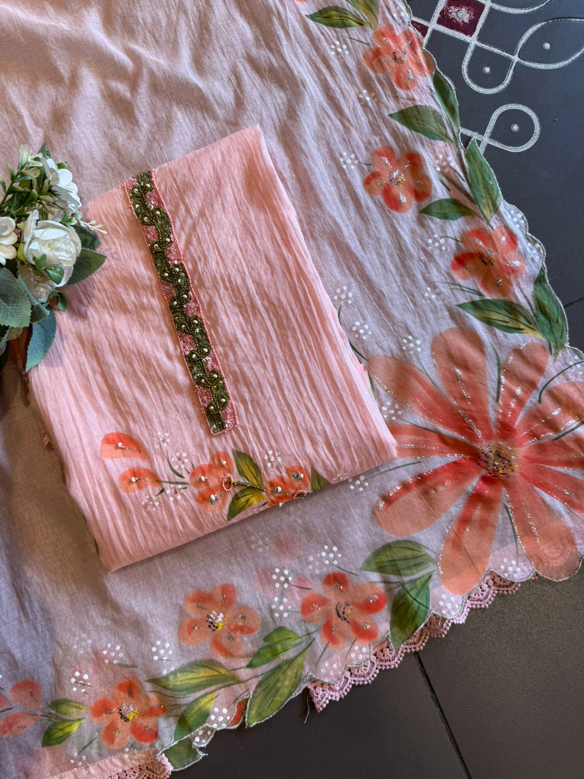 Soft, lightweight Mul chanderi in a soothing pastel shade, breathable and flowy with a graceful drape.