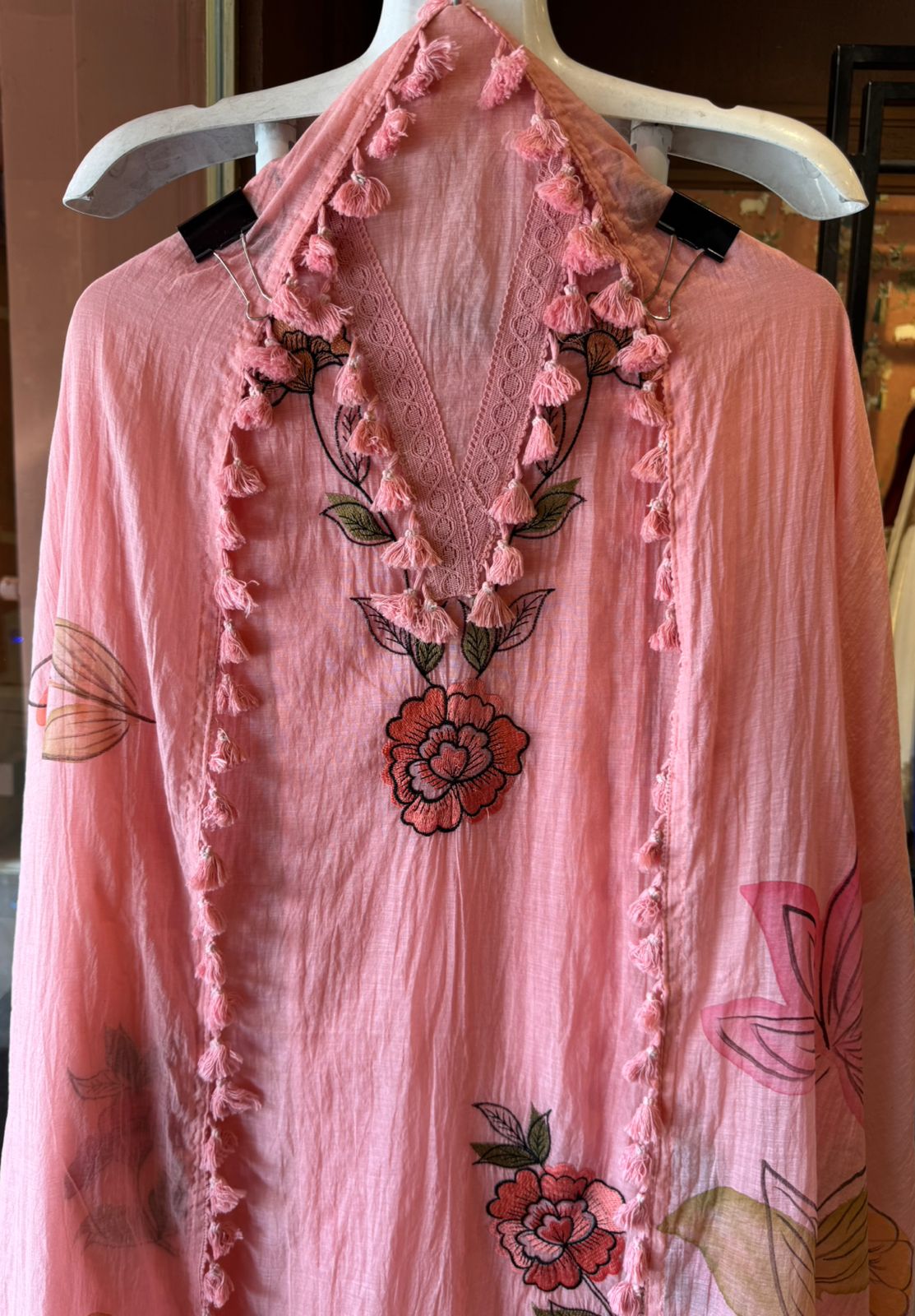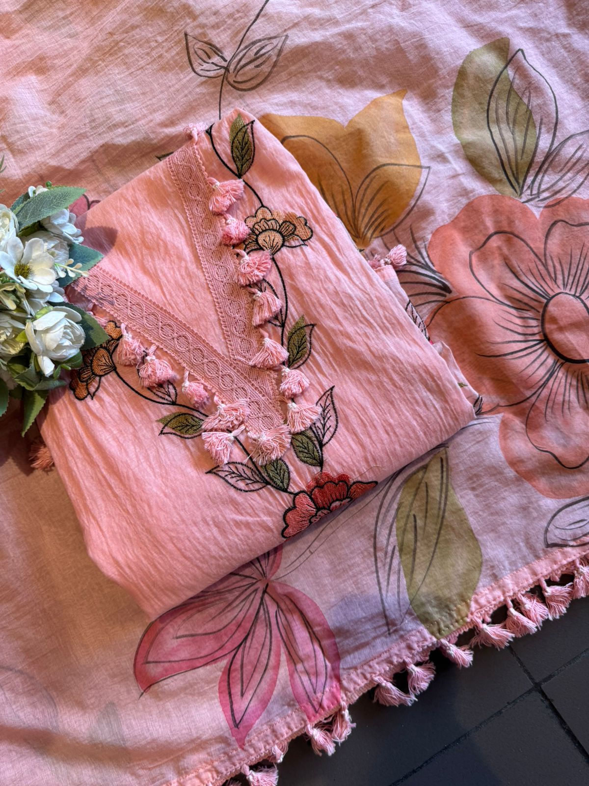 Beautiful thread embroidery floral motif enhanced with handcrafted tassel detailing