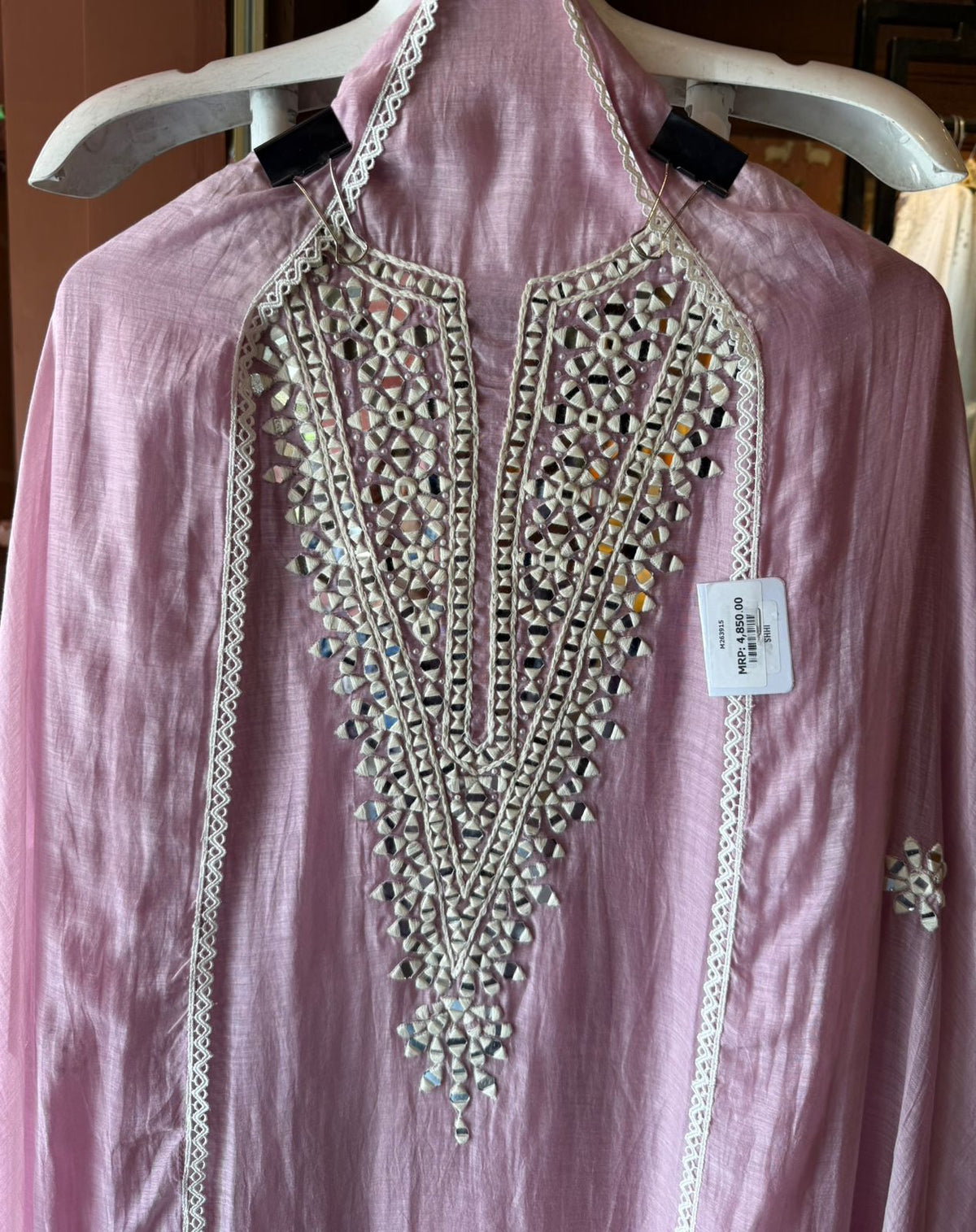 Neckline features Geometric mirror (shisha) work arranged in a triangular pattern.