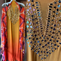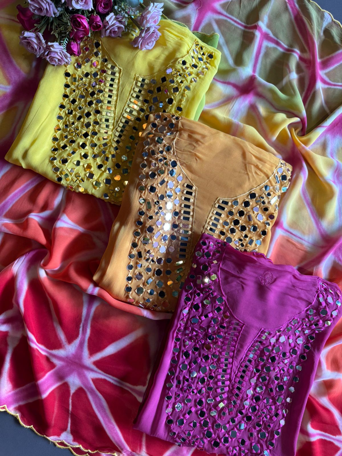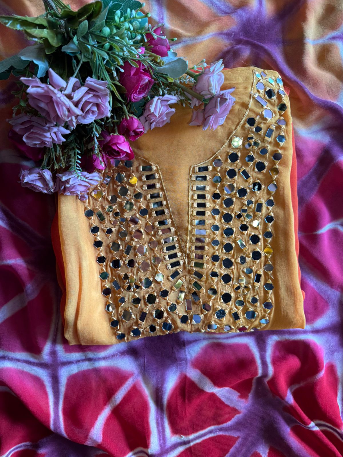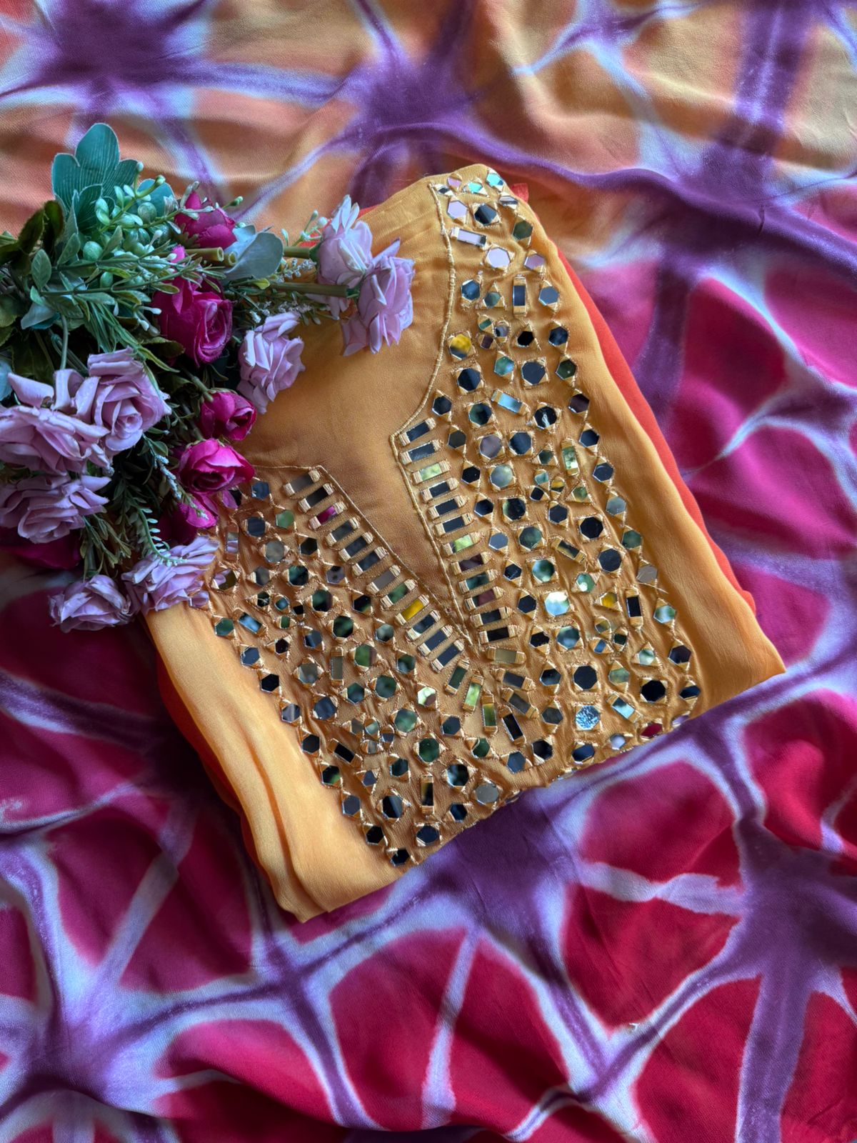 Ombré shaded unstitched shirt on Georgette with beautiful mirror embellished neckline.