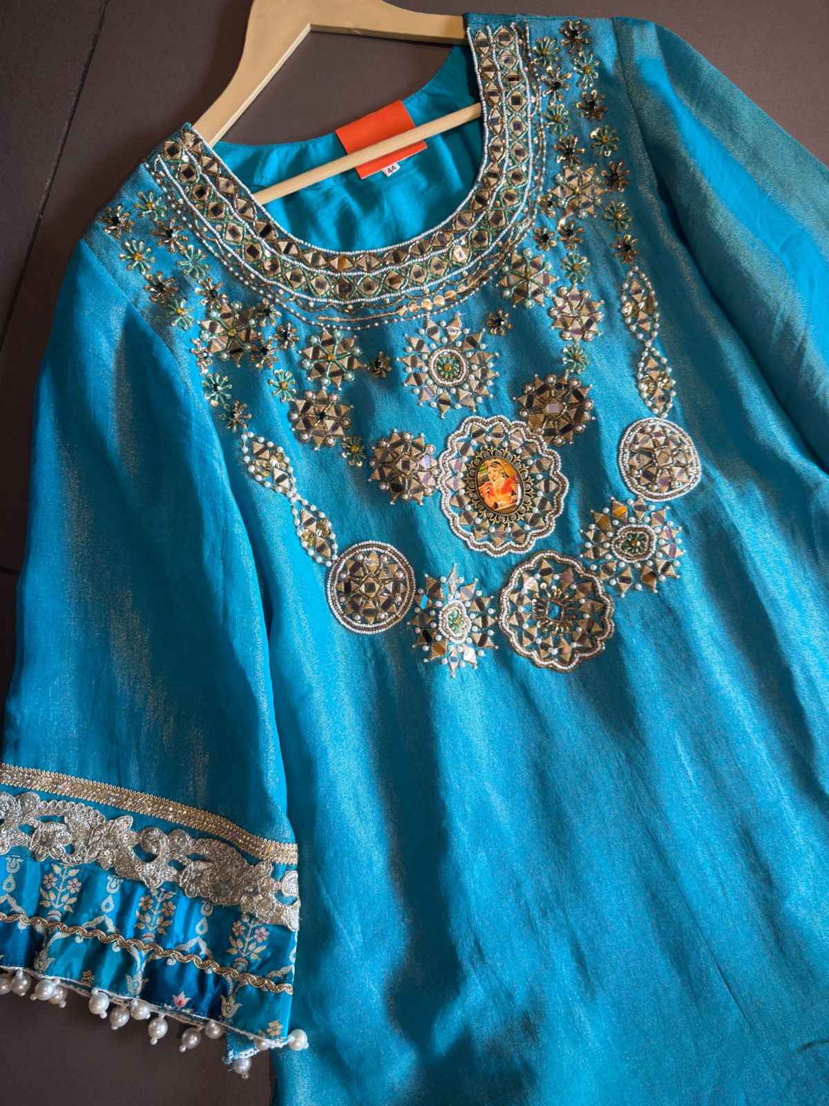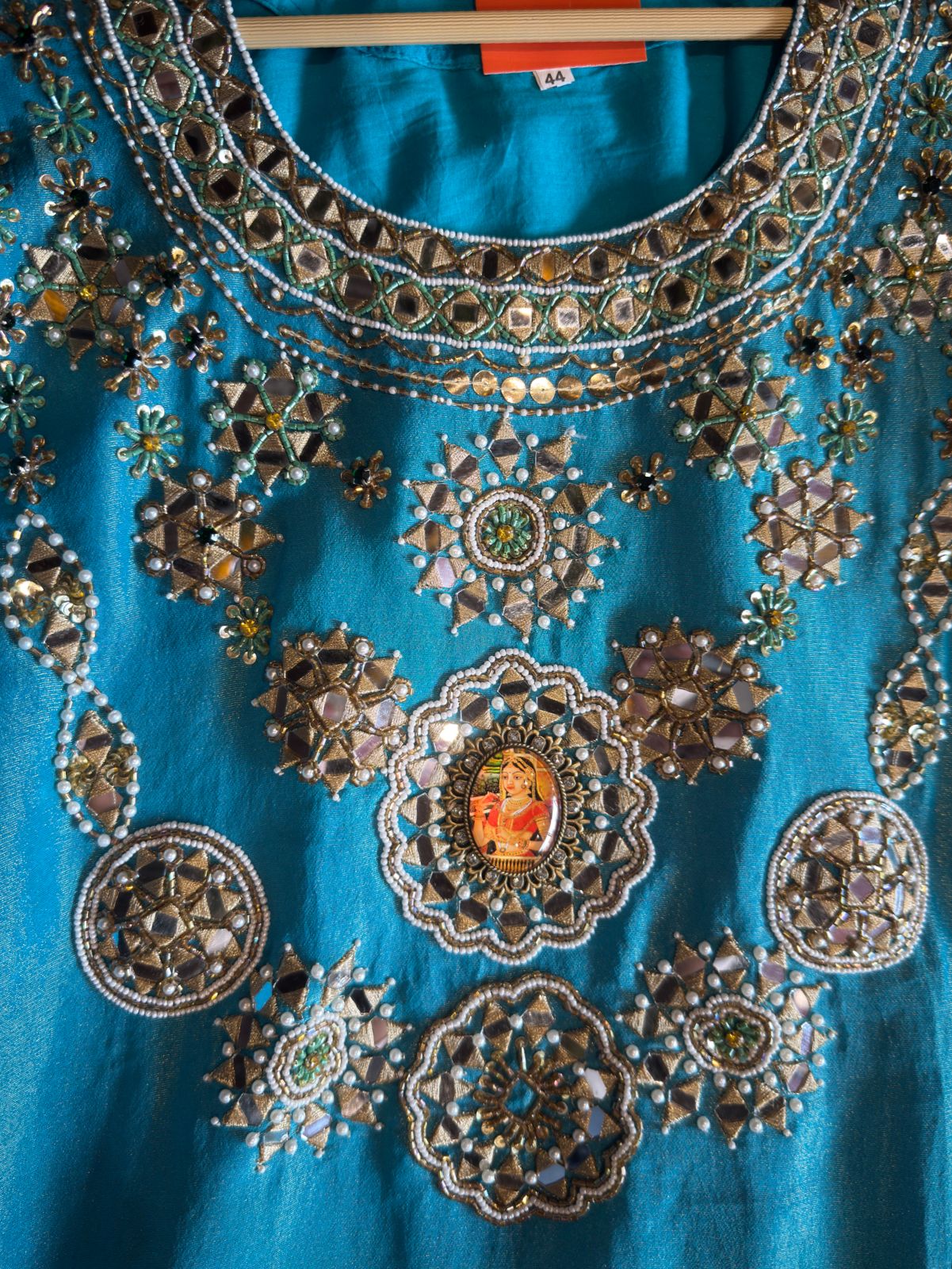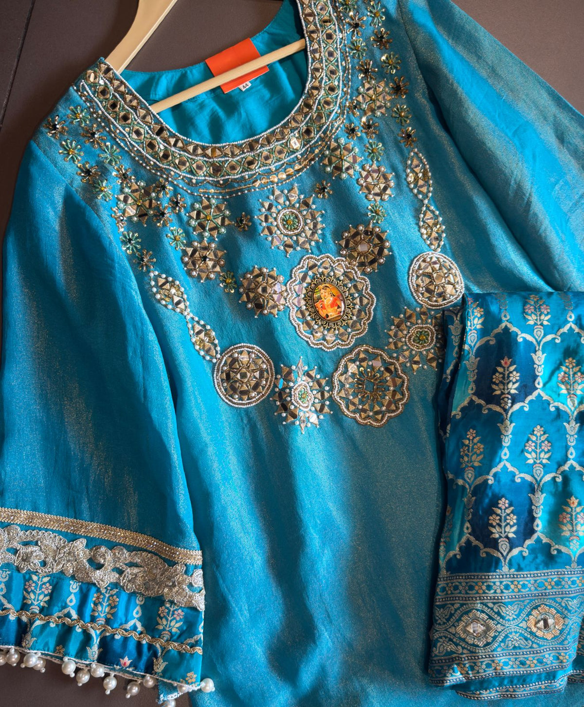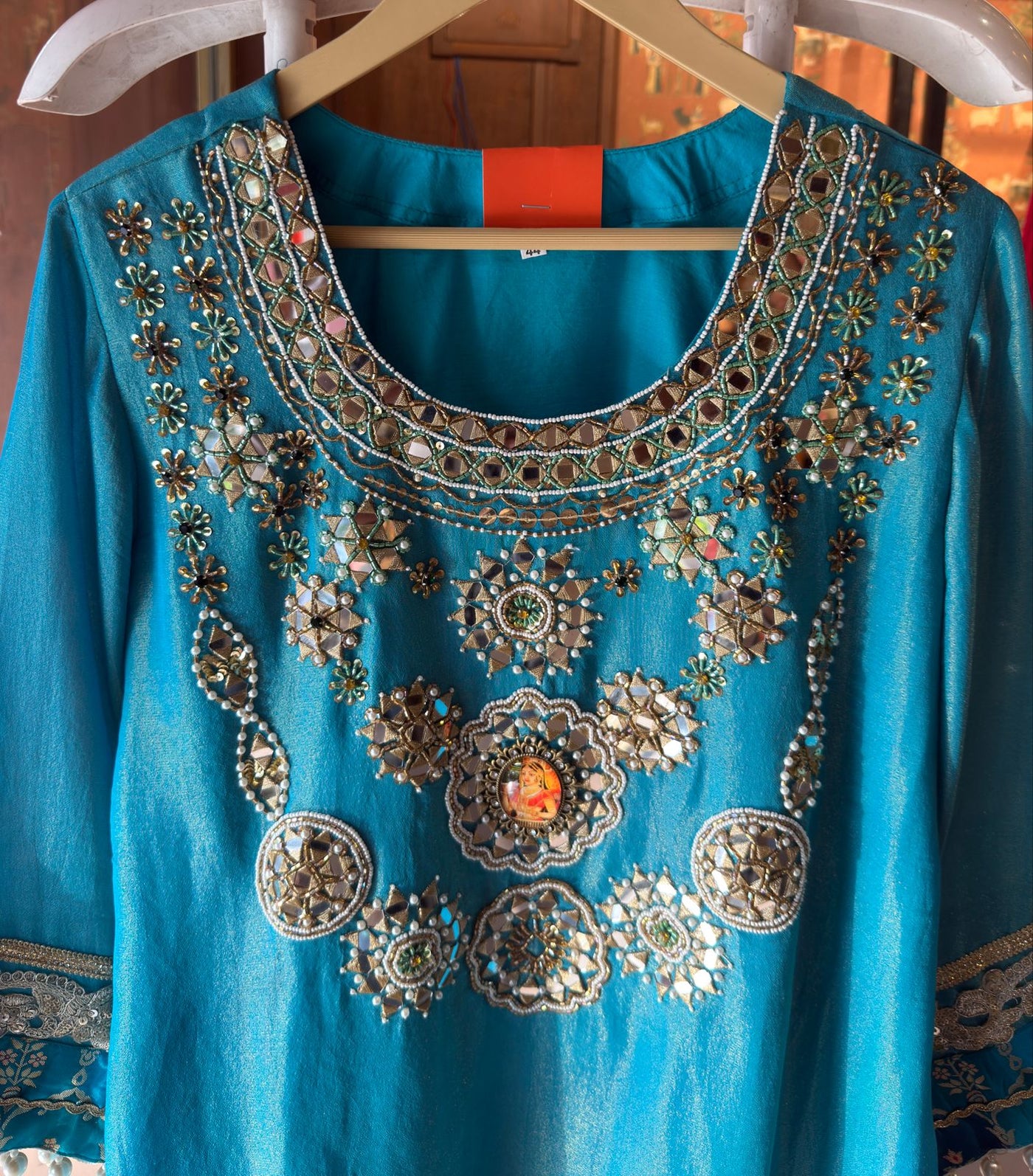 The neckline is beautifully made with mirror’s and Cutdana and Sippi work.