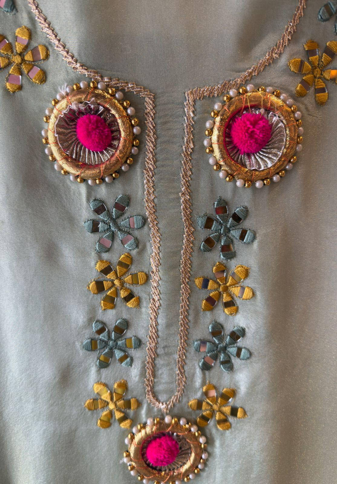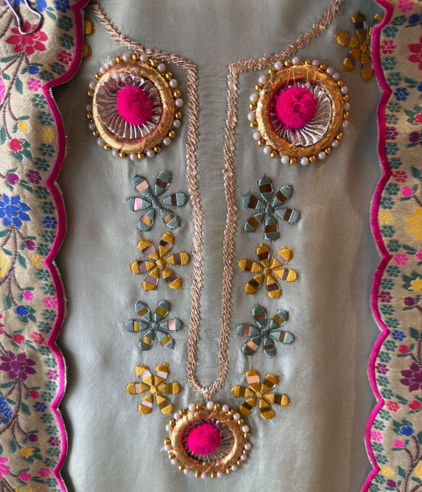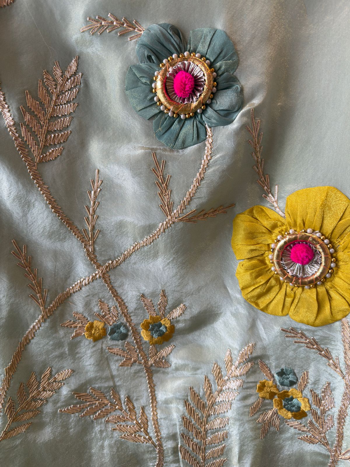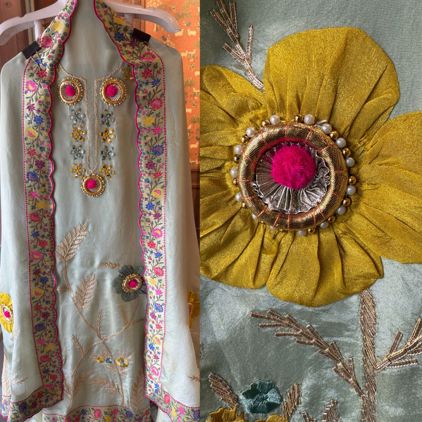 Use of beadwork, Ribbons, Ring Gotta, sequins, and mirror accents in circular floral patterns.