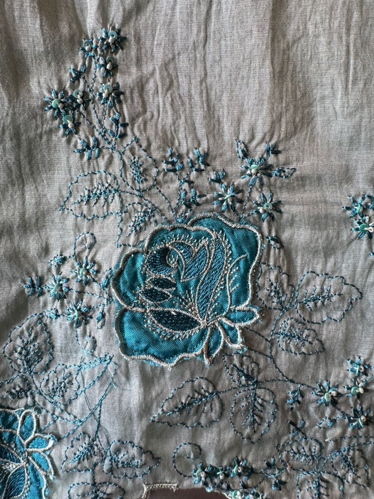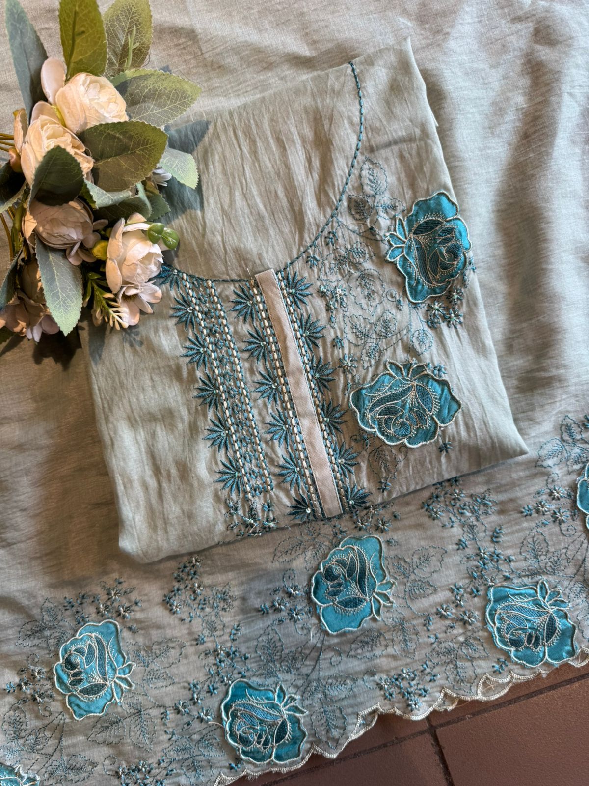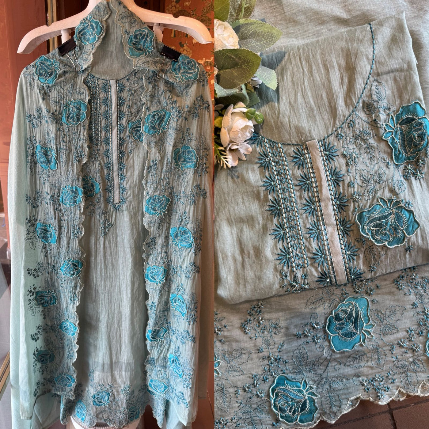 Beautiful thread embroidery throughout the kurta with raised 3D floral appliqué work, creating depth and texture.