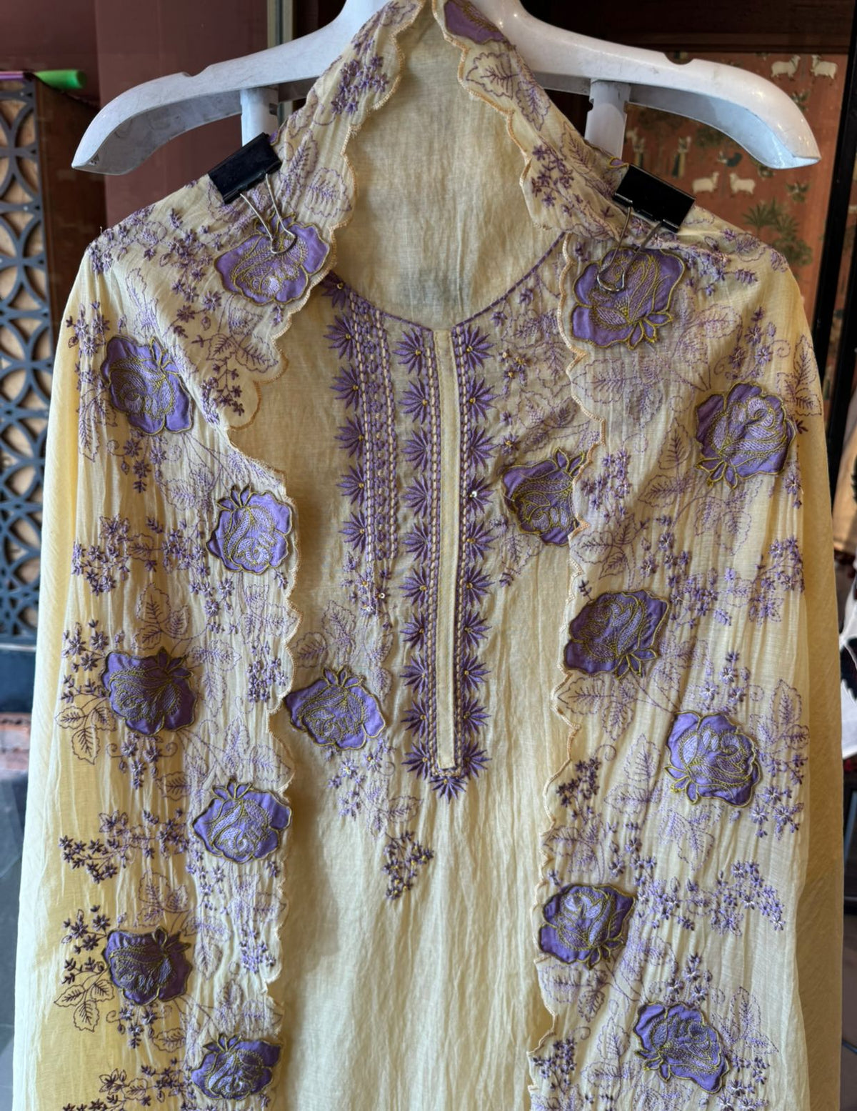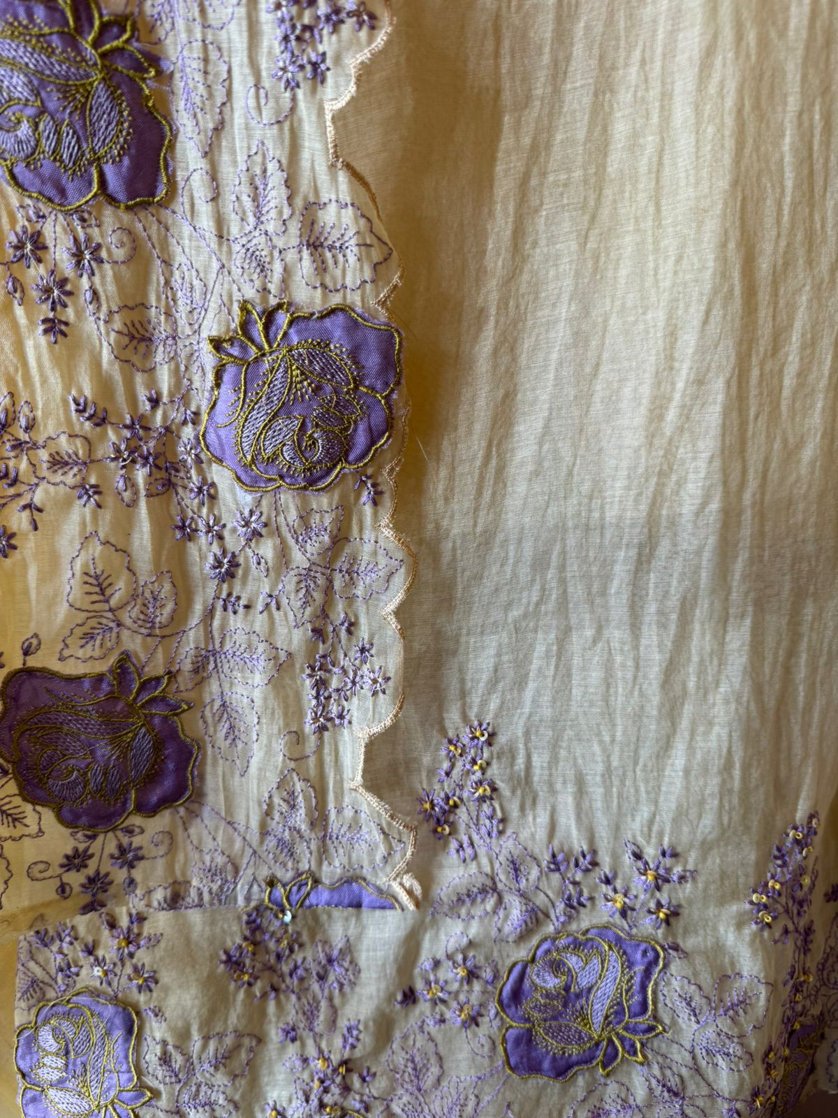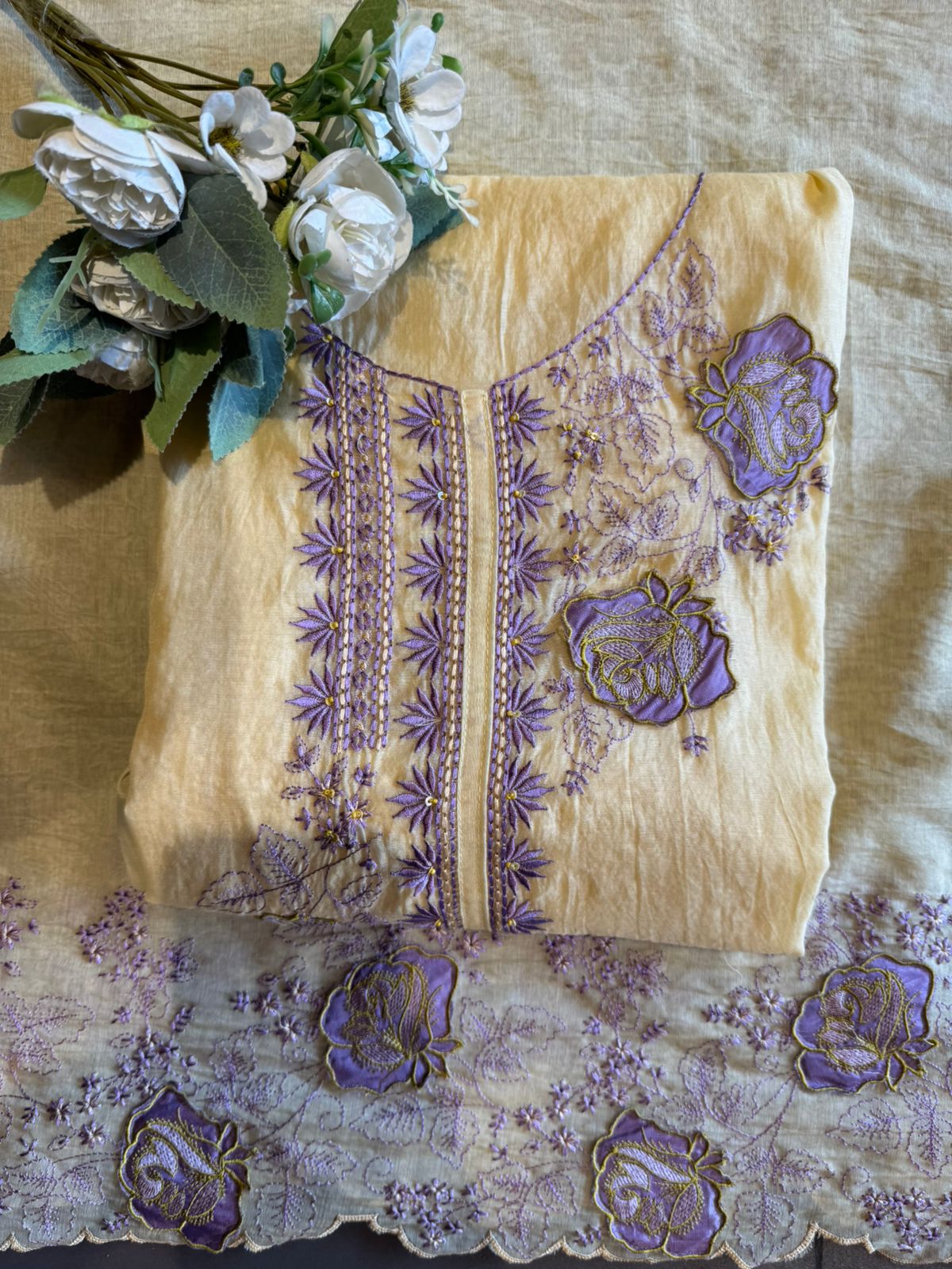 Beautiful thread embroidery throughout the kurta with raised 3D floral appliqué work, creating depth and texture.