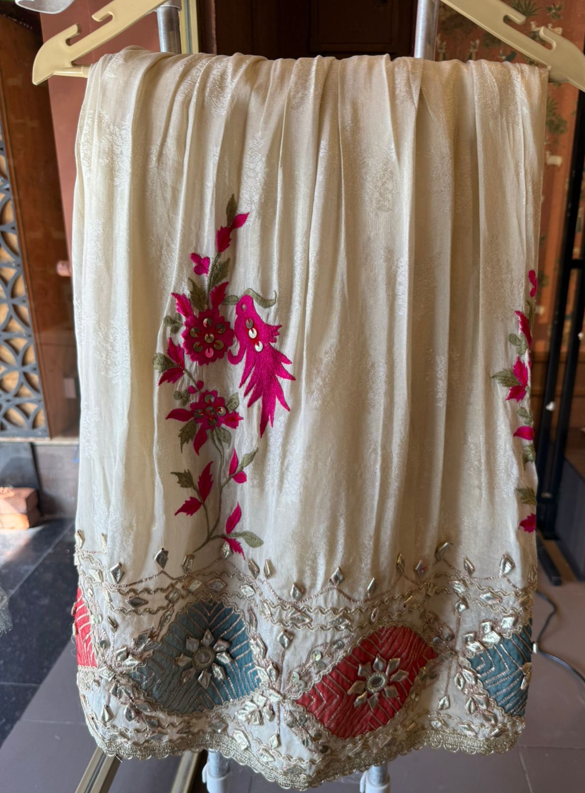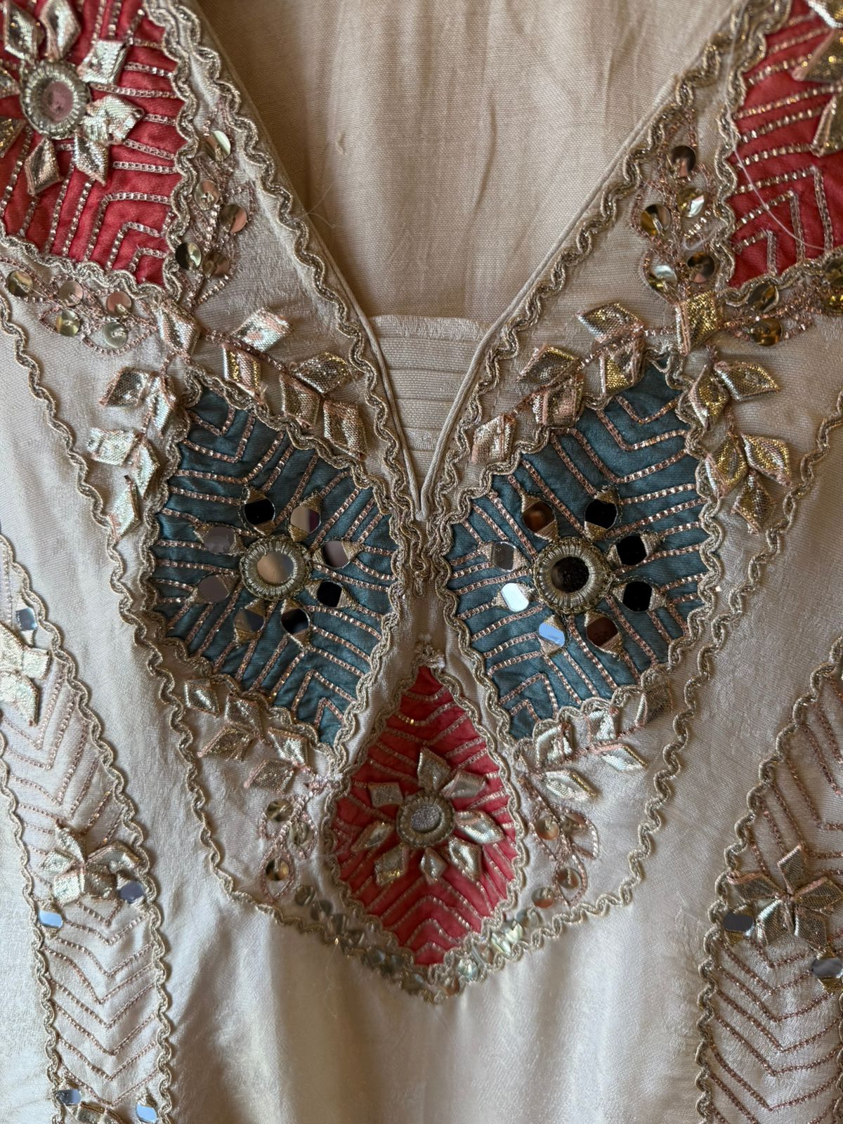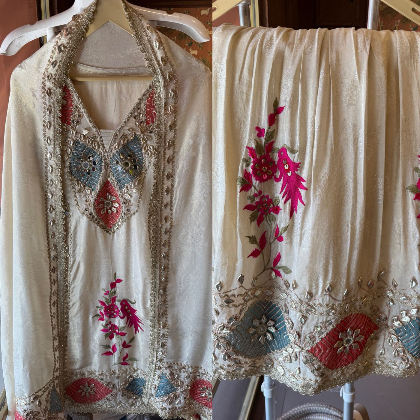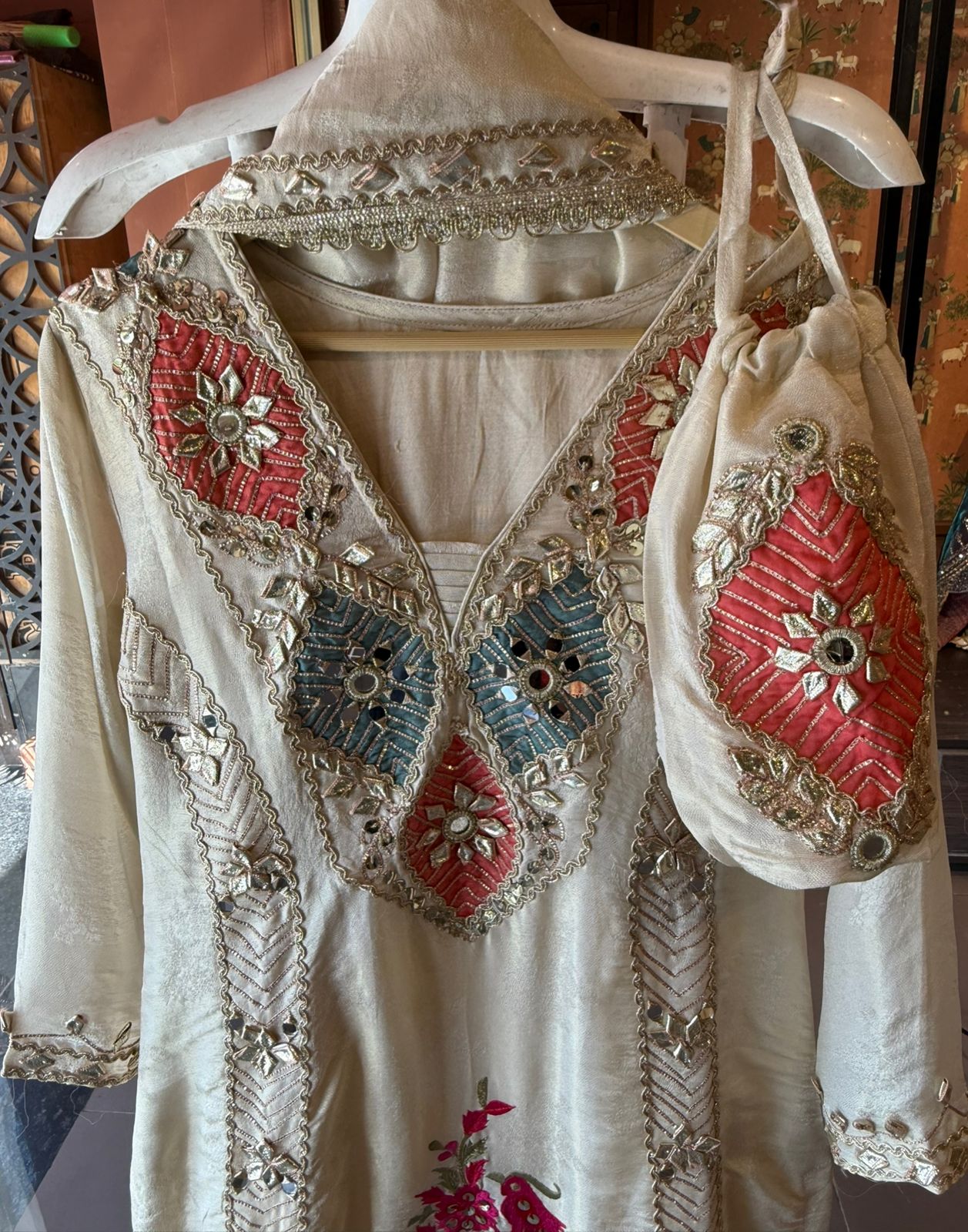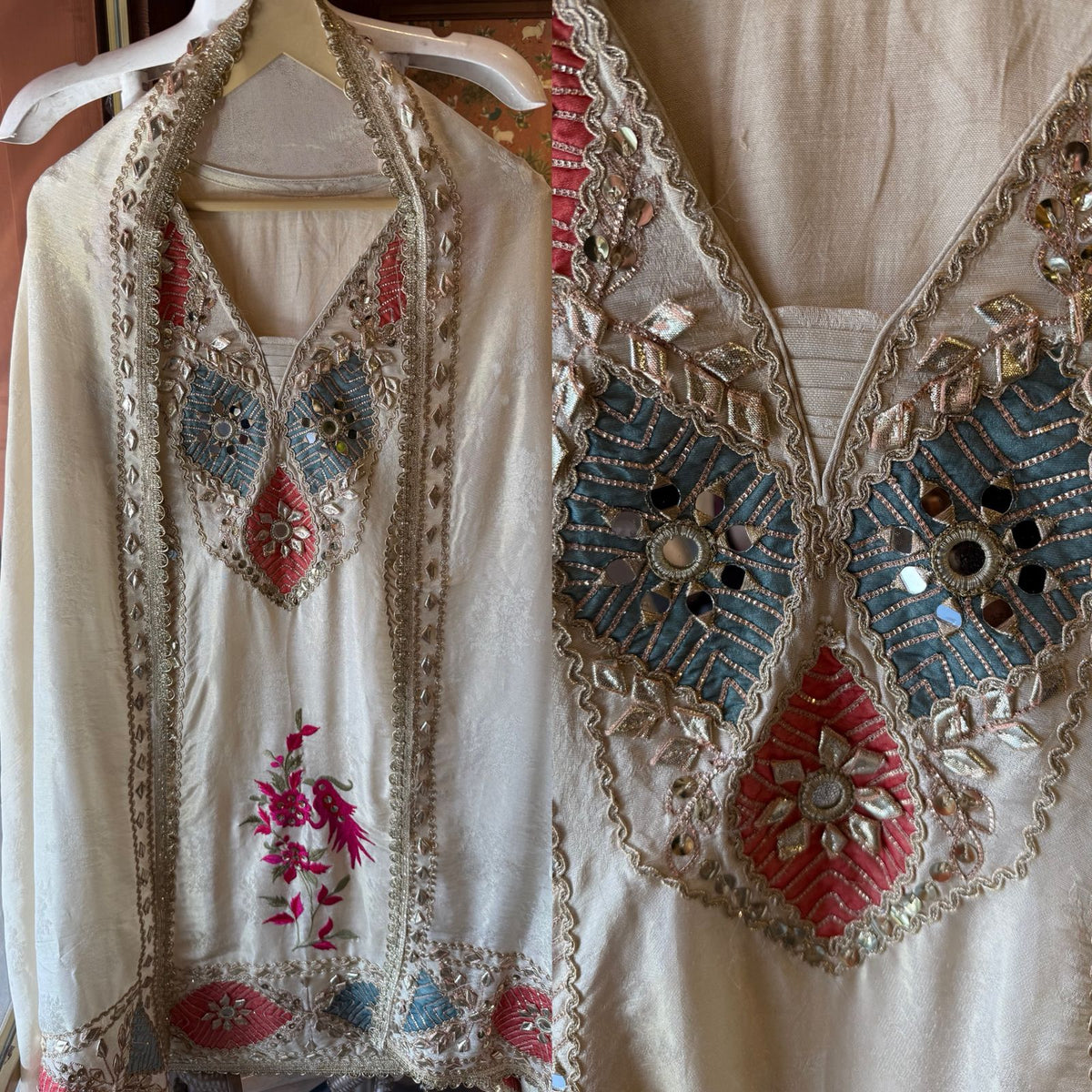 Work: Rich handcrafted embroidery with resham thread, zari & mirror detailing