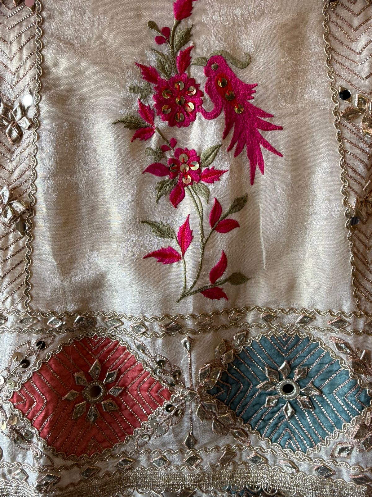 Paired up with Stitched sharara’s with Beautiful hand-embroidered bird & floral motif adding an artistic, heritage touch